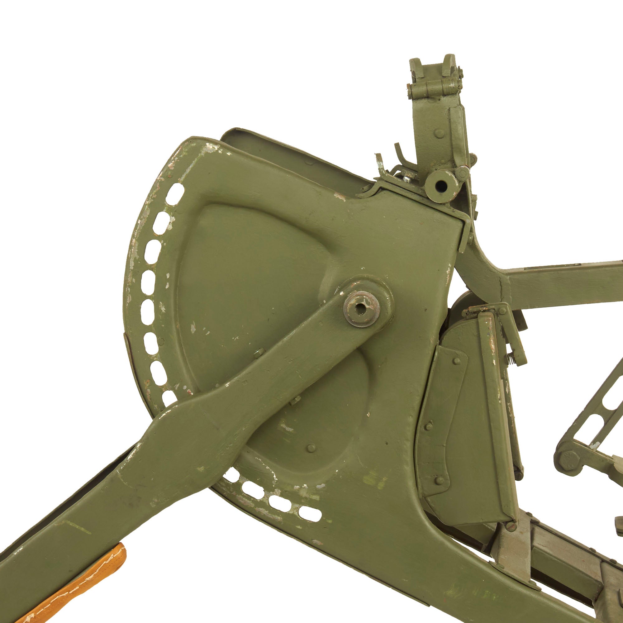 The feed system used non-disintegrating belts, made from cloth or tarpaulin, with metallic struts. Feed was from the right side only; feed system was operated through the horizontally pivoting pin / levers system by recoiling barrel group.