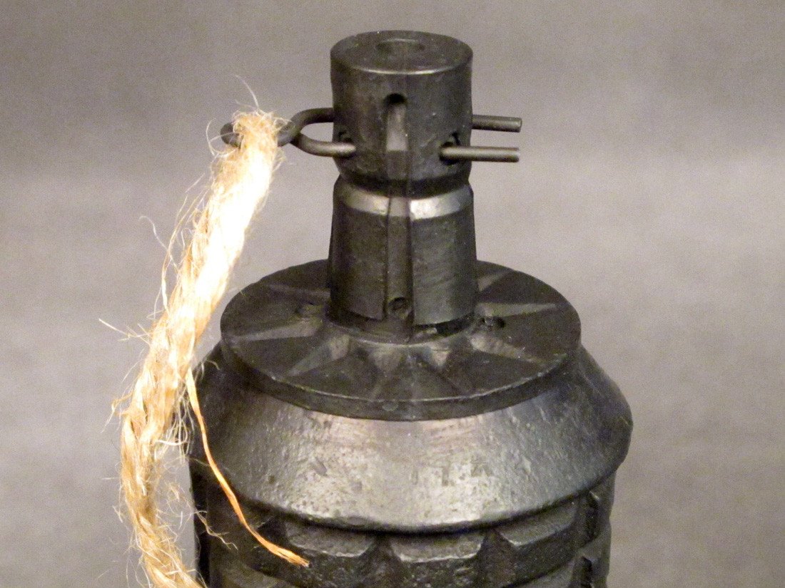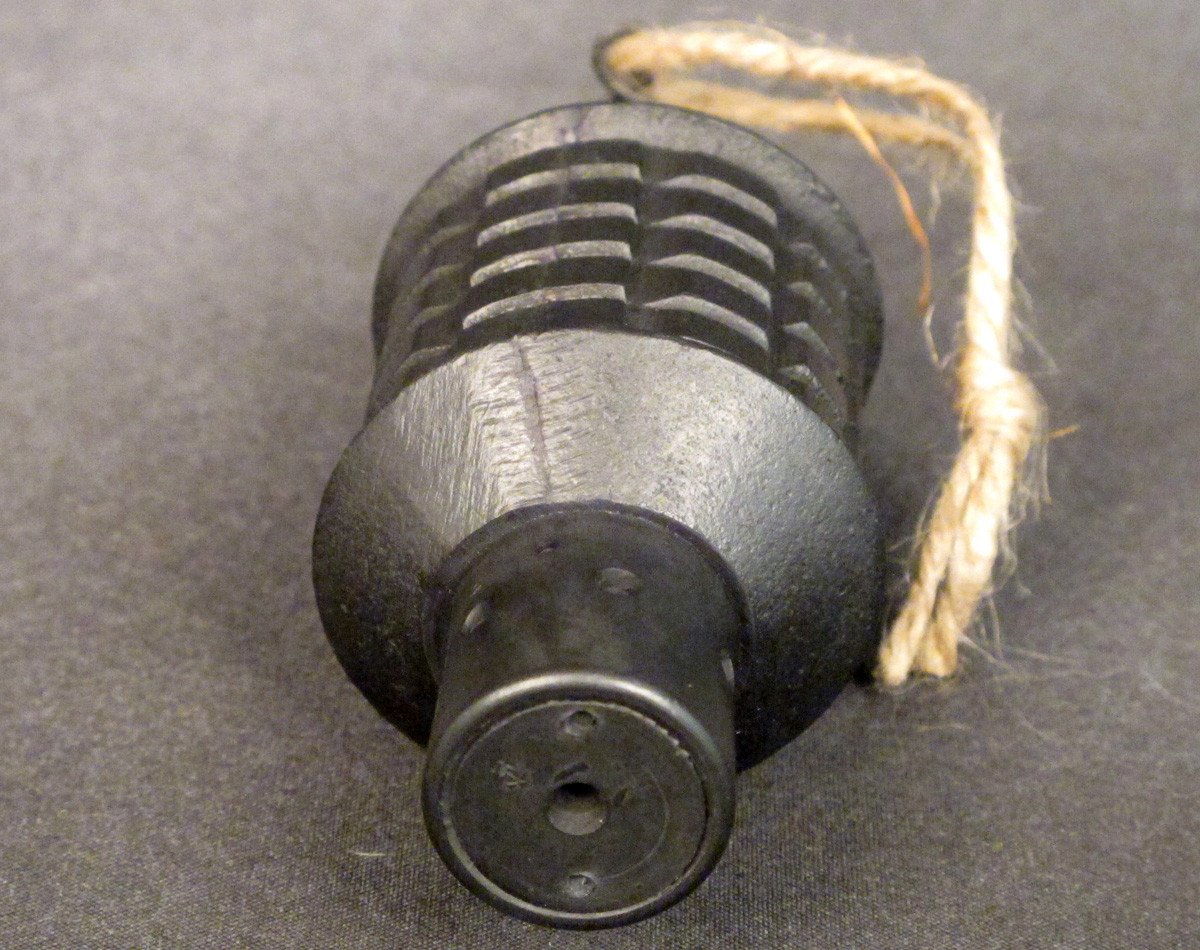 Our replica is cast from a silicon mold of an original de-milled WW2 grenade to exacting precision, it has all the detail of the original. One piece body, independent screw off fuse top, booster, metal pin and rope pull cord. Excellent alternative to carrying an expensive original into the field, or add it to your WW2 collection as valued display piece. Color is grey resin and finished with a coating of graphite to provide that authentic metal sheen. The naked eye won?t be able to tell the difference. Totally inert and cannot be converted to an explosive device.