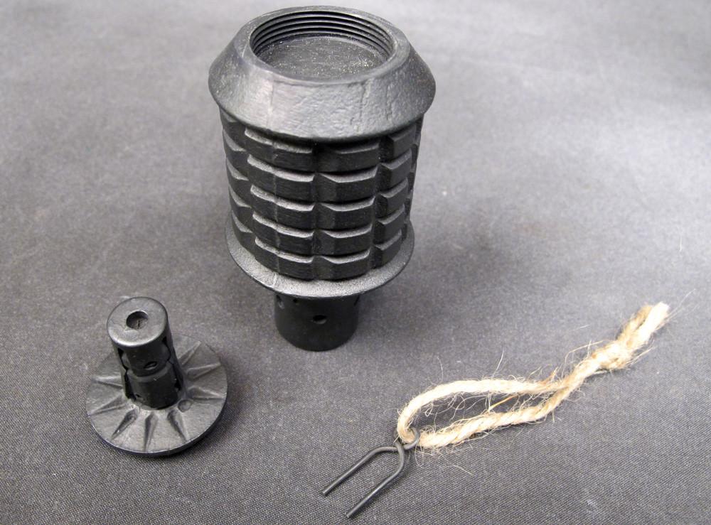 New Made Item: This is a SUPERB four piece resin replica of the Japanese Type 91 Hand Grenade, it might be resin but it feels and looks like metal! Amazing. The type 91 was a versatile grenade. It could be fired from the 50mm "Knee Mortar", used as a spigot launched grenade, or used as a standard hand grenade. It had a seven second delay, which was necessary for its role as a projected munition. The threaded socket in the bottom of the body is for attachment of an auxiliary propellant increment for mortar use, or a finned tailboom assembly could be used to convert the T91 to a rifle grenade.