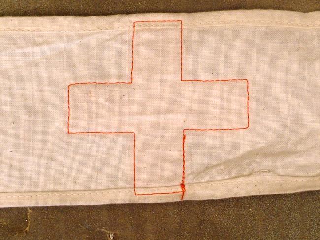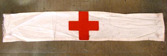 Original Item: WWI & WWII period arm bands used by soldiers performing medic duties. Made of heavy white cotton material with RED felt cross sewn in center. WWI & WWII examples were attached with safety pins or buttons, we have both (our choice). Virtually unused showing only age from long storage.