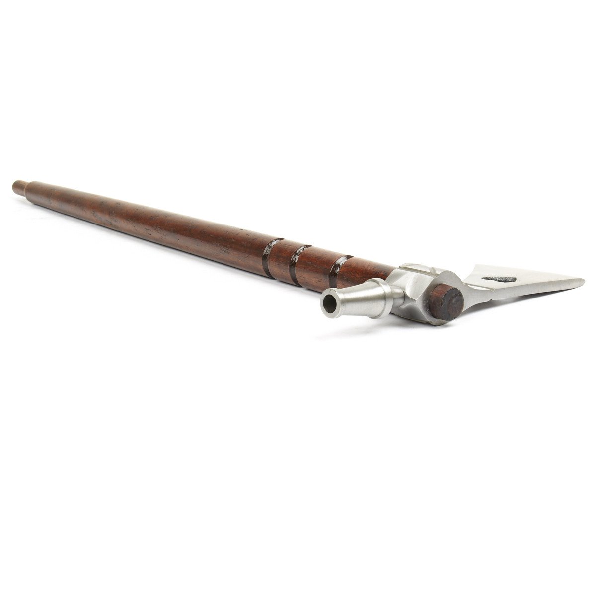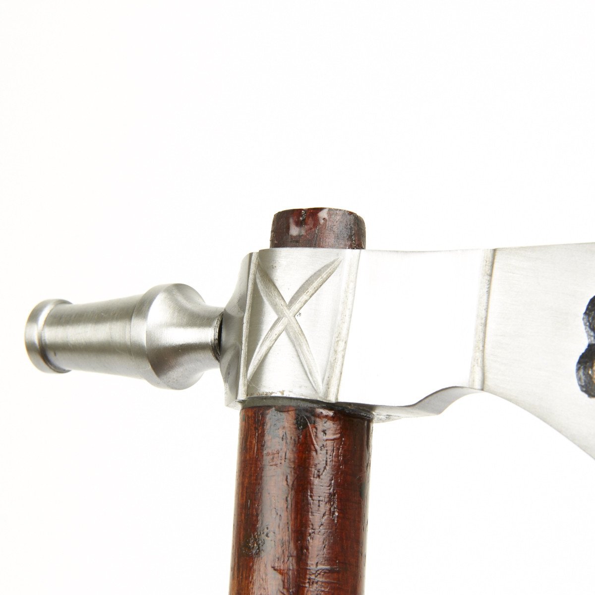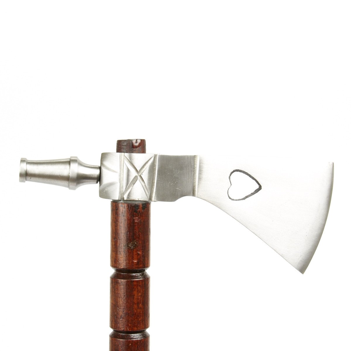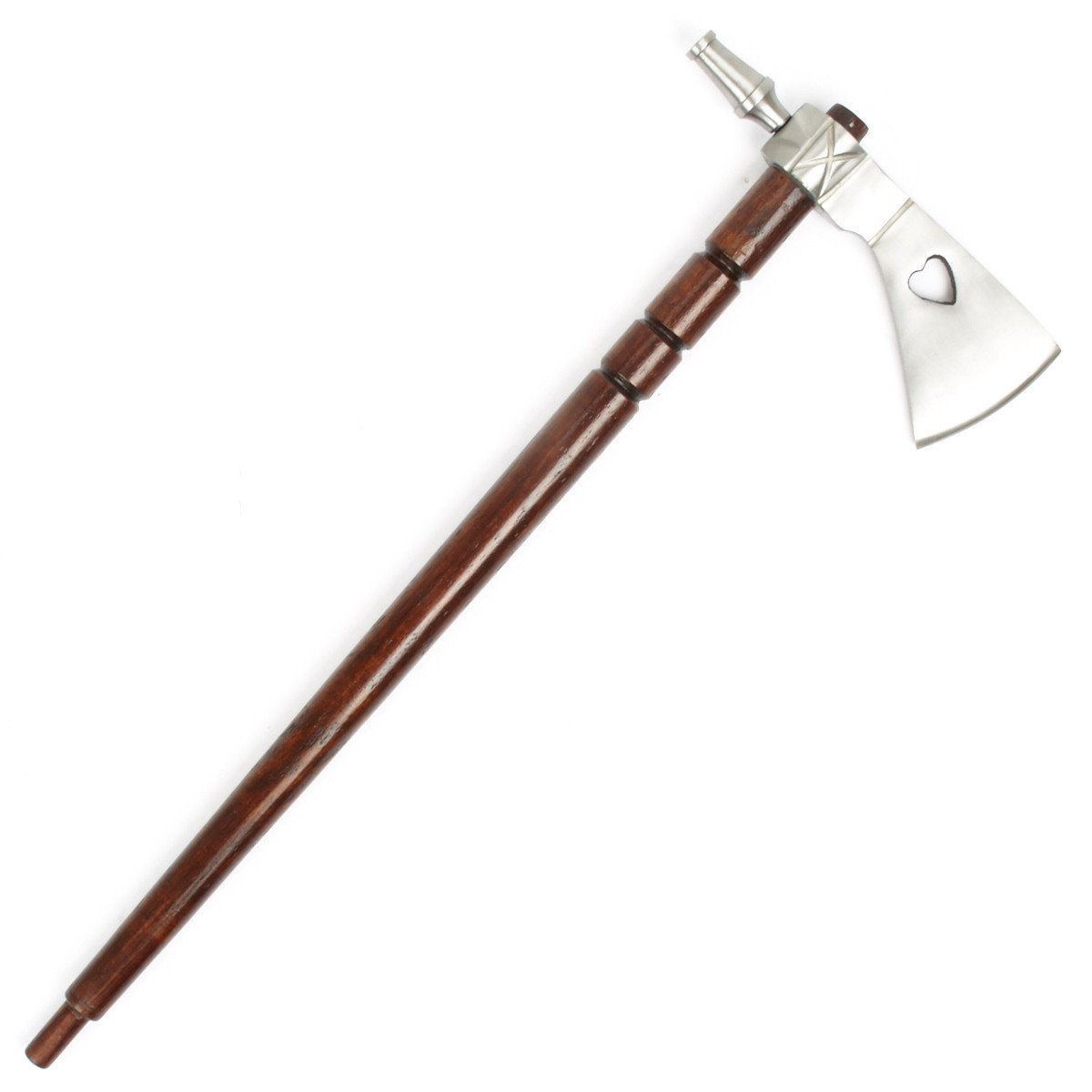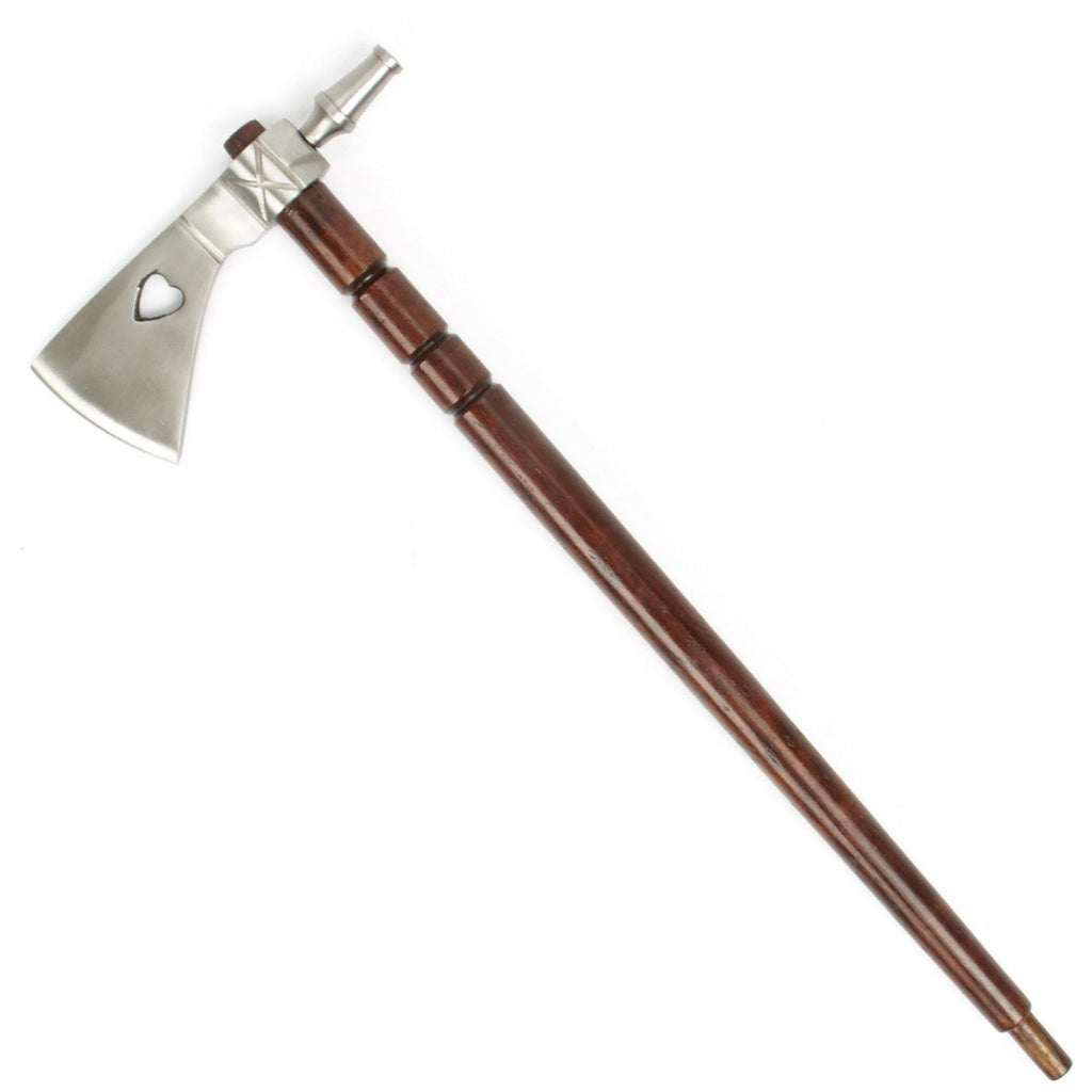 New Made Item: Smoking tomahawks or pipe hawks really did exist. This hand made example is a high quality replica crafted after an original in the English style. It features an all iron head with weeping heart cutout and a hollow hardwood shaft. This hawk, while sturdy, is not suitable for throwing. Blade comes unsharpened. And, yes, you can really smoke out of it; so pass the peace pipe then bury the hatchet!
