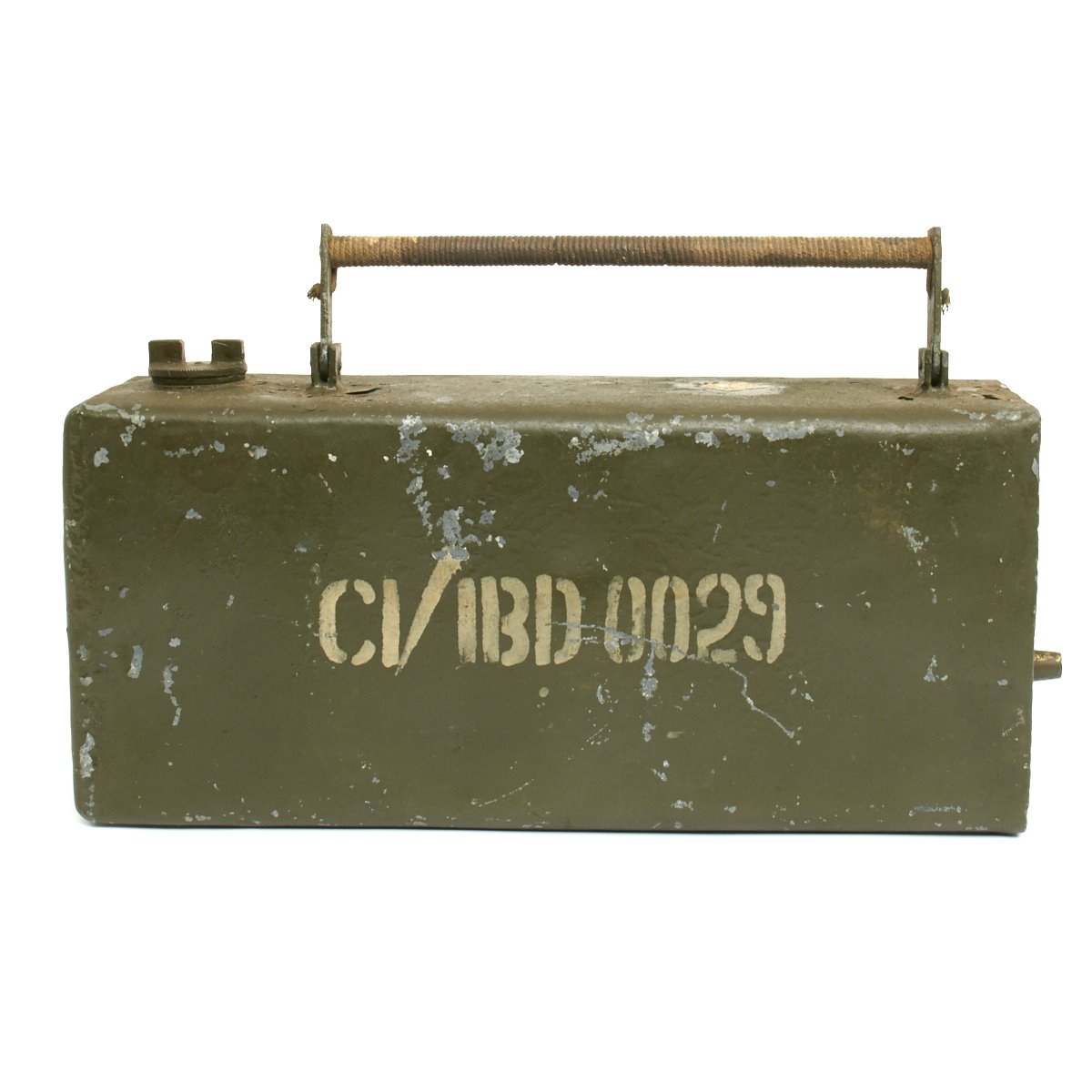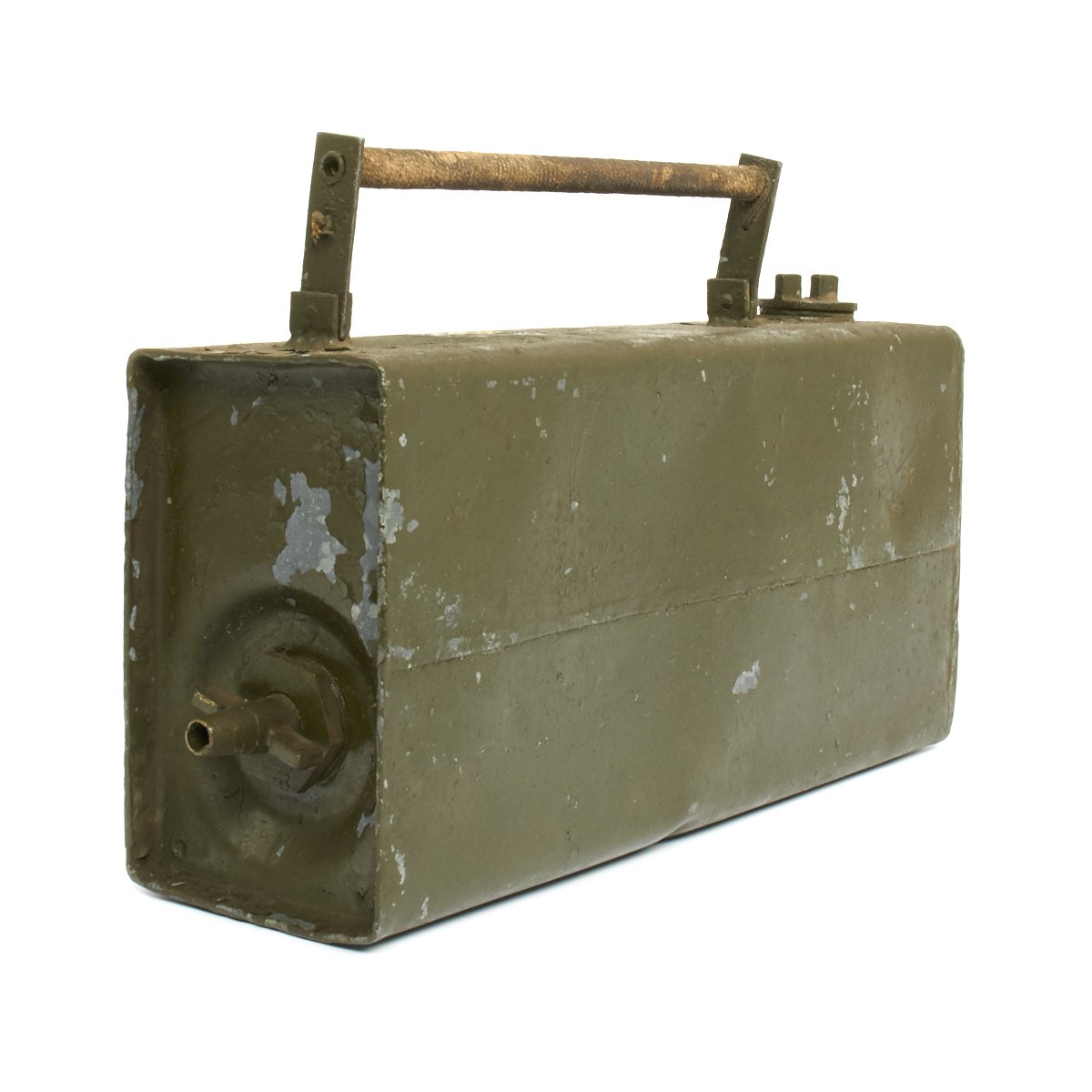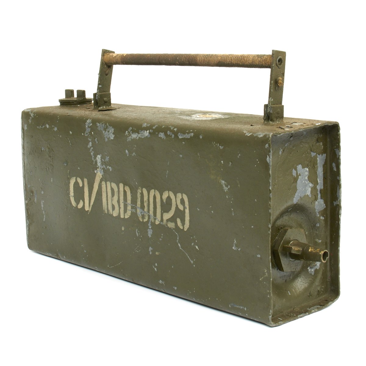 Original Item: Only One Available. This is a purpose built World War Two British steam condensing can or water can designed for the British Vickers Medium Machine Gun. This example measures 15.5" x 7" x 4". It features original paint and original cord handle wrap. It has a brass maker badge that bears a large S and 1940 as well as company name and address. Features original brass cap with chain and stopper still intact. Nicely stenciled on the side in white paint C1/IBD-0029.