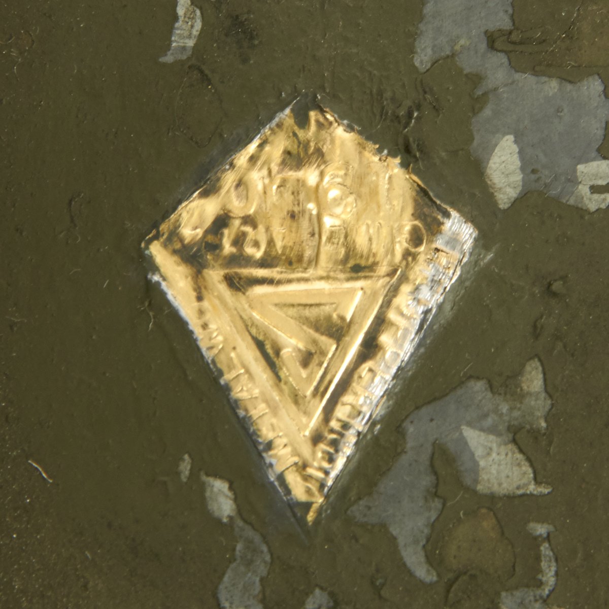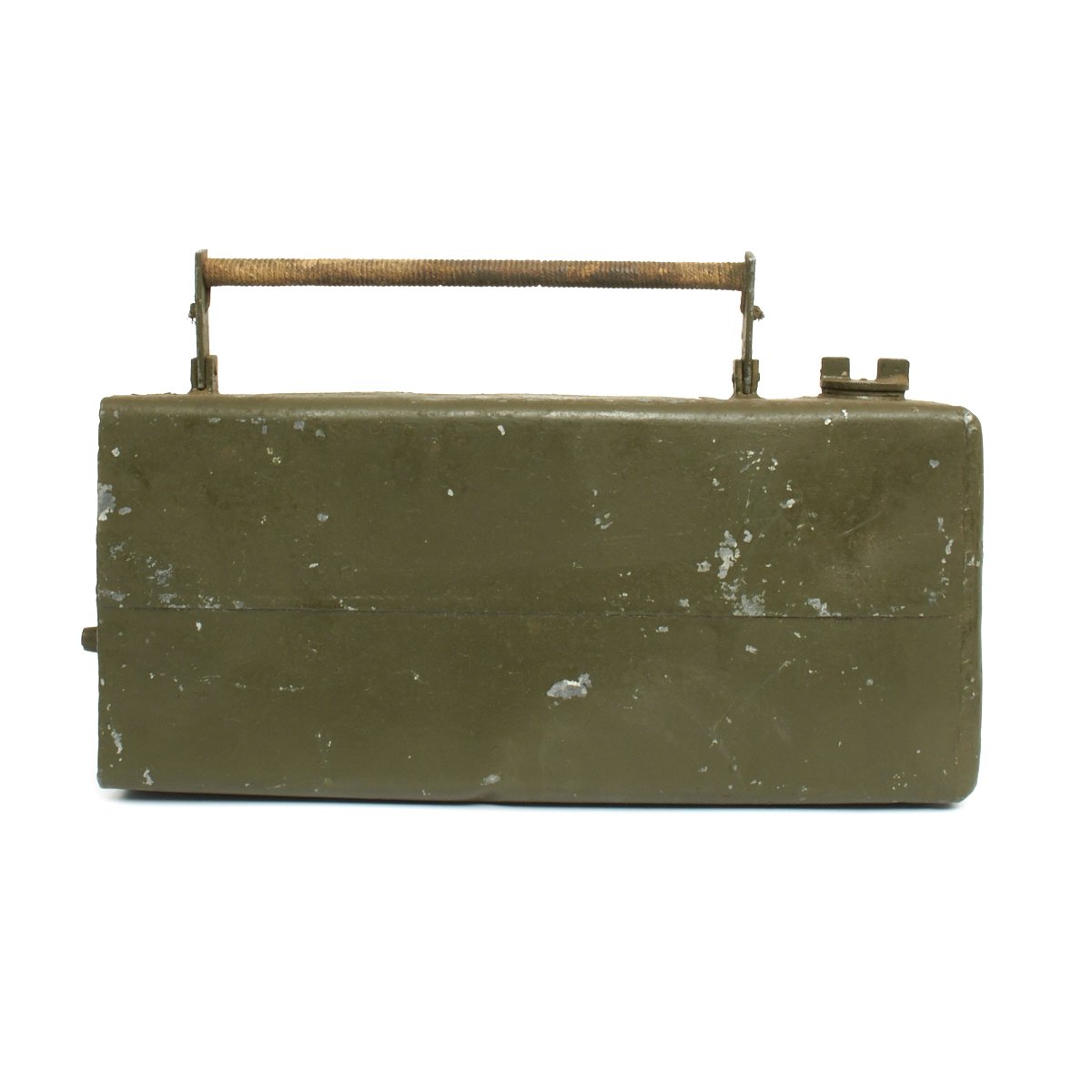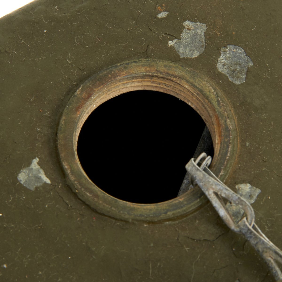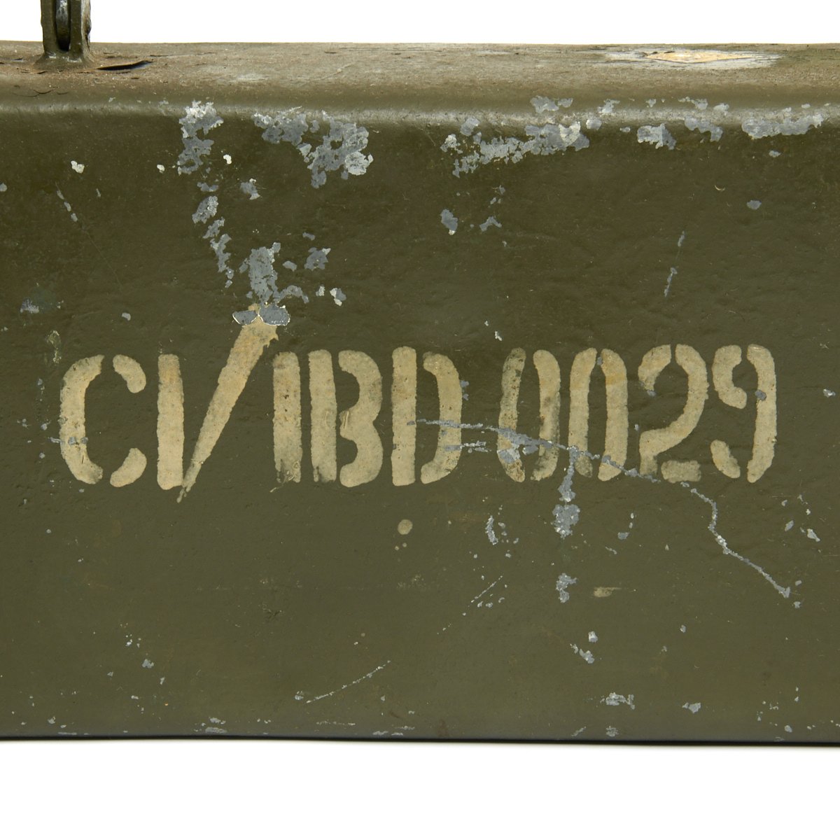 Original Item: Only One Available. This is a purpose built World War Two British steam condensing can or water can designed for the British Vickers Medium Machine Gun. This example measures 15.5" x 7" x 4". It features original paint and original cord handle wrap. It has a brass maker badge that bears a large S and 1940 as well as company name and address. Features original brass cap with chain and stopper still intact. Nicely stenciled on the side in white paint C1/IBD-0029.