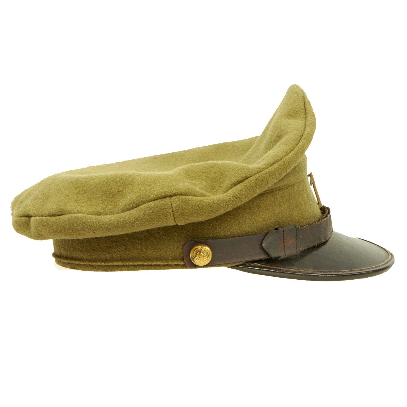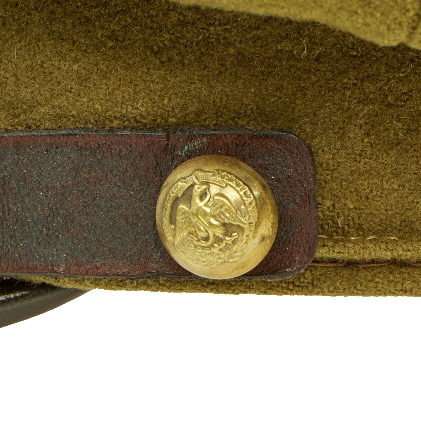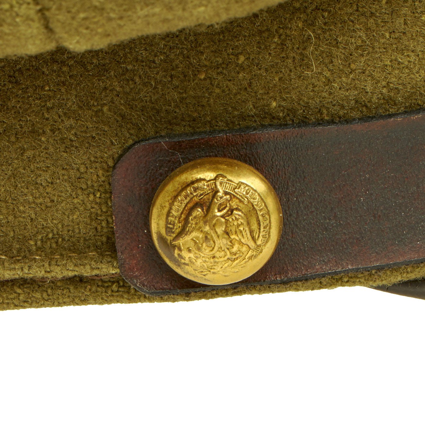 - Original Item: Only One Available. We haven't seen many of these before, this is a khaki/green wool visor cap with leather visor and Republica Mexicana gilt chinstrap buttons. This type button features a Mexican Eagle in the center, facing forward, with its wings spread out to each side. The head is turned to its left, and slightly raised, and holding a snake in its beak. It is standing on a cactus and below that what appears to be an olive branch extends in an arc around the lower half of the button. Written in an arc around the upper half of the button is the logo “REPUBLICA MEXICANA”. The front of the cap features a brass nubs 1 pin and an enamel cockade in the Mexican colors produced by CC Sporrong & Co of Stockholm, Sweden. This enamel badge may not be correct for this hat, we just don't know for sure. Overall condition is very good and the size is approximately 6 3/4 (54cm). Interior is missing the data label.