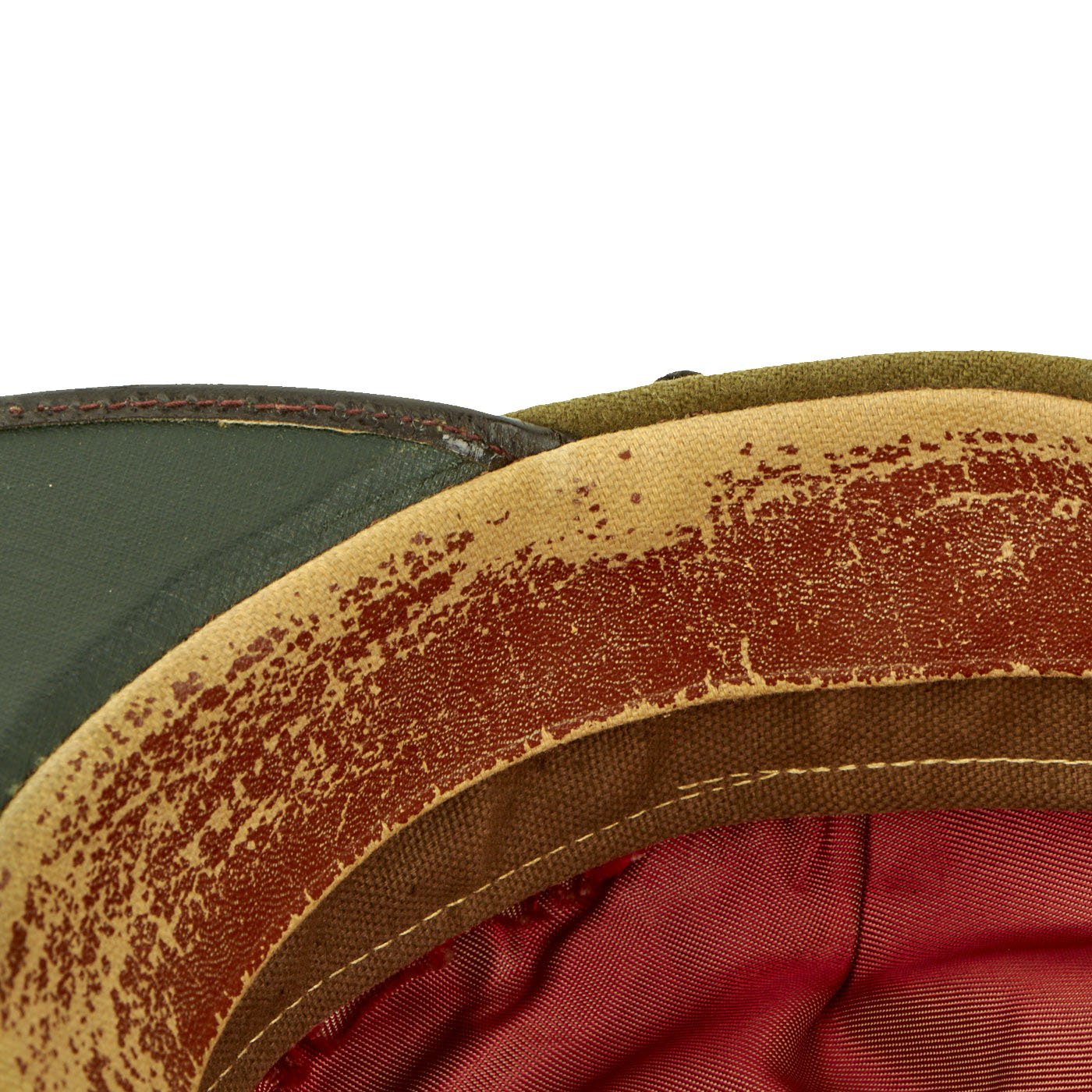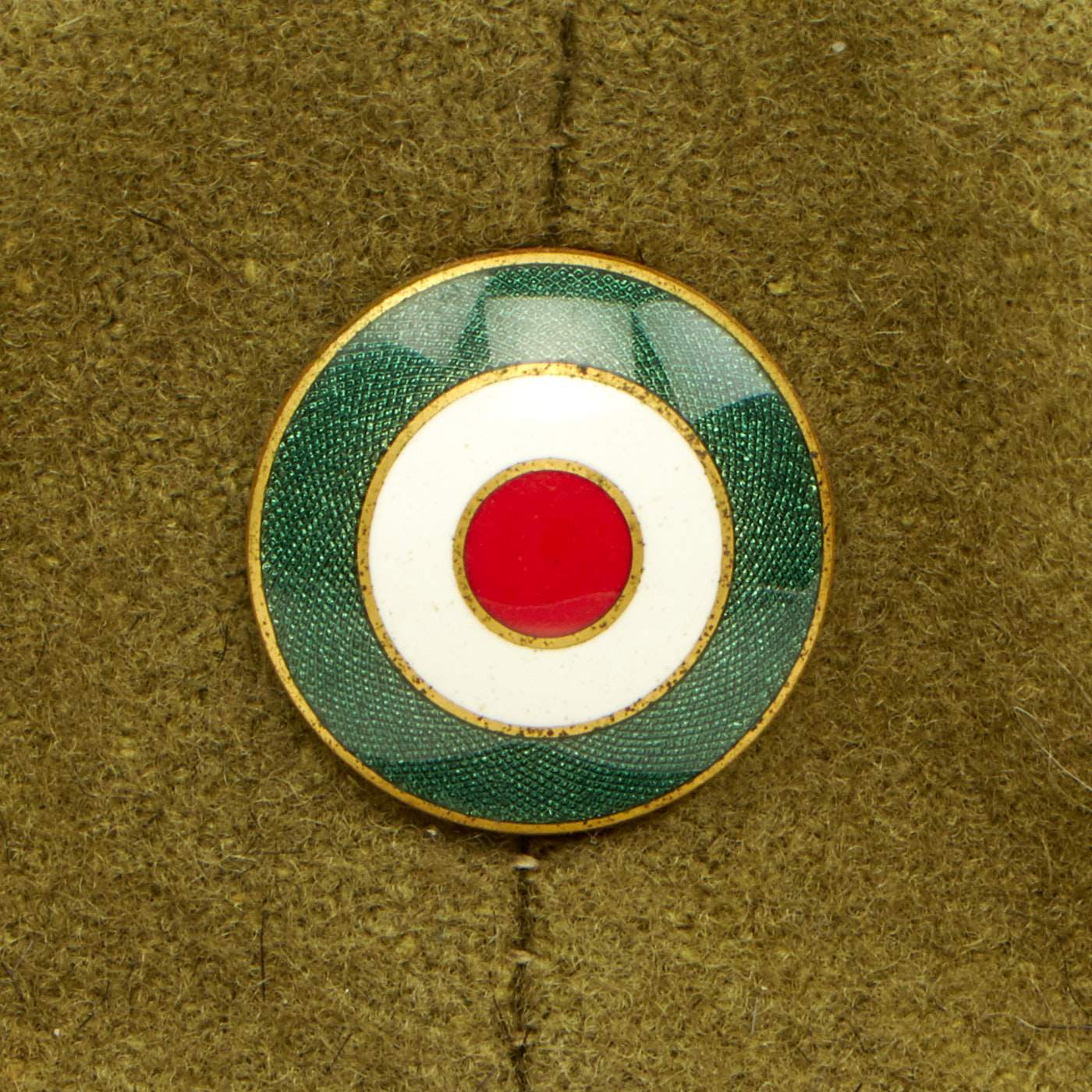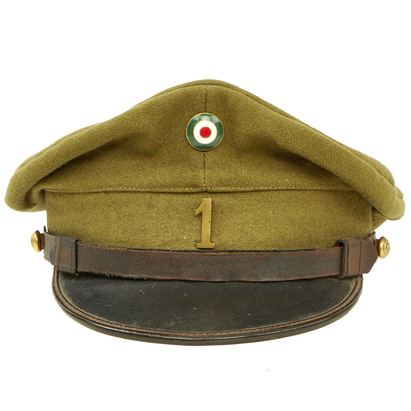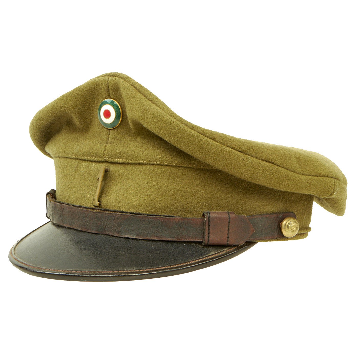 - Original Item: Only One Available. We haven't seen many of these before, this is a khaki/green wool visor cap with leather visor and Republica Mexicana gilt chinstrap buttons. This type button features a Mexican Eagle in the center, facing forward, with its wings spread out to each side. The head is turned to its left, and slightly raised, and holding a snake in its beak. It is standing on a cactus and below that what appears to be an olive branch extends in an arc around the lower half of the button. Written in an arc around the upper half of the button is the logo “REPUBLICA MEXICANA”. The front of the cap features a brass nubs 1 pin and an enamel cockade in the Mexican colors produced by CC Sporrong & Co of Stockholm, Sweden. This enamel badge may not be correct for this hat, we just don't know for sure. Overall condition is very good and the size is approximately 6 3/4 (54cm). Interior is missing the data label.