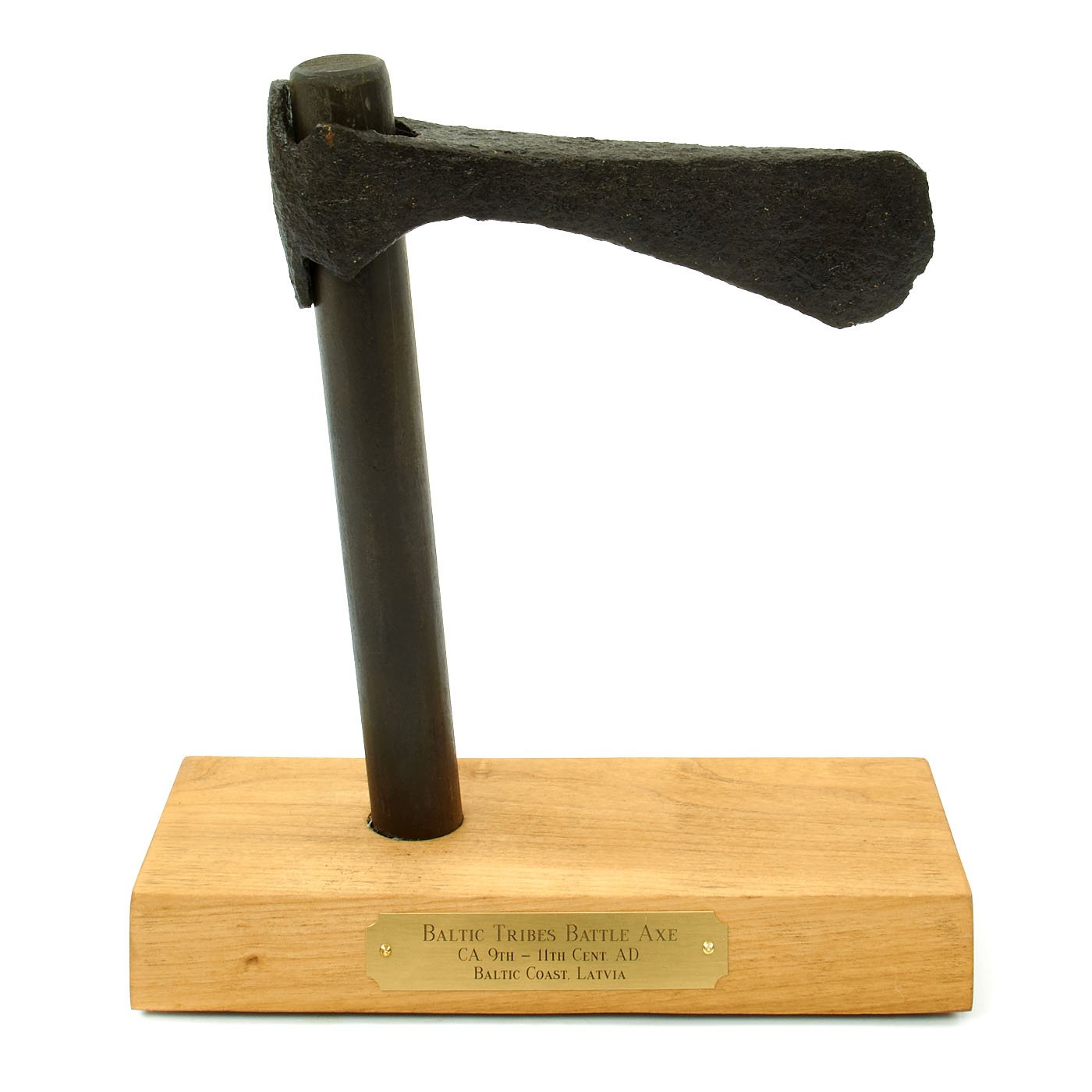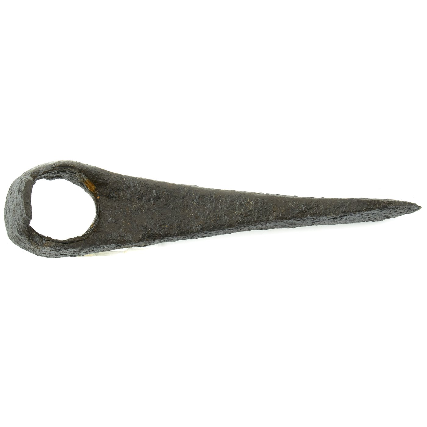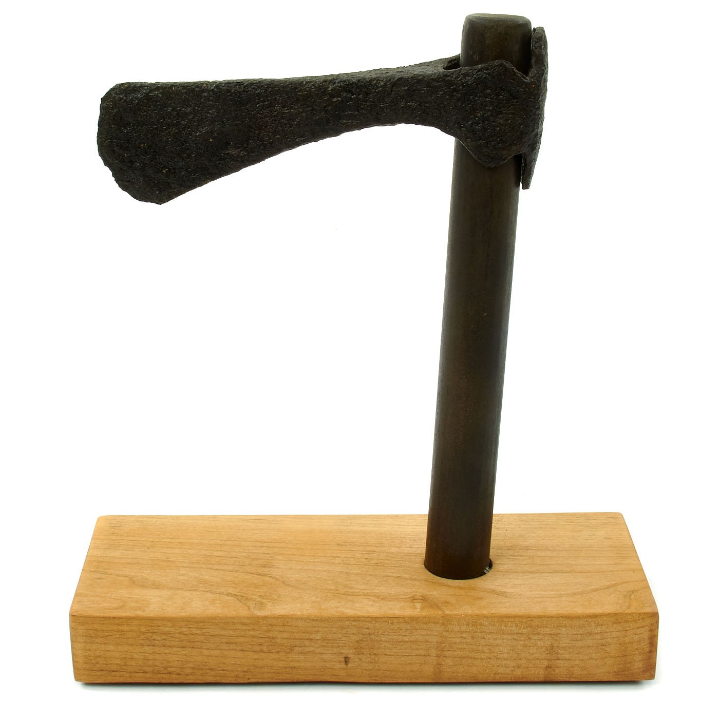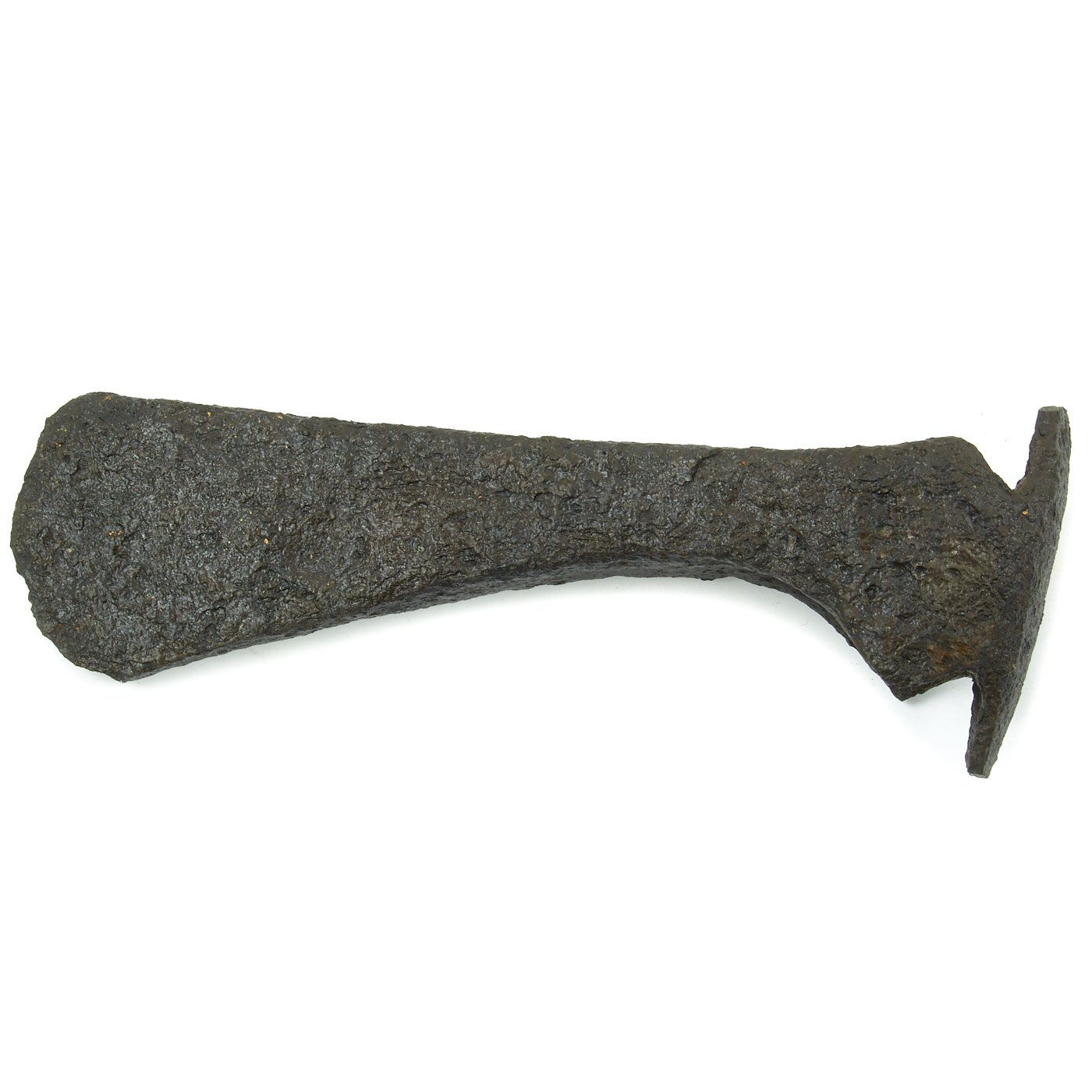 Original Item: Only One Available. This is a very nice smooth Viking axe head with graceful lines and traces of the original edge. A professional archaeologist cleaned this axe and treated the iron against further corrosion. The shape of this axe is similar to the third one in the accompanying archaeological sketch. Some of the drawings show what the axe would have looked like with its handle. Like many Viking artifacts, this axe was found by a farmer while cultivating crops. Dug up with bronze bracelets and other personal metal items.