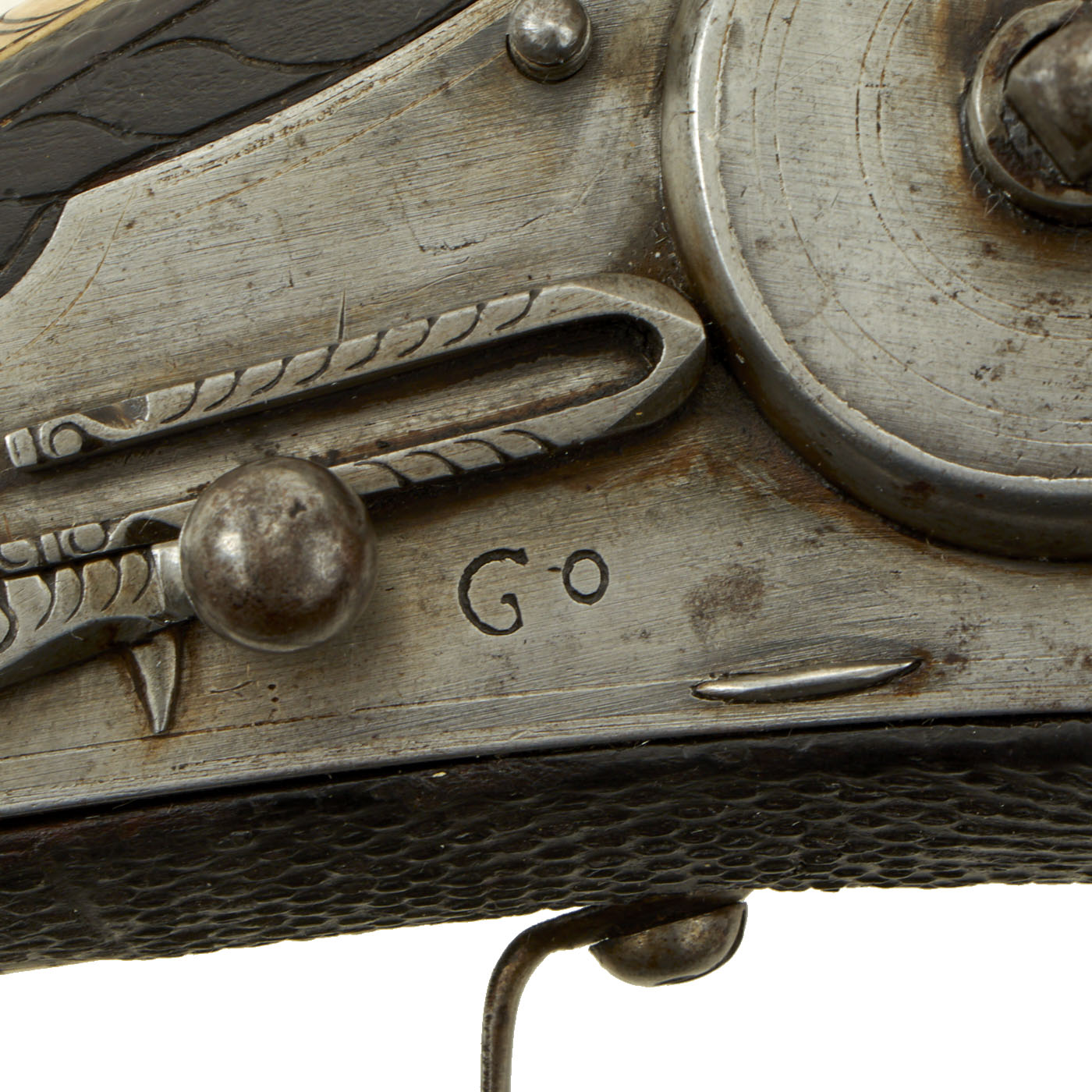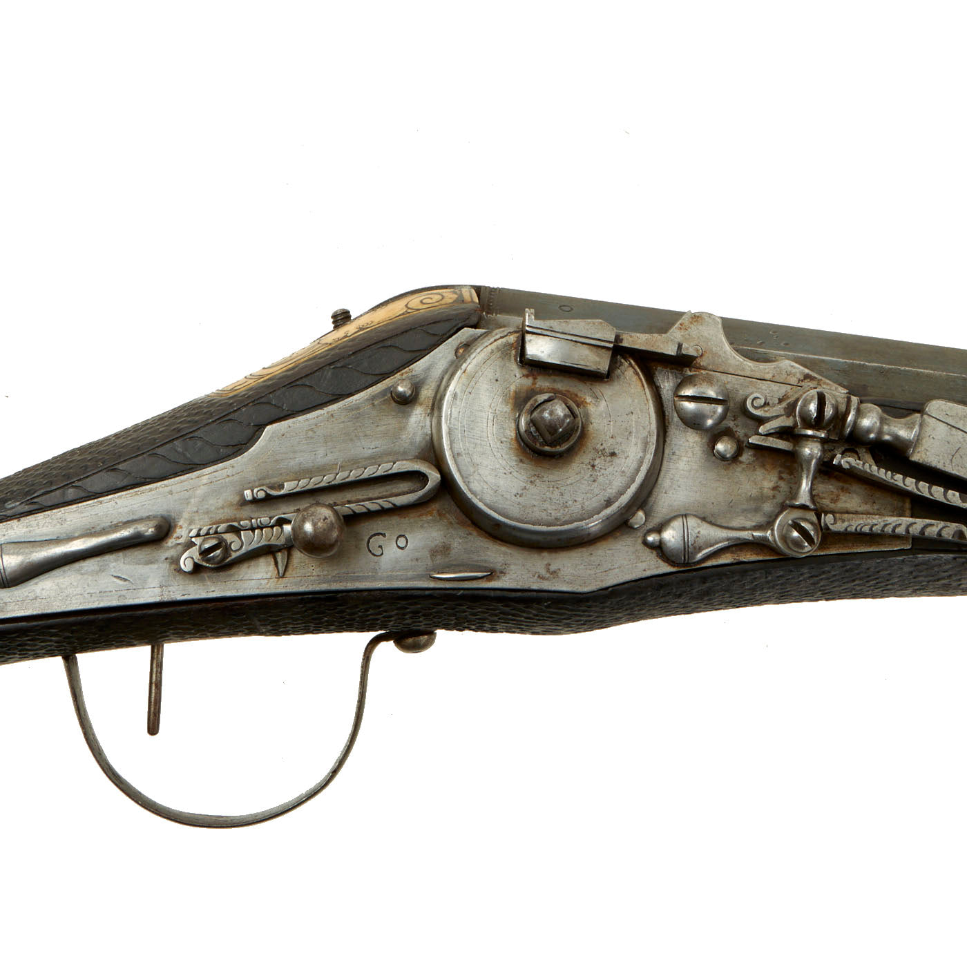 Measuring 22 1/2 inches in overall length, the pistol features a 13 inch long half octagonal barrel, which has a lovely blued finish. It is dated 1 * 5 * 9 * 1 on the top facet. As with all wheellock pistols, it has very complicated steel and iron lock mechanism, at the time the ultimate technology. It is marked with G o on the lock, which is repeated on the top of the barrel breech. We assume this is a maker marking, however we have not been able to identify the maker.