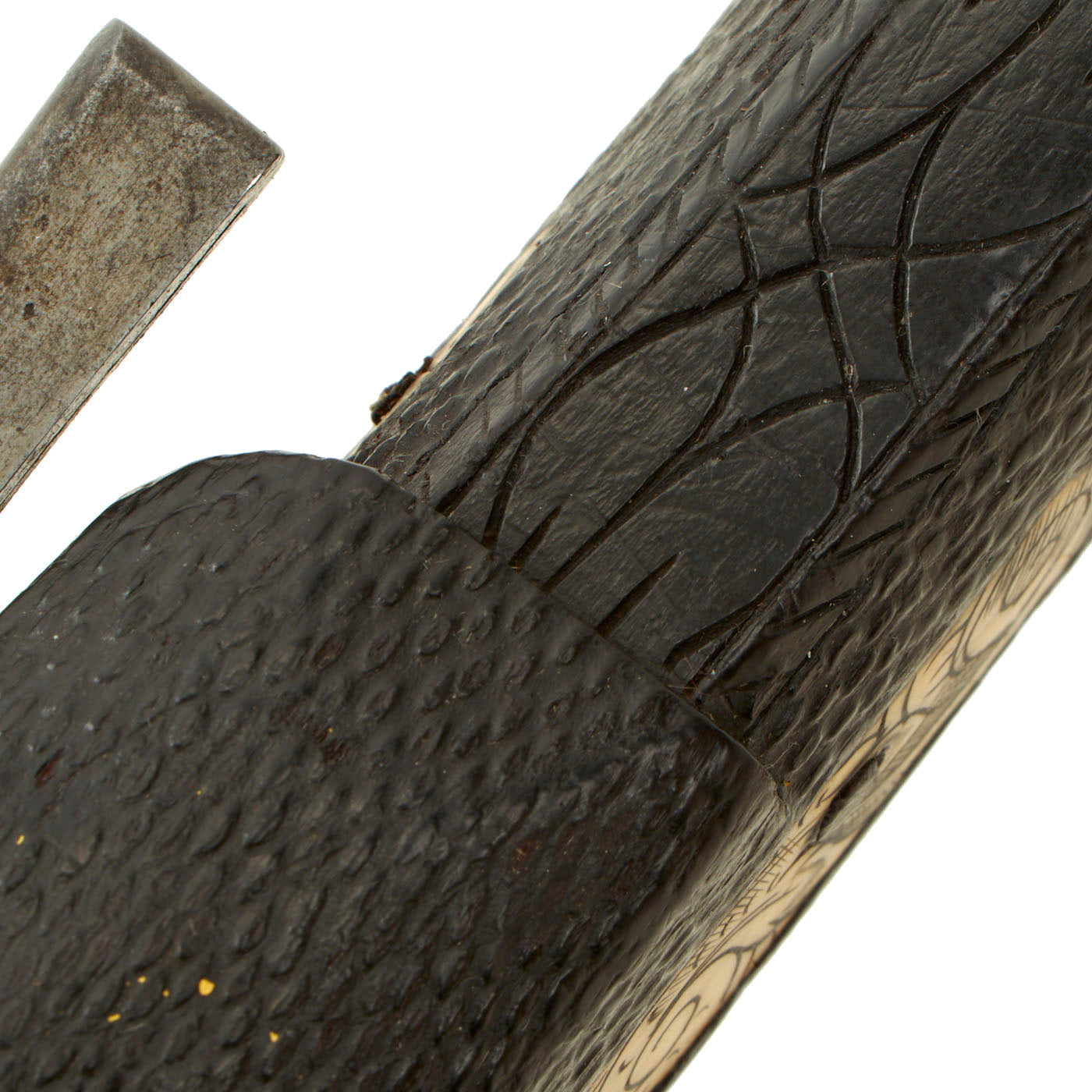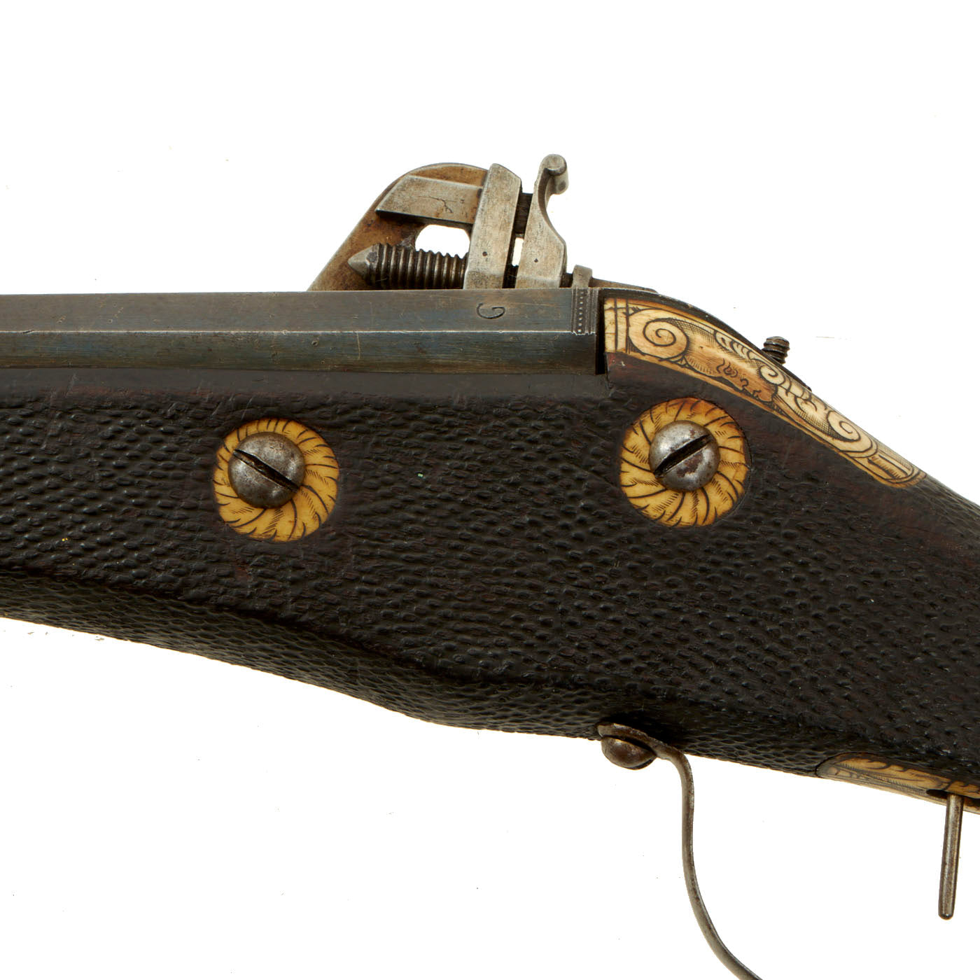The metalwork is mounted in a black checkered hardwood stock, beautifully decorated with hand engraved stag horn. This puffer features decorative work such as faces on the staghorn inlays on the sides of the barrel tang. The ball-shaped pommel is inlaid with a staghorn medallion engraved with the arms of the Electorate of Saxony.