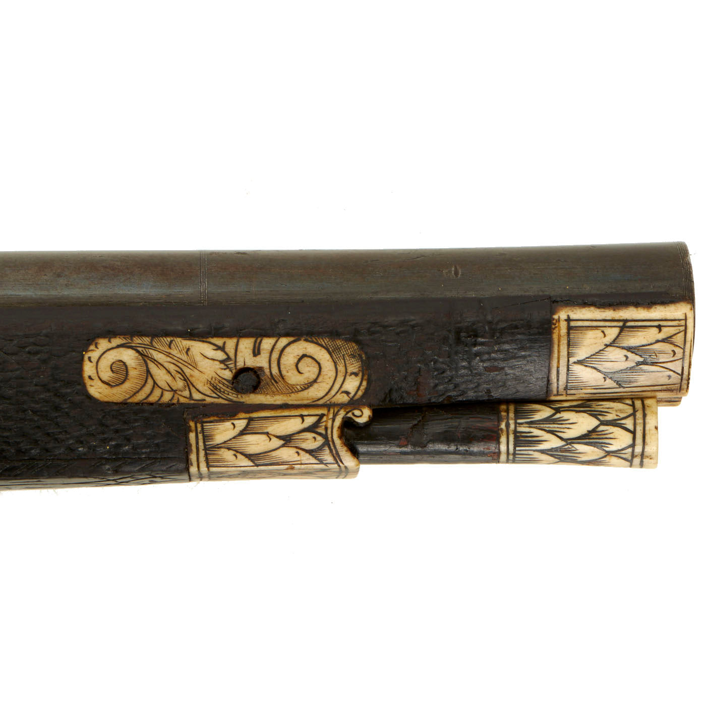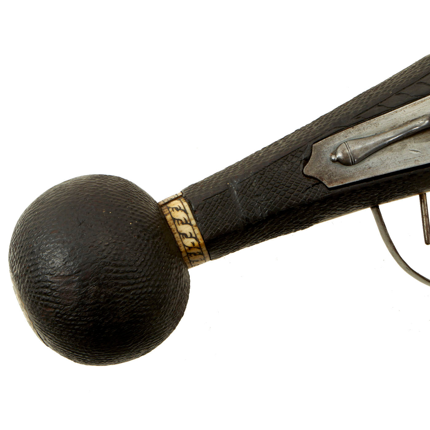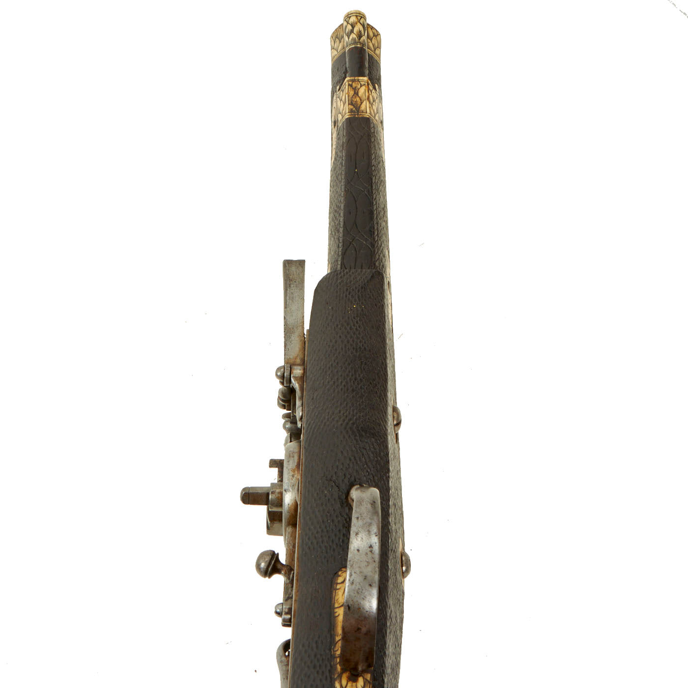 The Electorate of Saxony was quite wealthy, and equipped the Guard of the Elector very lavishly with weapons and armor of tremendous quality, as well as high levels of decoration. This pistol is one such example, and bears the Coat of Arms of the electorate engraved on a stag horn disk mounted on the end of the ball-shaped butt stock.