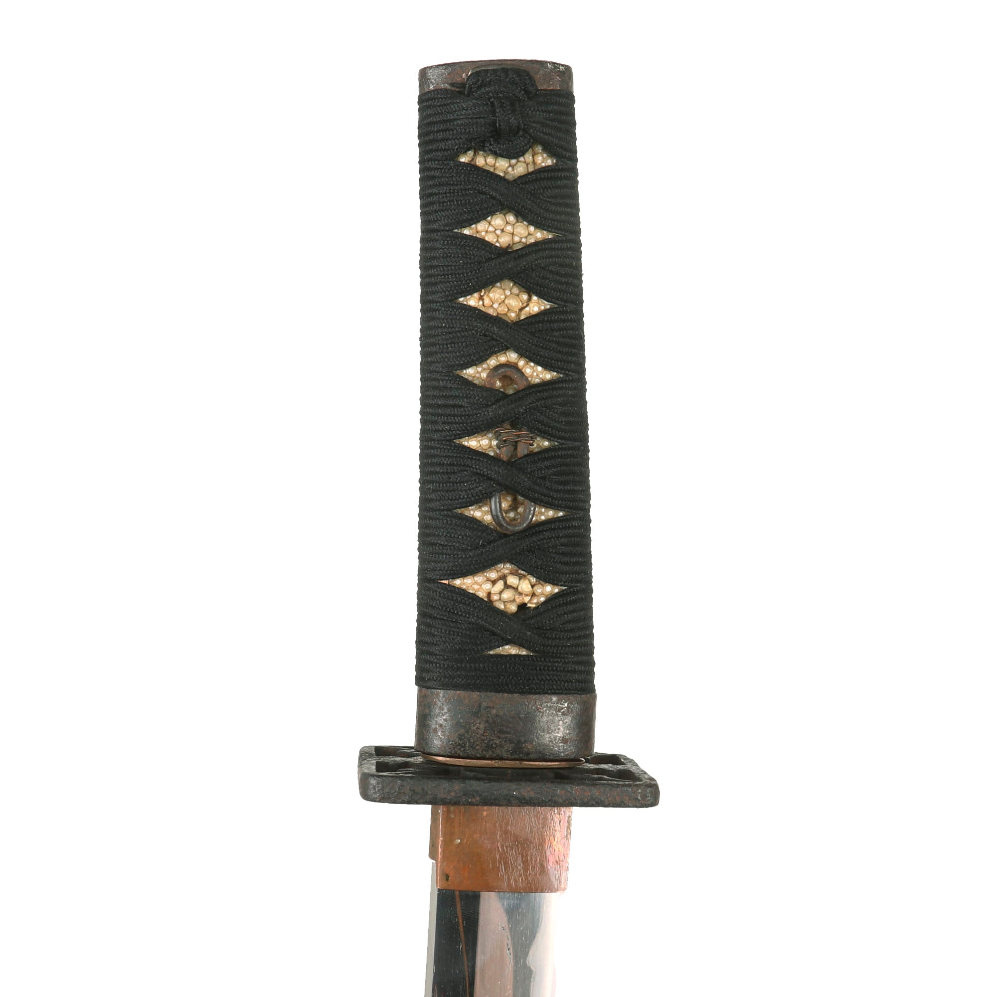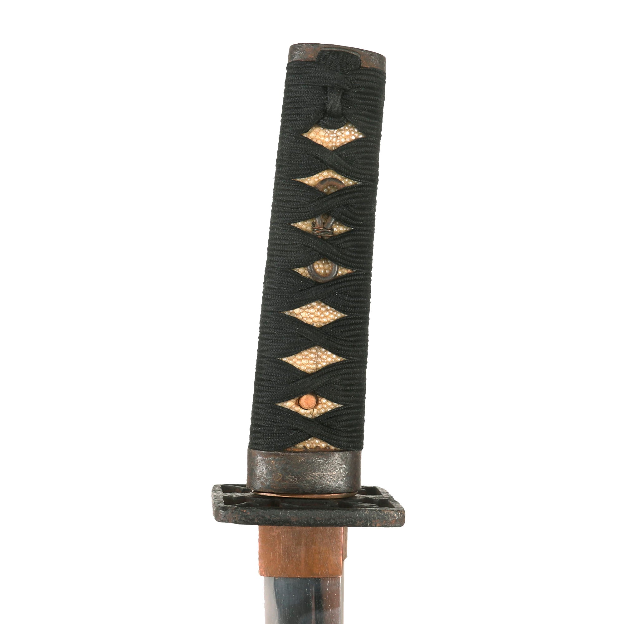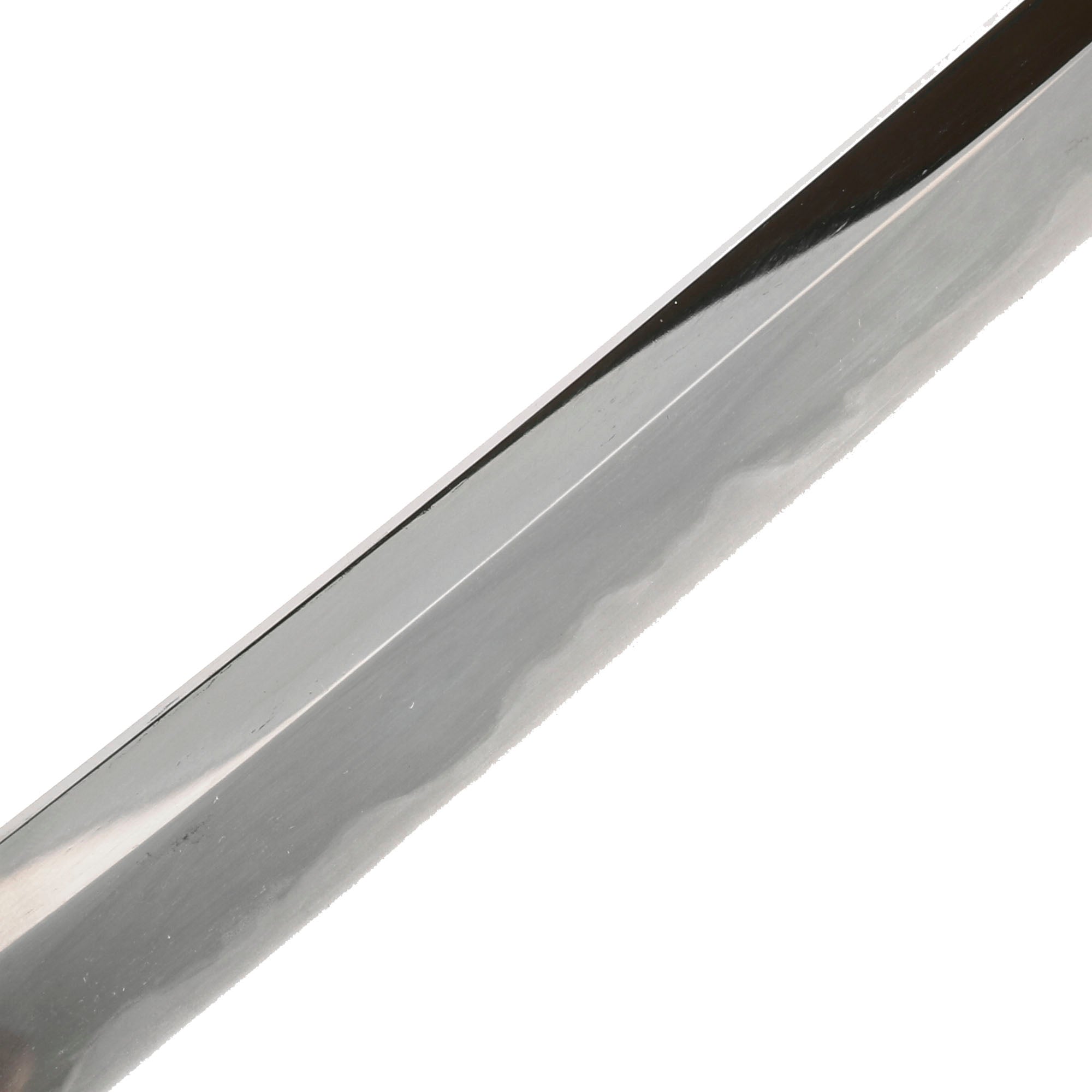 Offered in magnificent condition, the polish on the blade of this example is excellent, showing that very little use and cleaning has happened since the last polishing. There are just a few minor spots of oxidation, and the aspects of this blade are able to be easily appreciated in any kind of light. It is still quite sharp, with no edge issues we can see, and should be handled with care. The blade length is approximately 17 ¼" and overall length 23 ¾". It has a futsu 普通 (regular) Nakago with an Haagari (asymmetrical rounded) nakago-jiri (tang tip). The blade shape is SHINOGI-ZUKURI, which is the "standard" shape for most Katana and longer wakizashi. Many would term this an "Ō-Wakizashi" as the length is relatively close to a Katana.