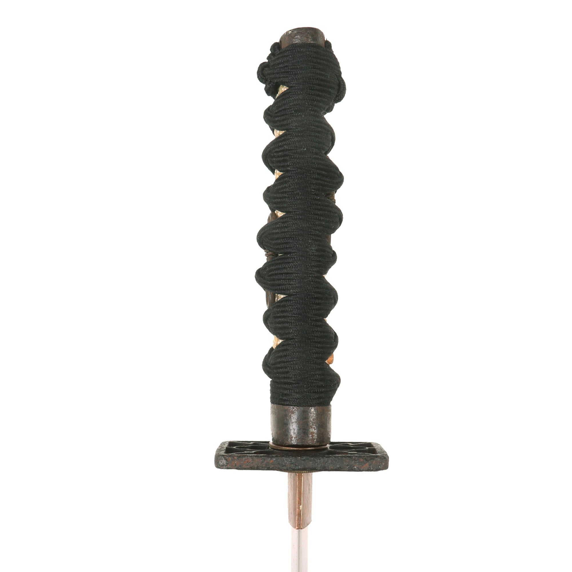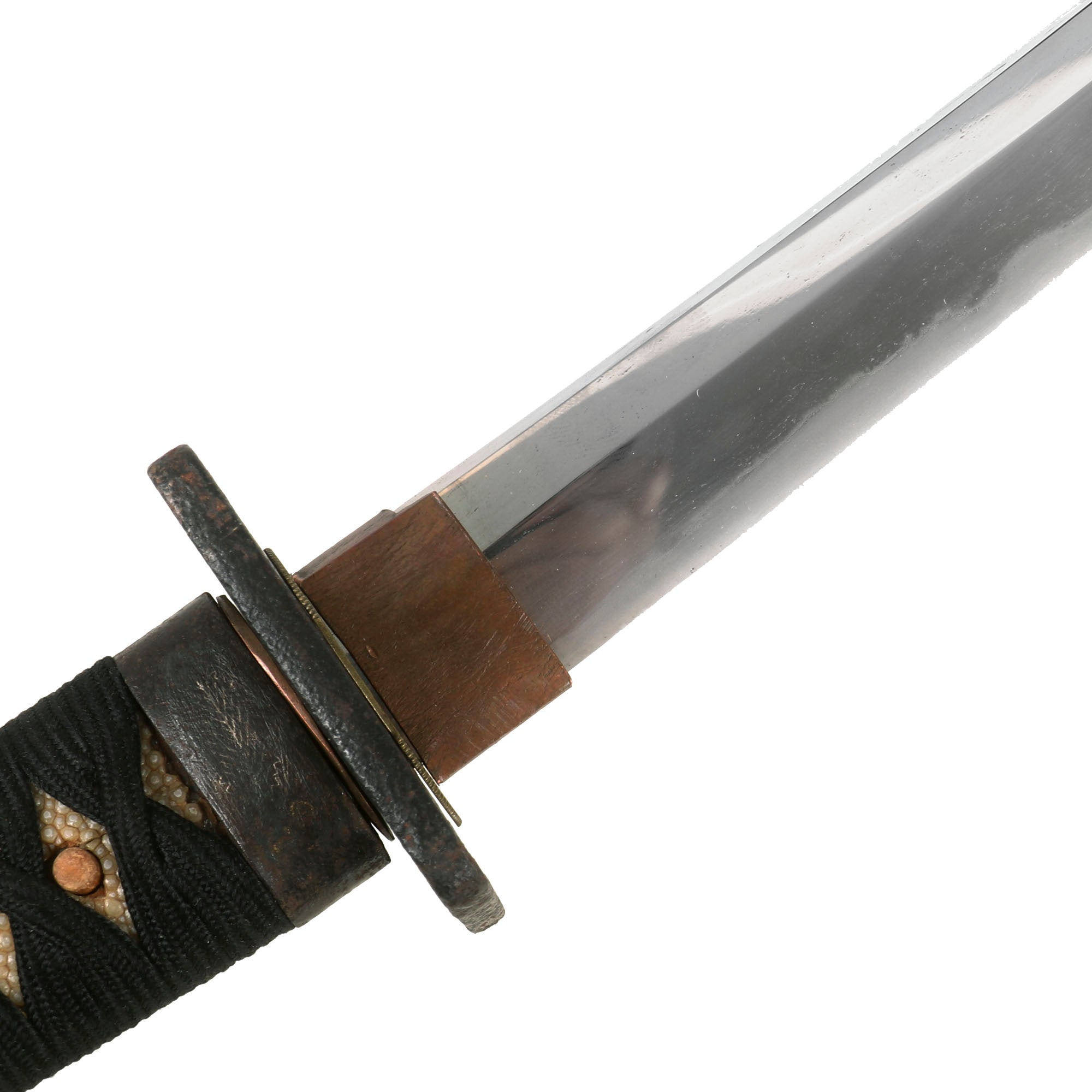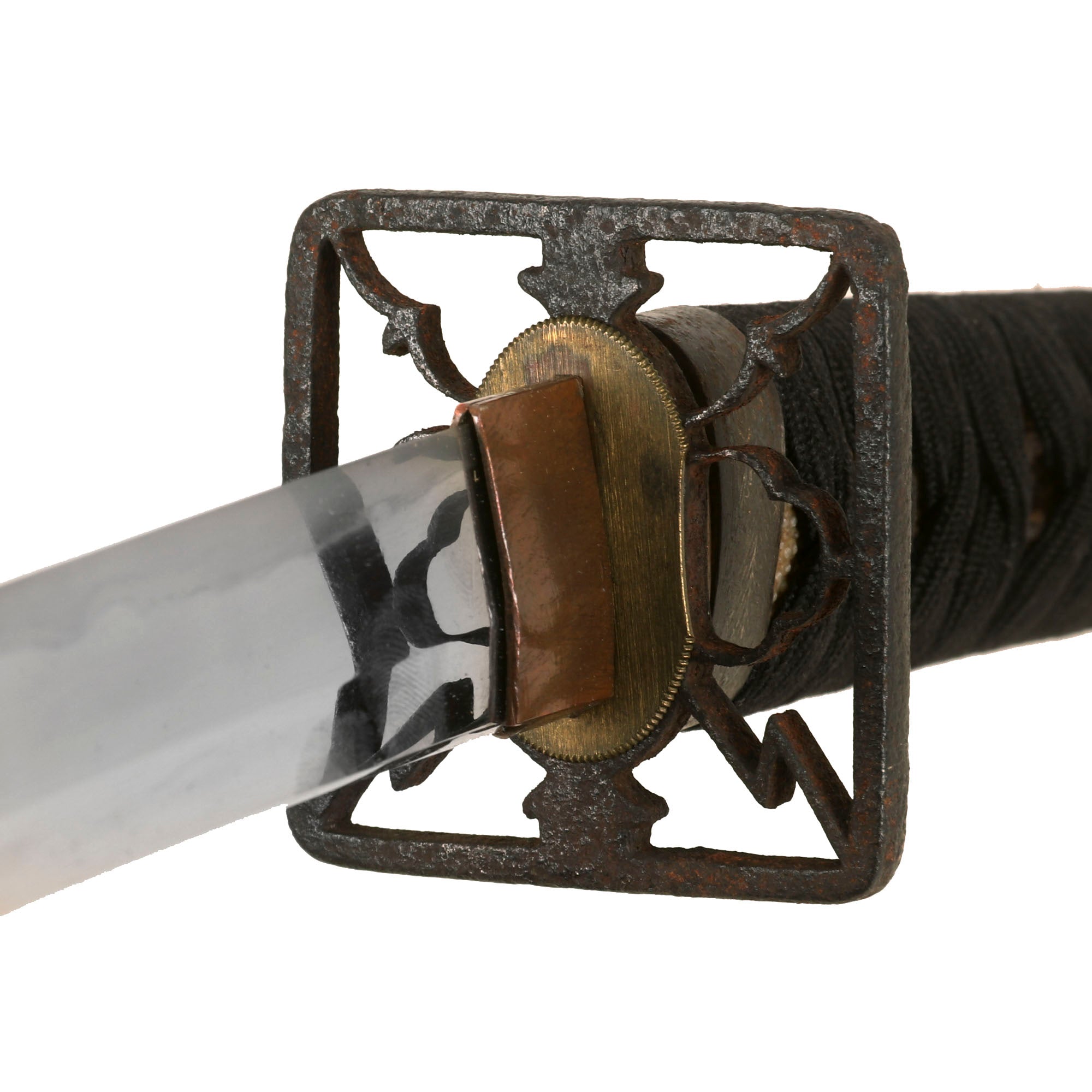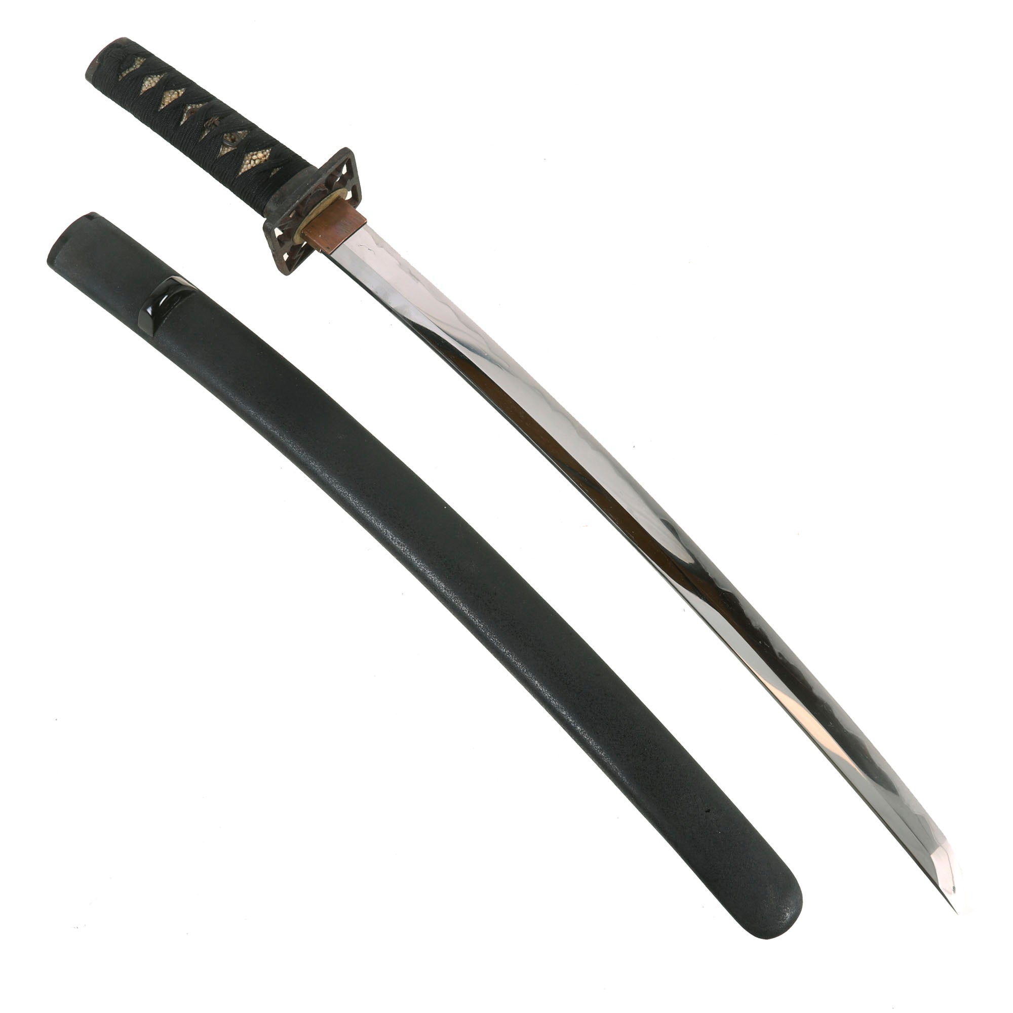 Offered in magnificent condition, the polish on the blade of this example is excellent, showing that very little use and cleaning has happened since the last polishing. There are just a few minor spots of oxidation, and the aspects of this blade are able to be easily appreciated in any kind of light. It is still quite sharp, with no edge issues we can see, and should be handled with care. The blade length is approximately 17 ¼" and overall length 23 ¾". It has a futsu 普通 (regular) Nakago with an Haagari (asymmetrical rounded) nakago-jiri (tang tip). The blade shape is SHINOGI-ZUKURI, which is the "standard" shape for most Katana and longer wakizashi. Many would term this an "Ō-Wakizashi" as the length is relatively close to a Katana.
