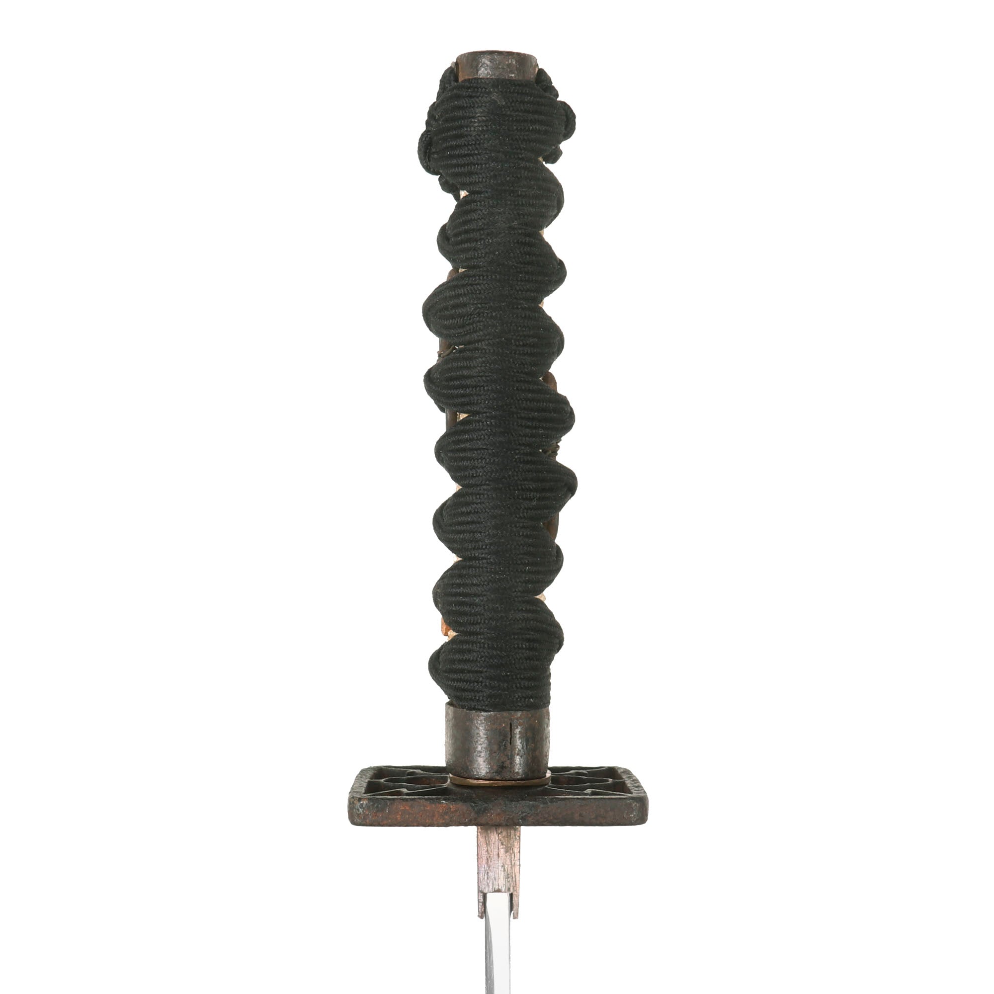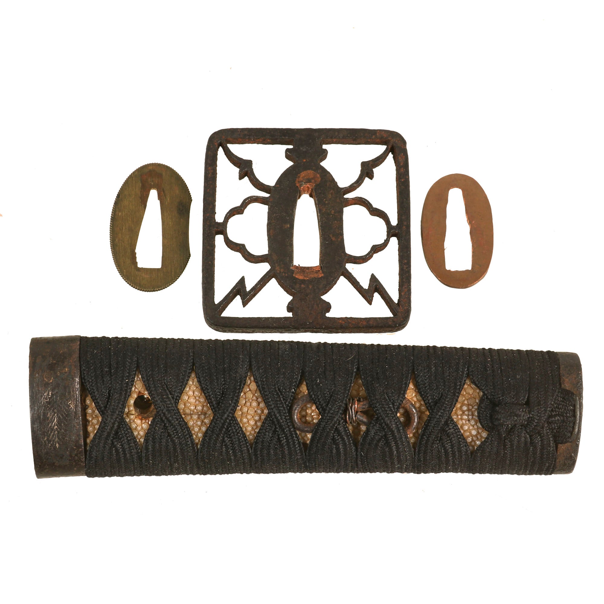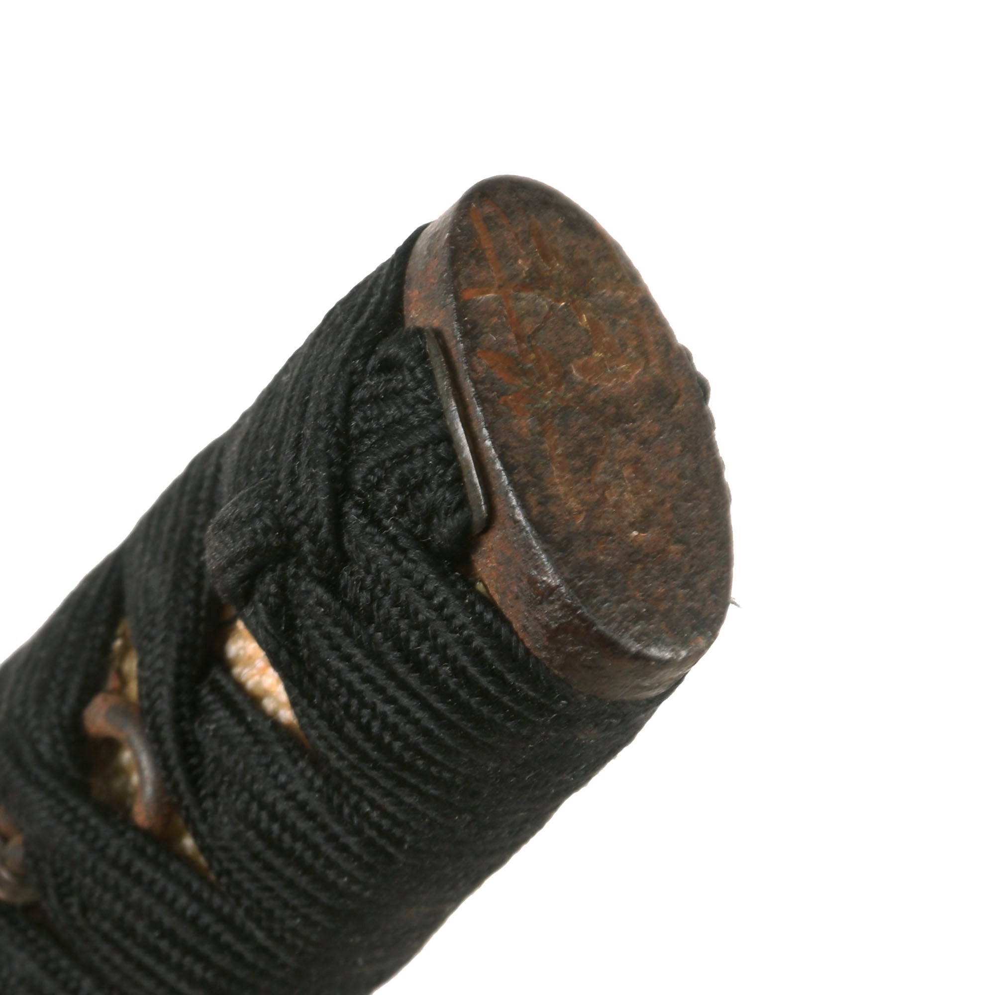 The fuchi (collar) for the tsuka (handle) is made from patinated iron, and has some lovely inlaid designs, though they are quite faint. The kashira (end cap) is also of iron, and has some lovely decorations on the bottom. There are two menuki grip ornaments, which look to be some type of rope design. The stingray skin (Sa-Me) grip is in great shape, showing no splitting or other damage, and the black grip wrapping (Ito) is excellent, looking to have been redone during the 20th century. There is a single partial wooden securing peg (mekugi) still present, which could looks to be from the early 20th century.