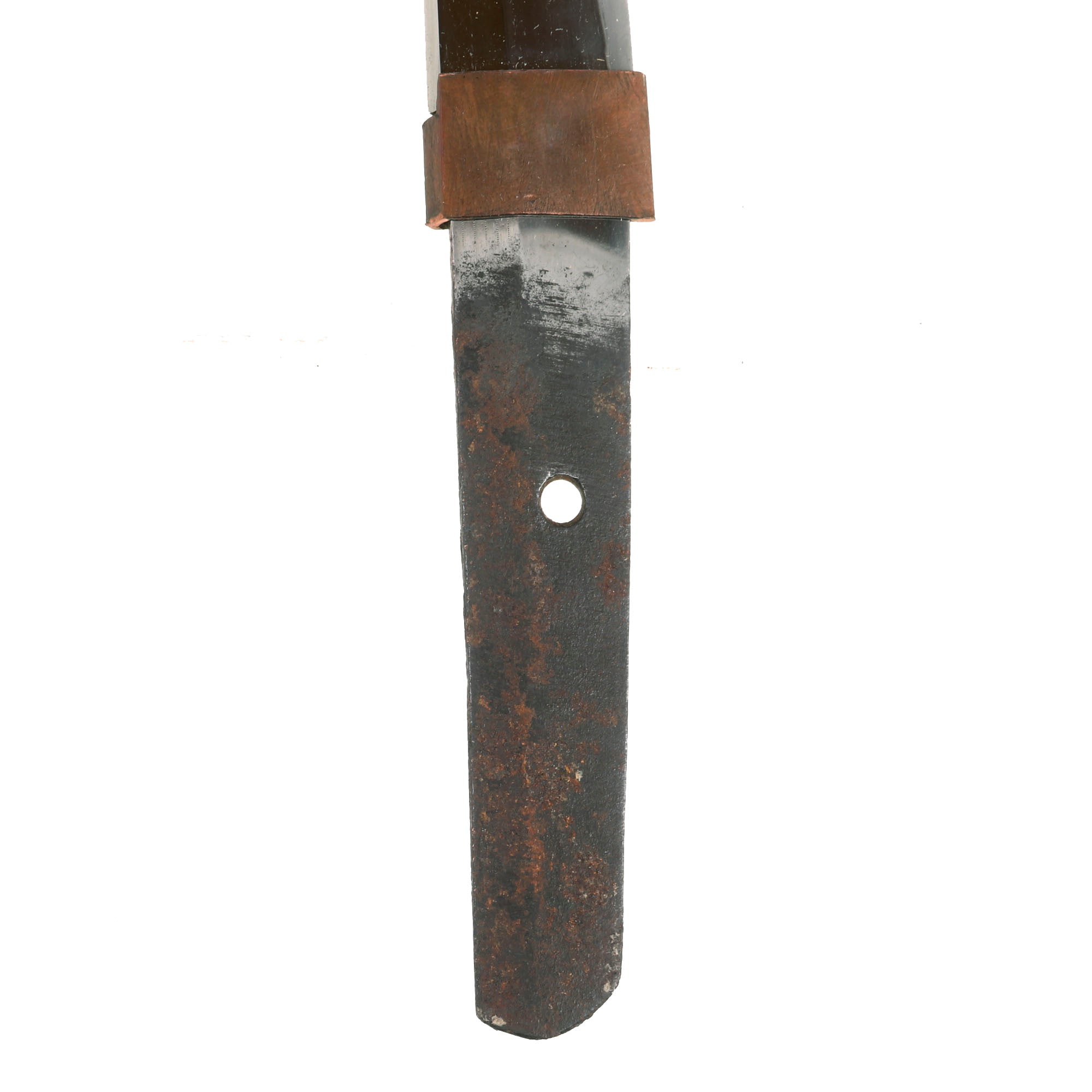As best we can tell, this example dates from the late Muromachi period (室町時代 Muromachi jidai) of 1336 to 1573, most likely the earlier portion. This is part of the period of Japanese swordmaking known as Kotō (古刀"old swords"), the the type of swords that later smiths treated as the goal they needed to achieve. As the blade length is close to that of a Katana, and the blade is the "Shinogi-Zukuri" shape, some would term this an "Ō-Wakizashi". This example has probably been remounted several times, as was common for Japanese blades that are several hundred years old, with the last time probably occurring in the late 19th Century. It was then probably brought back to the US during the WWII era.