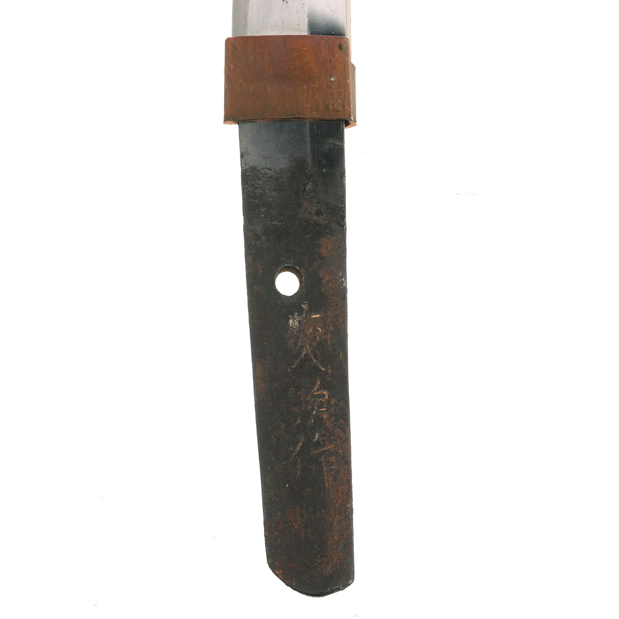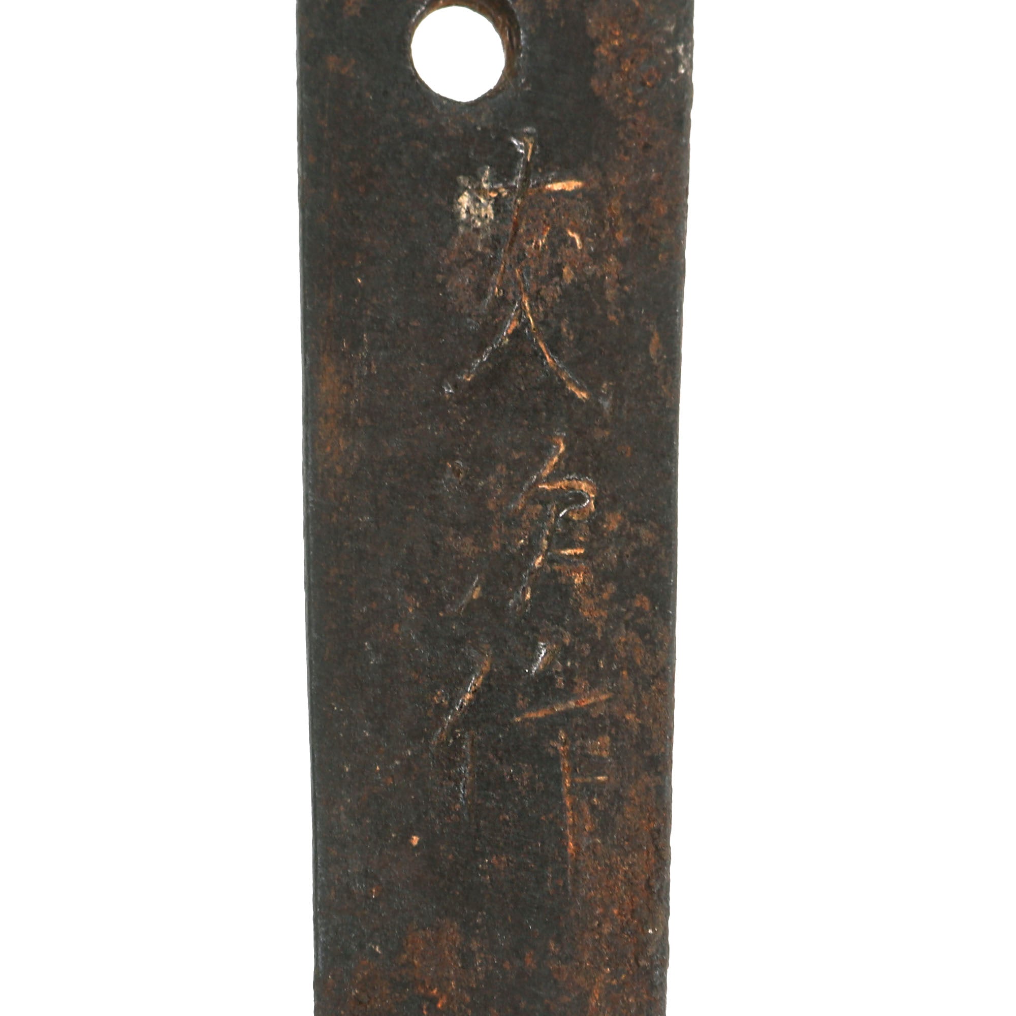 Age and wear have made the YASURIME (鑢目 - file marks) on the tang faint, and given it a lovely patina, with some areas of oxidation scaling. There still is some of the tagane-makura (raised area around the mei) present, and the tagane (chisel marks) faint, however the MEI signature is still relatively easy to read. As best we can tell it reads 友 次 作 - TOMOTSUGU SAKU, or "Tomotsugu made this". This is a very well regarded name and lineage in Japanese sword making, with a history going back into the Muromachi period. We believe this is the one from Echizen province, who was active in the very late Muromachi period, circa 1570. They were a member of the Fujushima school of sword making. There were two others who used this specific three character signature, who made swords slightly earlier. It is a really lovely blade worthy of further research with OSHIGATA signature records.