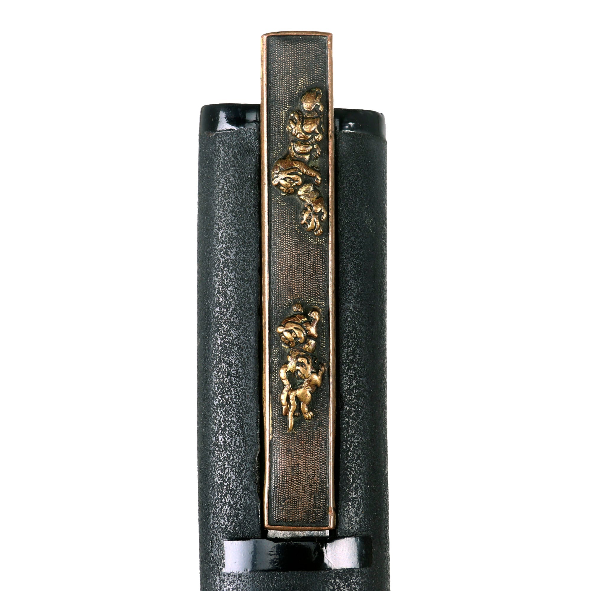 The kogatana knife shows a nice patinated blade, which is still relatively sharp, and has a lovely gilt copper KOZUKA (handle), which shows some brass dog ornamentation on the front.