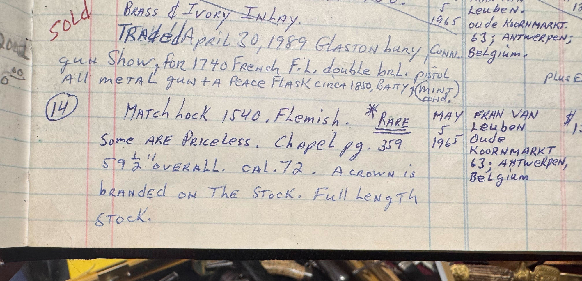 This lovely example had been purchased in Belgium by the previous owner, and a scan of their record book is shown in the pictures. They make a reference to "Chapel pg 359", however we have not been able to obtain this reference material. Charles Edward Chapel wrote several books on antique gun collecting, however they were released in several different formats, so we do not know which book this refers to.