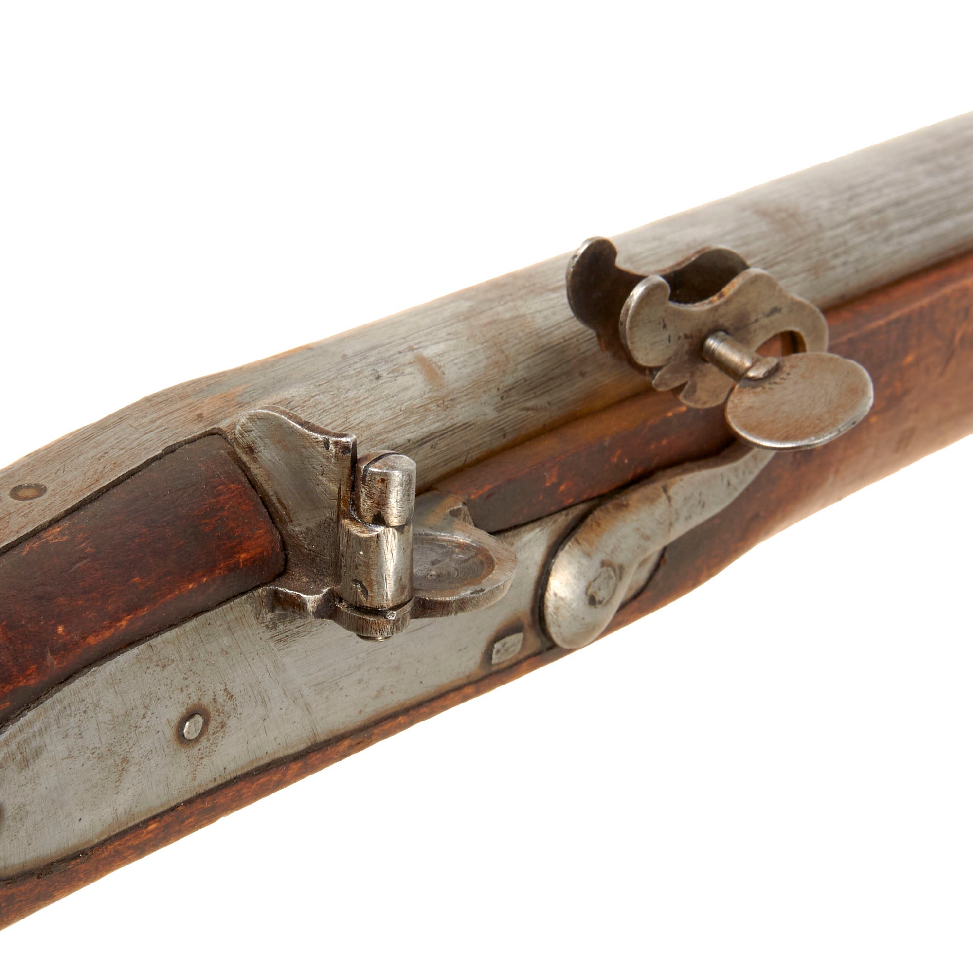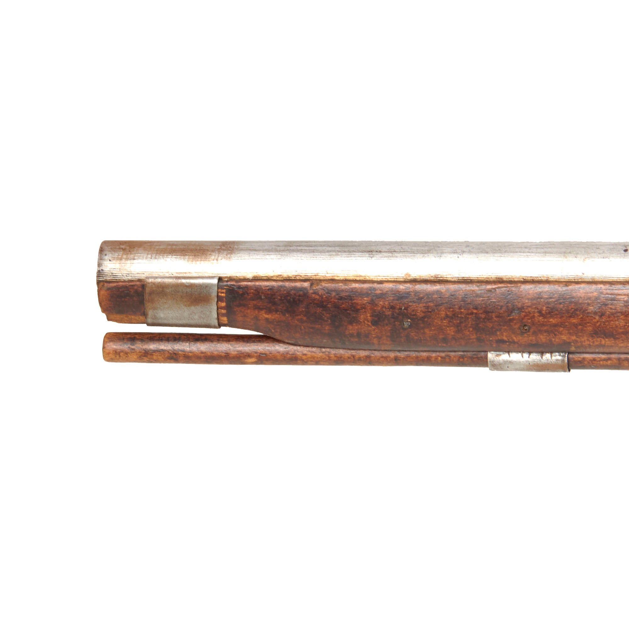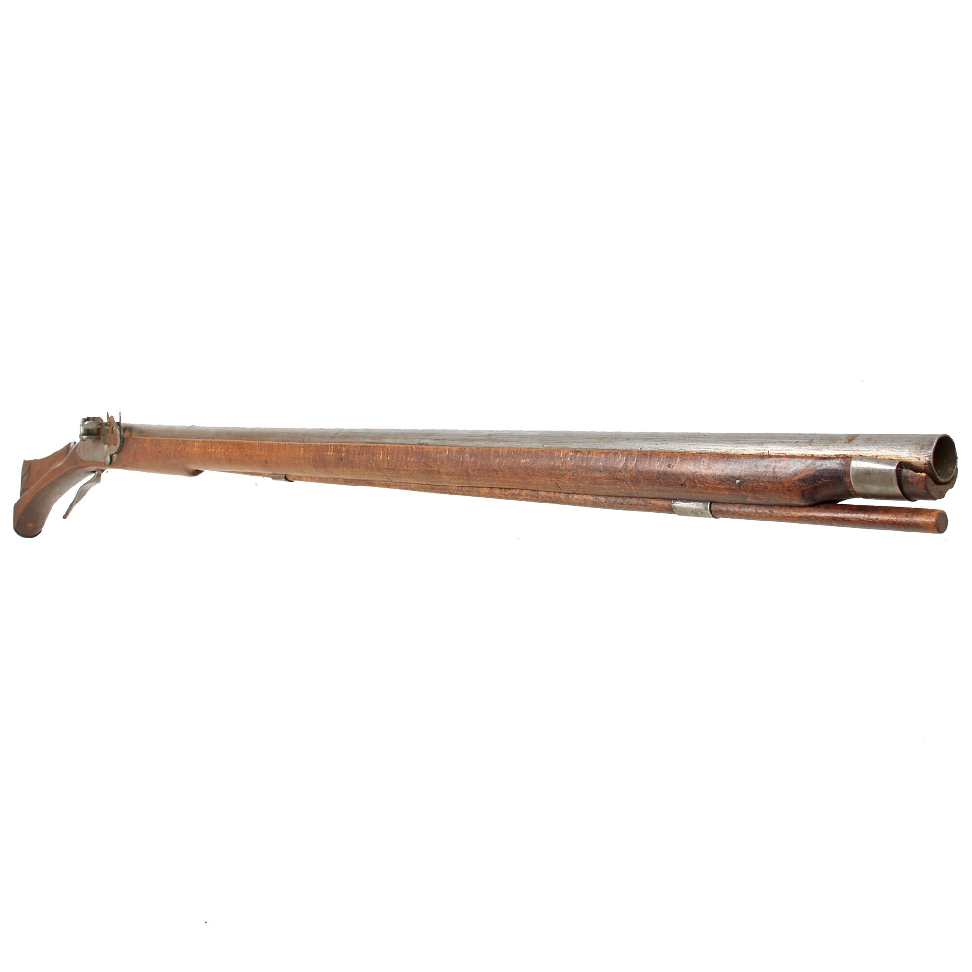 The matchlock simplified this greatly, resulting in a firearm that was much easier to carry around and use effectively. The lock works became more advanced, and by the mid 16th century they were much more reliable, and typically had the form seen here. Some had a "fishtail" style butt stock, but this features a stock closer to the flintlock muskets that would succeed the design. It has a nice "bannister rail" on the top of the butt, with a bent sheet iron butt plate, and sheet iron nose band. The barrel is held in place by pins, much like flintlocks would be later. The style of construction greatly resembles those from the Flanders area of what is today Belgium. It measures 59 1/4 inches long with a 43 1/2 inch long barrel, which measures about .704", or close to 13 Bore.