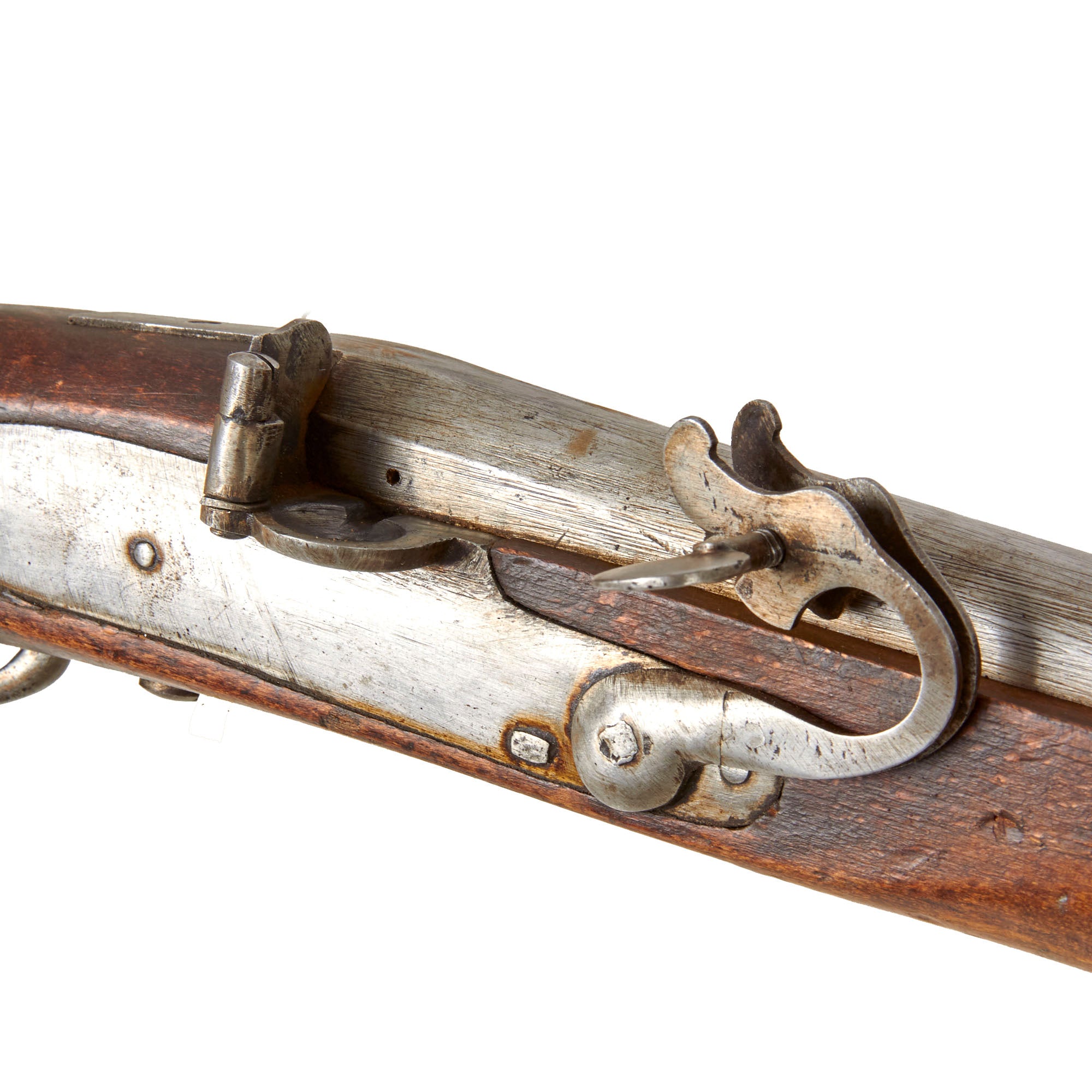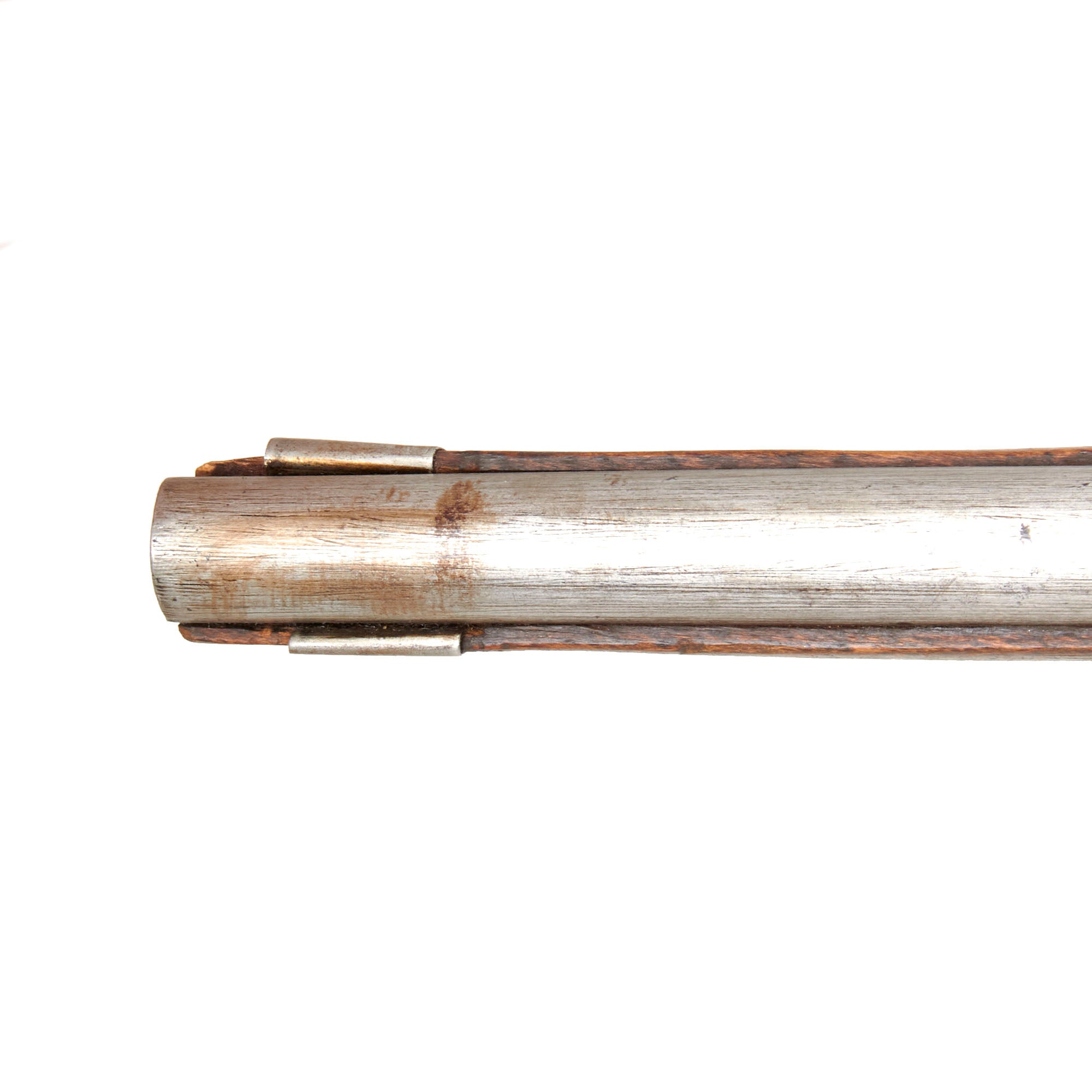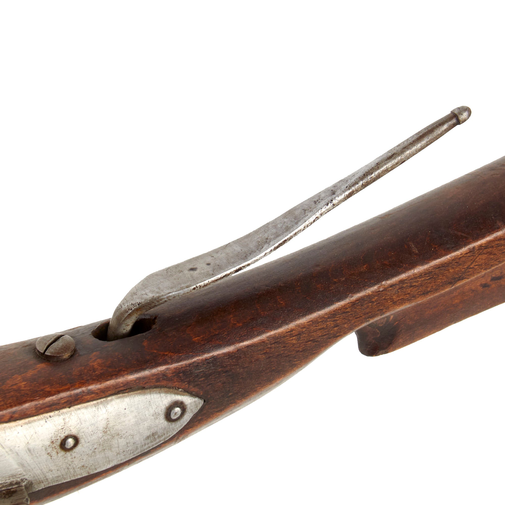 The matchlock simplified this greatly, resulting in a firearm that was much easier to carry around and use effectively. The lock works became more advanced, and by the mid 16th century they were much more reliable, and typically had the form seen here. Some had a "fishtail" style butt stock, but this features a stock closer to the flintlock muskets that would succeed the design. It has a nice "bannister rail" on the top of the butt, with a bent sheet iron butt plate, and sheet iron nose band. The barrel is held in place by pins, much like flintlocks would be later. The style of construction greatly resembles those from the Flanders area of what is today Belgium. It measures 59 1/4 inches long with a 43 1/2 inch long barrel, which measures about .704", or close to 13 Bore.