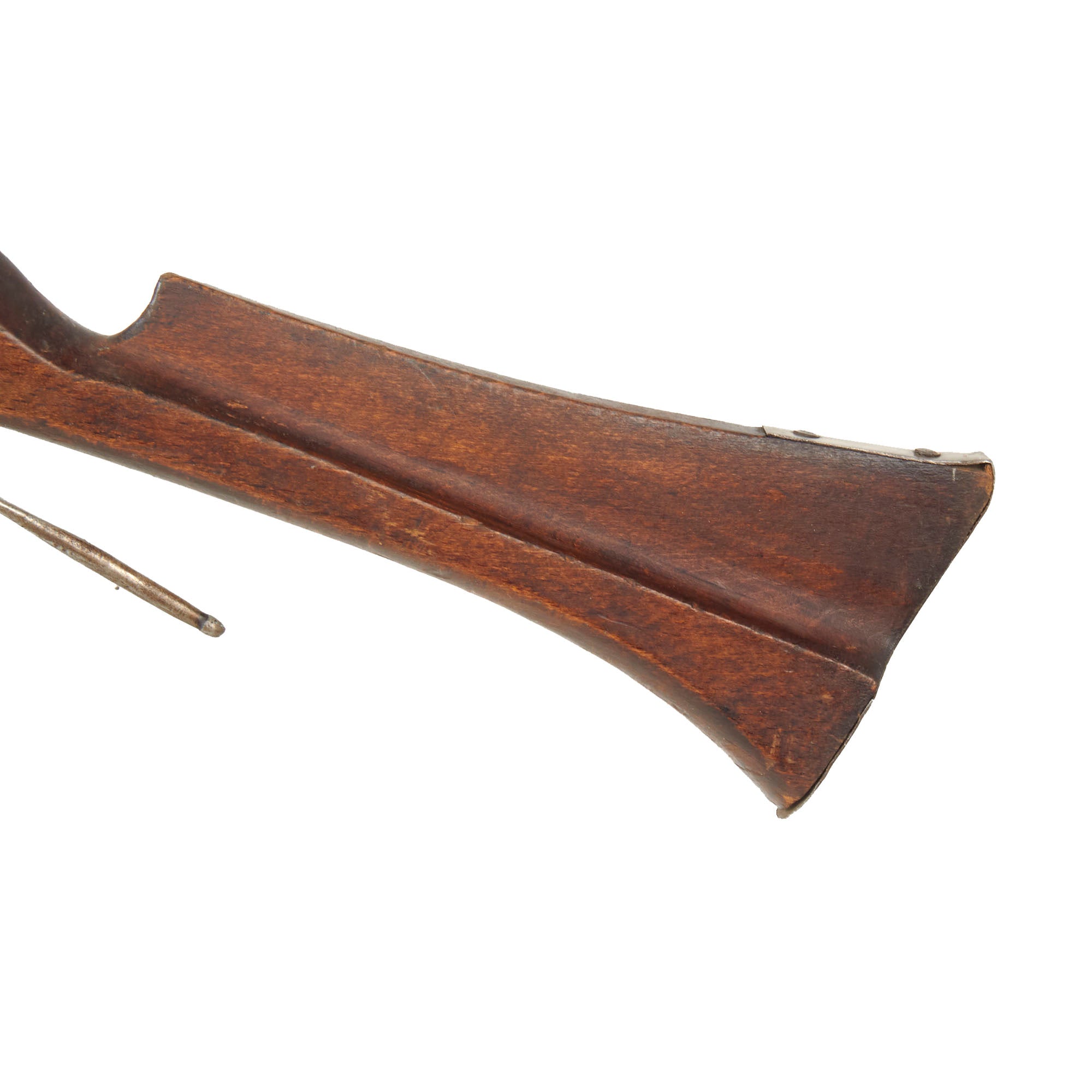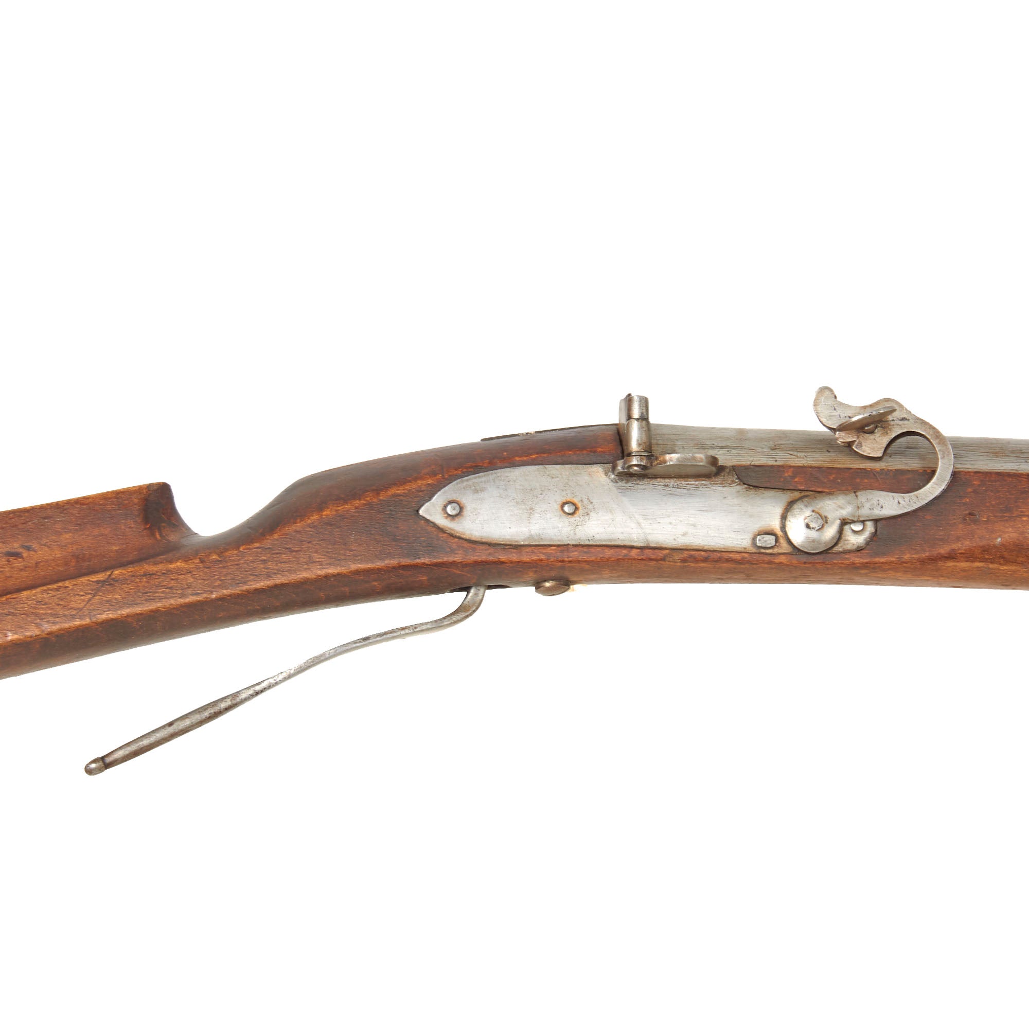 The arquebus is completely unmarked except for a 0 on the wing nut on the cock as well as other number markings on various components. There is a large CROWN over B on the right side of the "bannister rail" on the butt stock. This Cypher could be for any number of different countries, and there were many ranks of European nobility under Kings and Queens who wore crowns, and had them in their cypher. We did some research but were not able to make any definitive identification, and leave this as a lovely research opportunity for the future owner.
