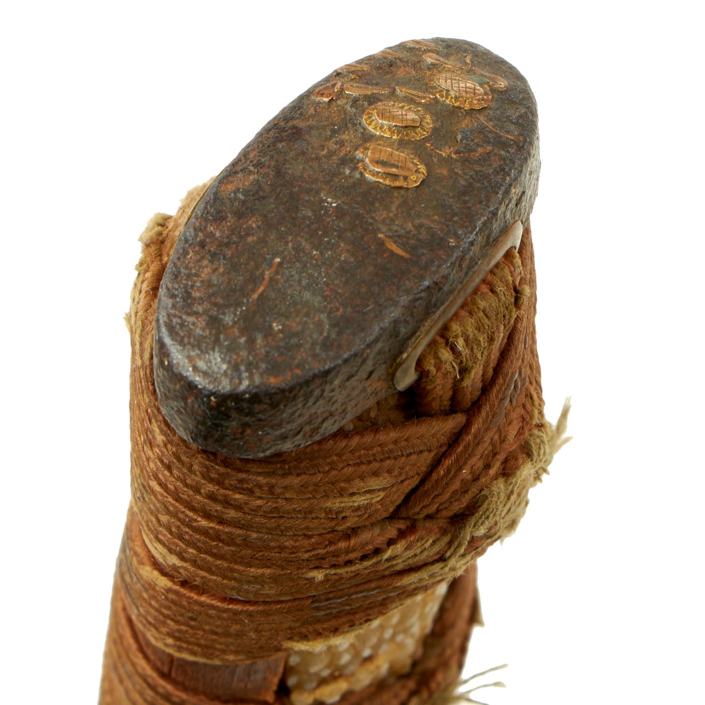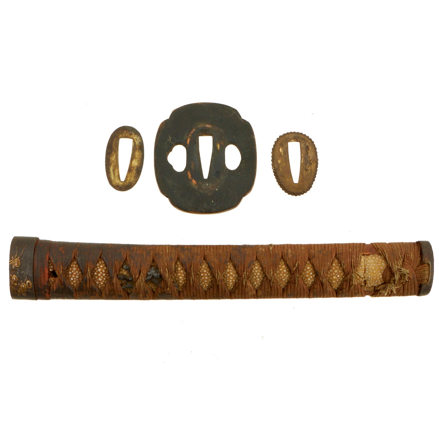 The tsuba (cross guard) is made of bronze and is a "mokko gatta" (quince) shaped style, without any decoration. It has both Hitsu-ana (accessory holes) for both the Kozuka (kogatana handle) and kogai (hair ornament). The fuchi (collar) for the tsuka (handle) is iron, as is the Kashira (End Cap), and both have some brass ornamentation in the form of flowers, which match. The stingray (Sa-Me) grip with complete Ito (cloth binding) is worn, but still in good condition. There are lovely horse menuki (grip ornaments) on each side of the tsuka.