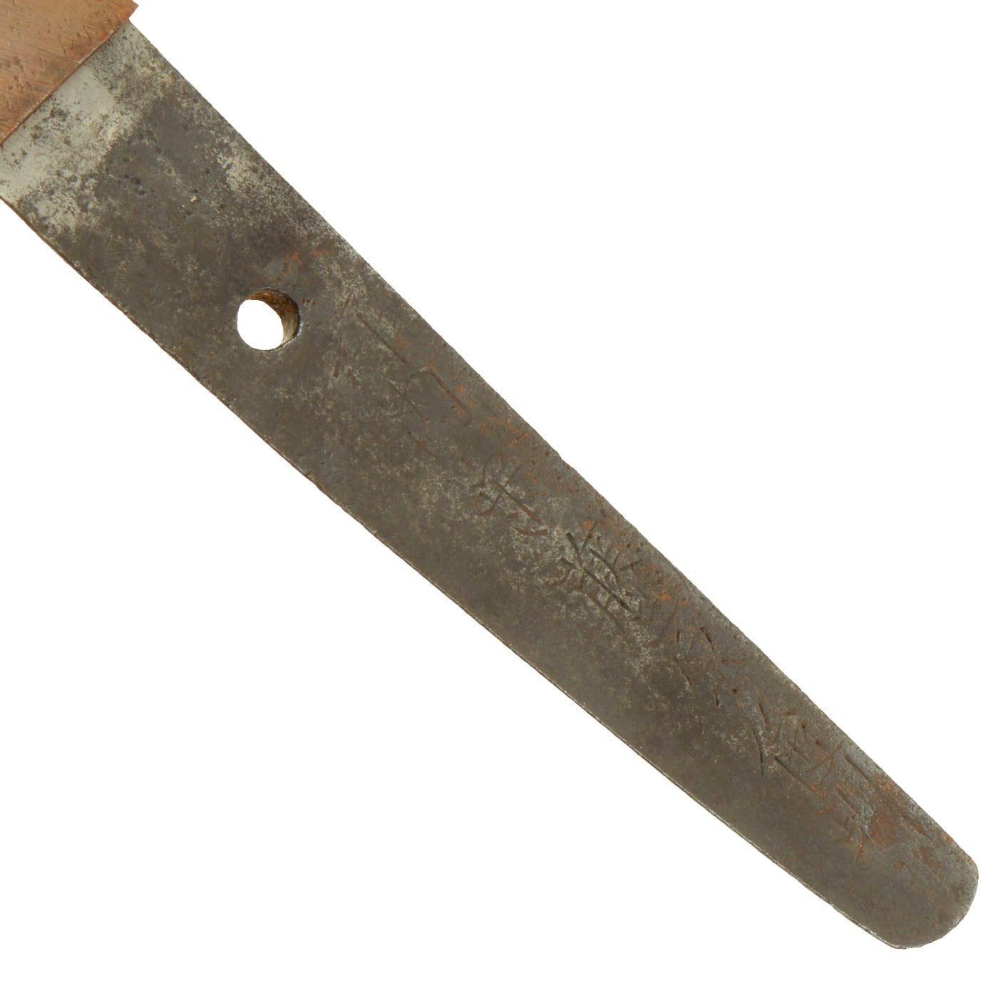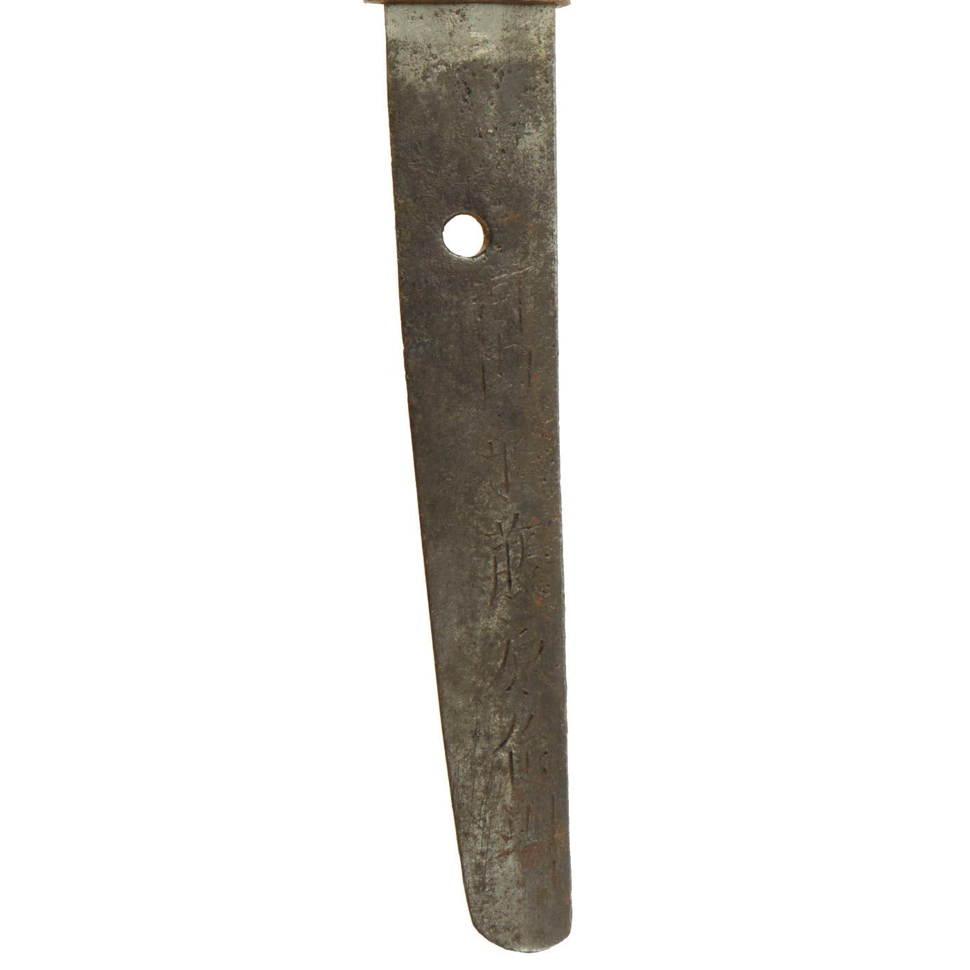 This example has most likely been remounted several times, as was common for Japanese blades. This has made the file marks and signature on the tang somewhat faint, however we are confident in our reading of the MEI.