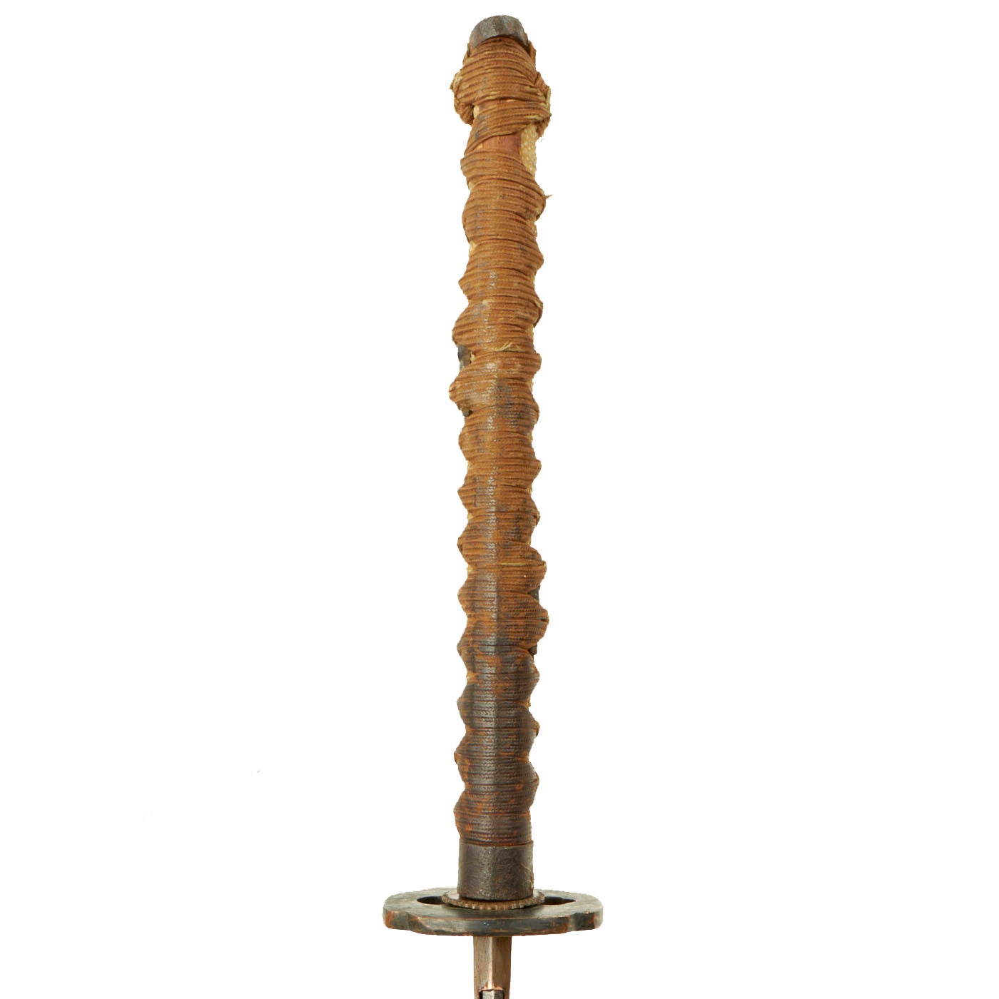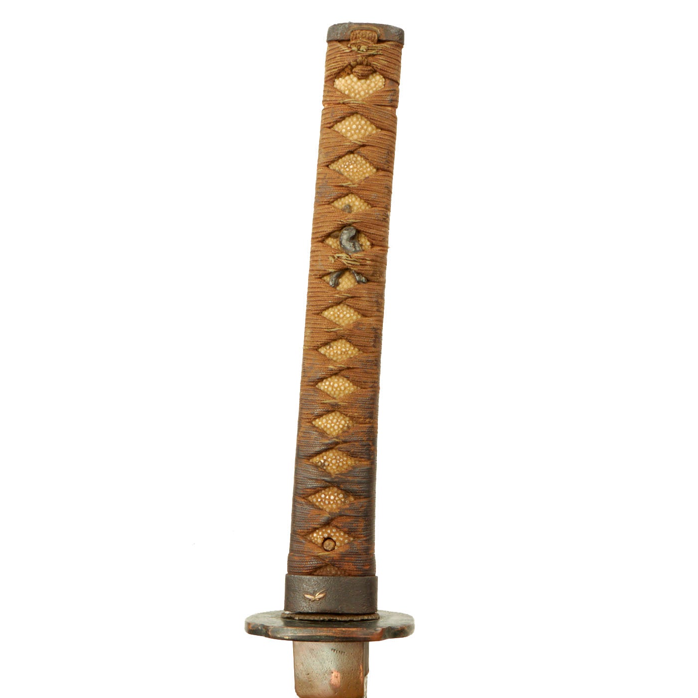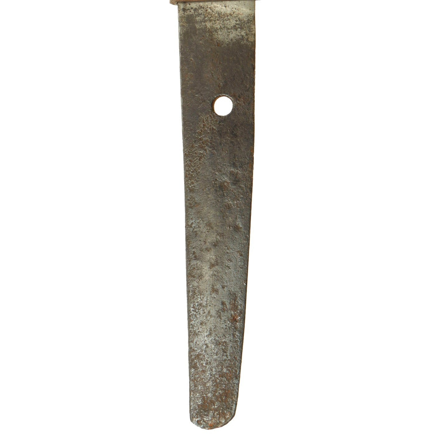 The Blade of this example is 23 inches long, and unfortunately saw much use and cleaning since the last polish. This has unfortunately completely removed the polish, and the geometry of the blade is no longer sharp, especially the SHINOGI (blade ridge), which is now somewhat rounded. This also means that other aspects such as the hamon and hada are no longer visible. The tang (nakago) is of the Futsu 普通 (regular) style with a Haagari (asymmetrical rounded) nakago-jiri. It also has a copper Habaki (blade collar), which is typical of the Edo period. Overall length of this wakizashi is 33 1/4 inches.