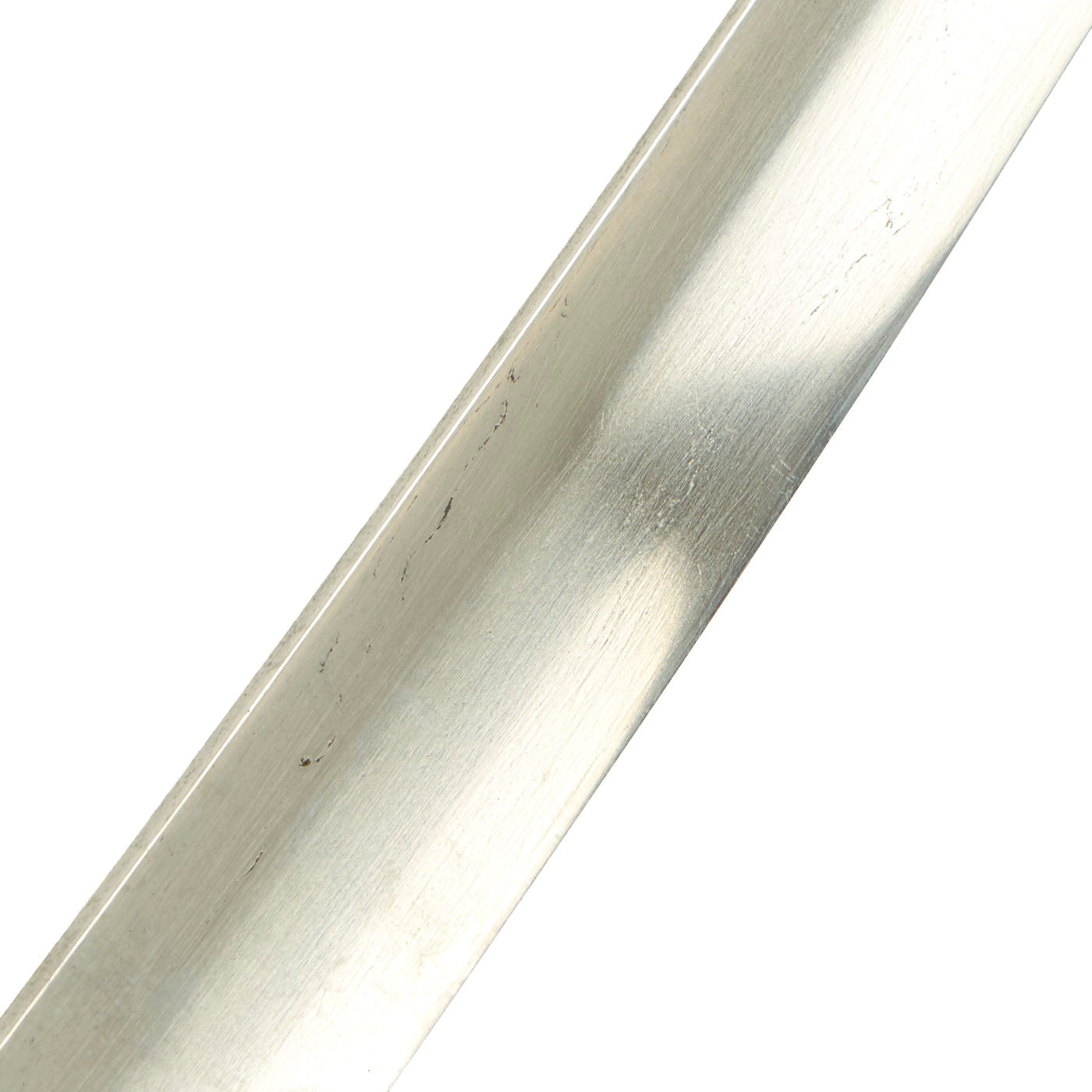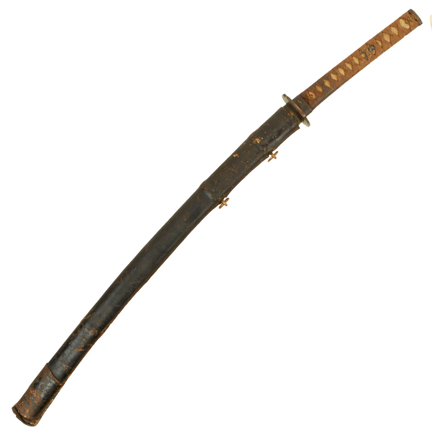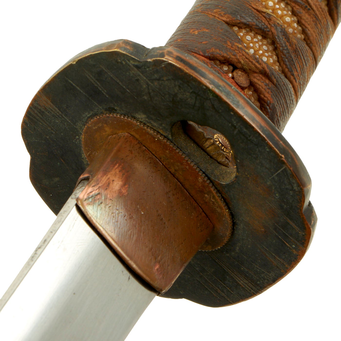 The included saya (scabbard) is brass fitted wood, and looks to be late 19th century, possibly Russo-Japanese war era. It has two brass hanger rings, and is covered with a leather scabbard cover, with a snap at the top. This is very similar to the WWII style, so it is also possible that it saw use during WWII, which may explain how the blade got so worn.
