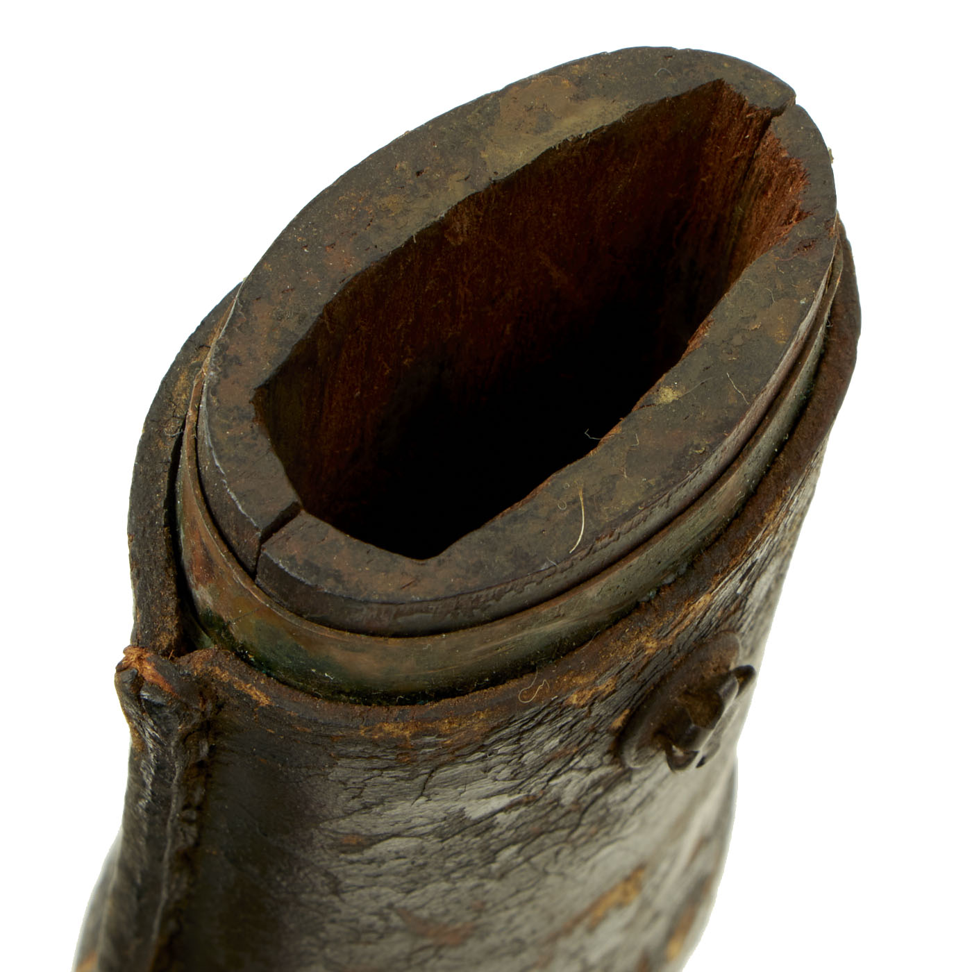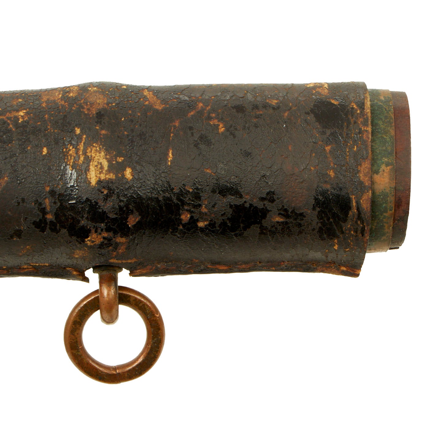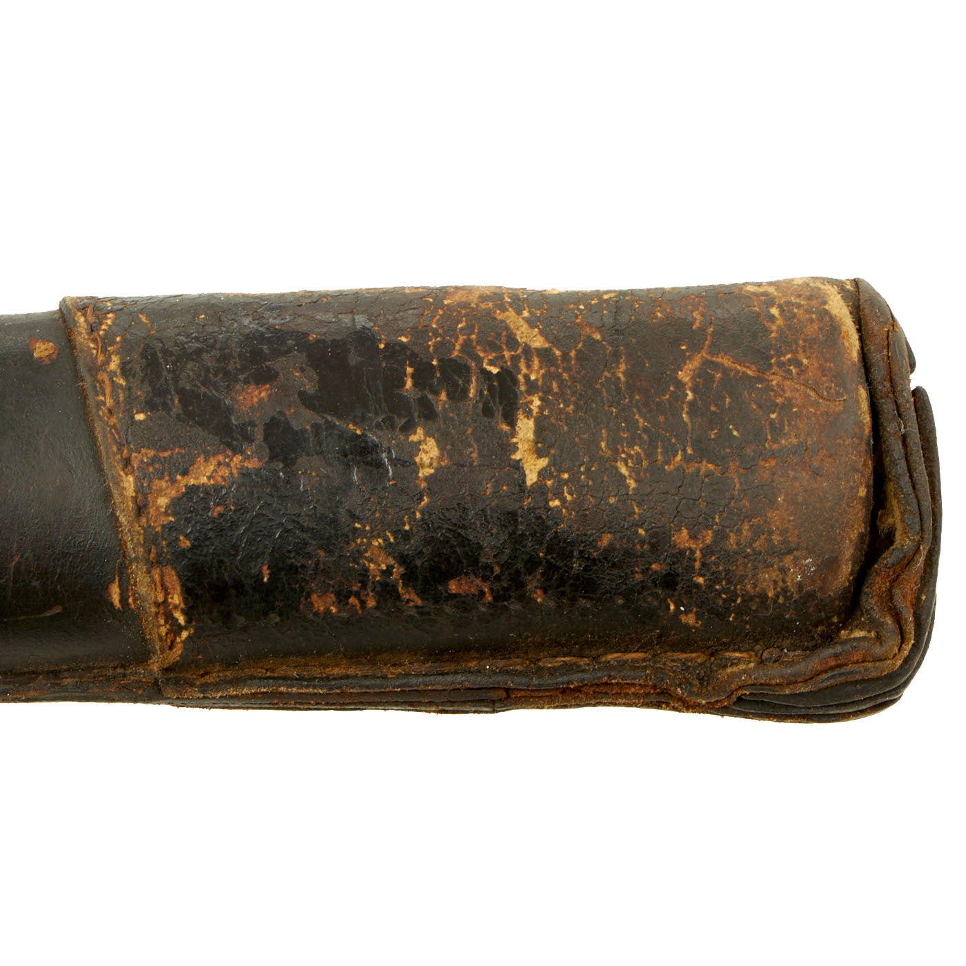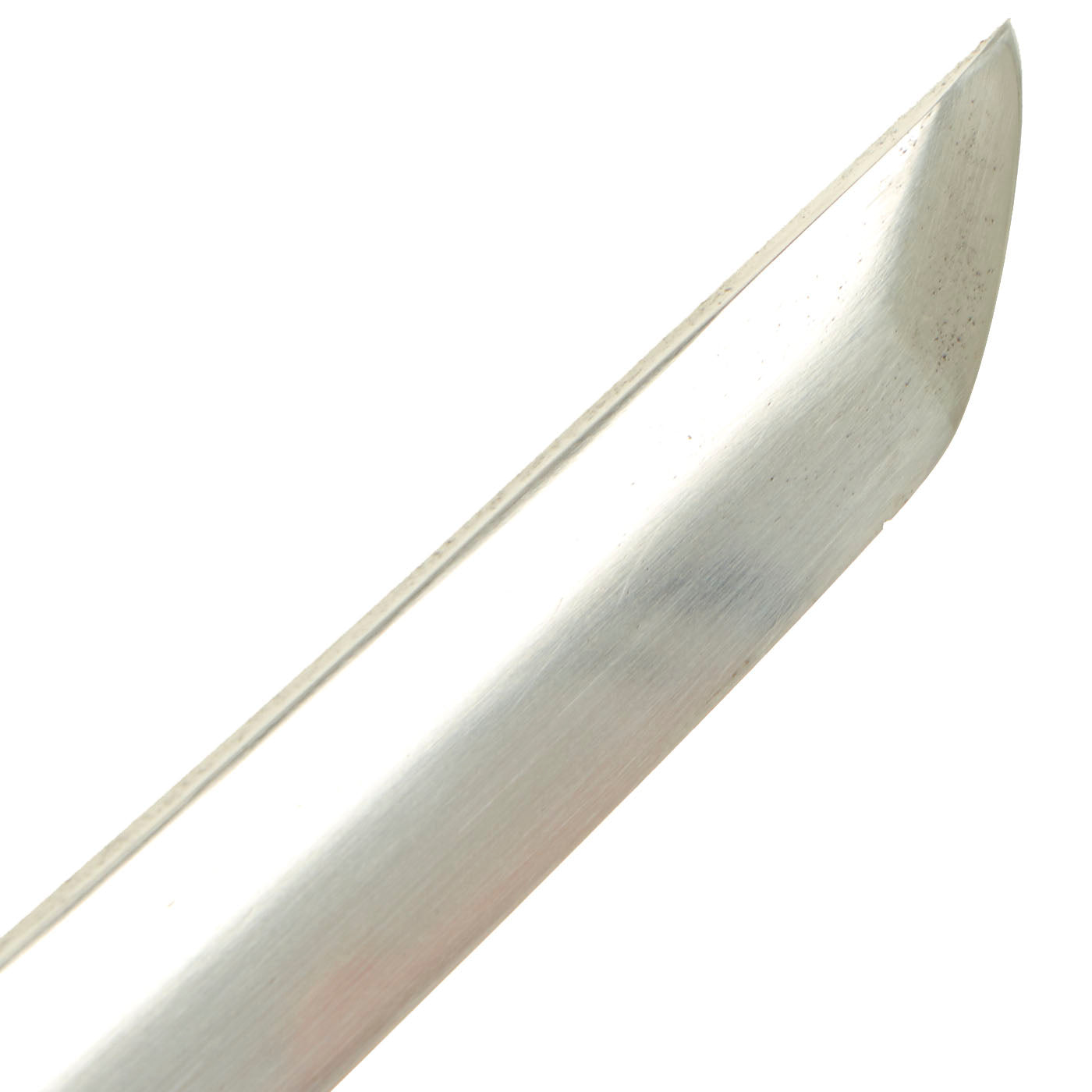 The included saya (scabbard) is brass fitted wood, and looks to be late 19th century, possibly Russo-Japanese war era. It has two brass hanger rings, and is covered with a leather scabbard cover, with a snap at the top. This is very similar to the WWII style, so it is also possible that it saw use during WWII, which may explain how the blade got so worn.