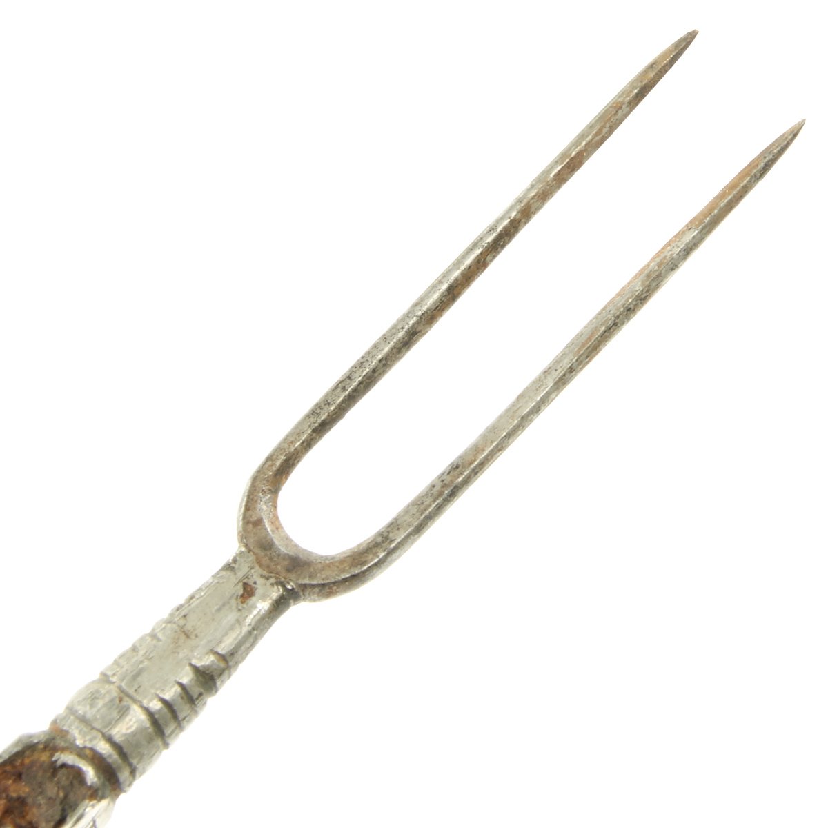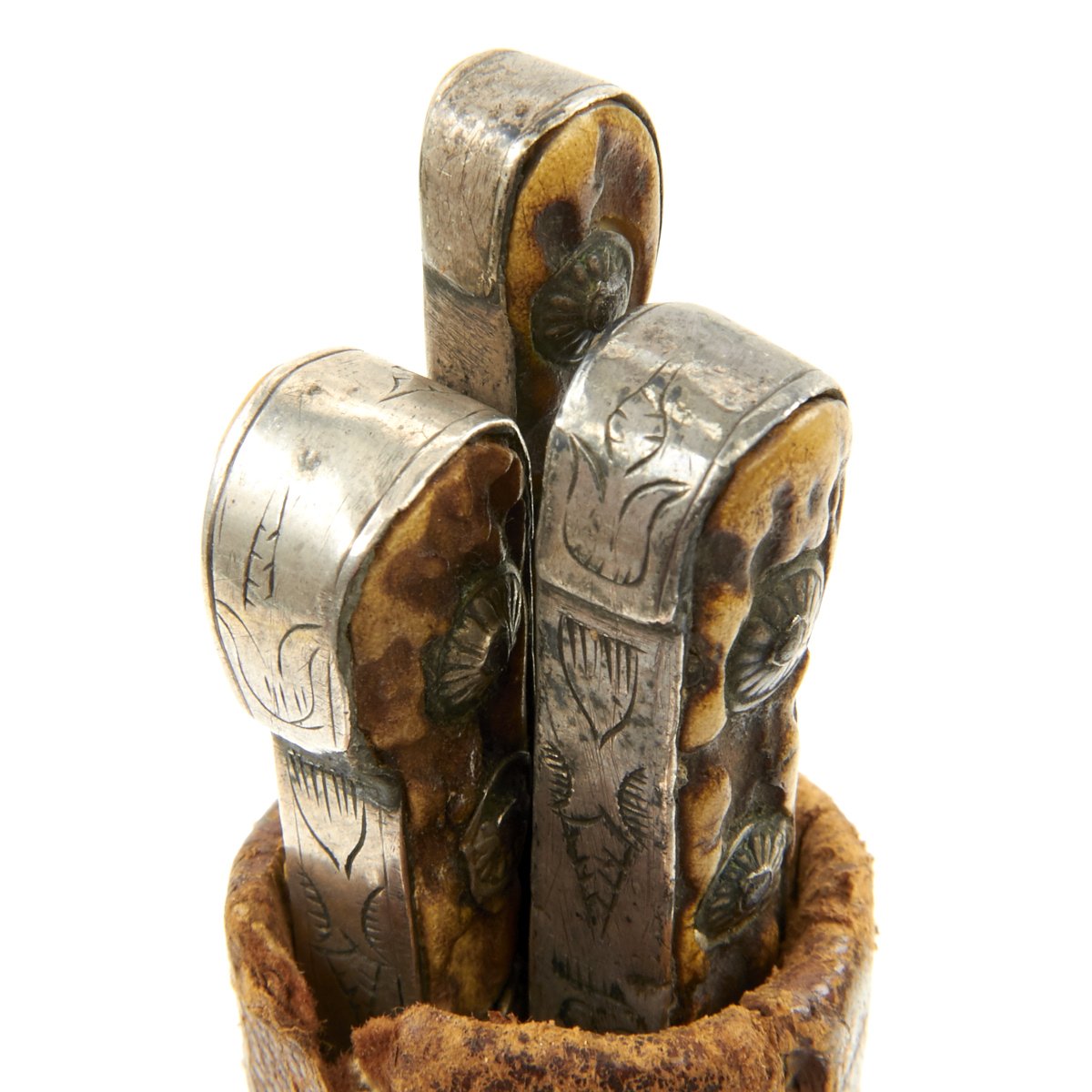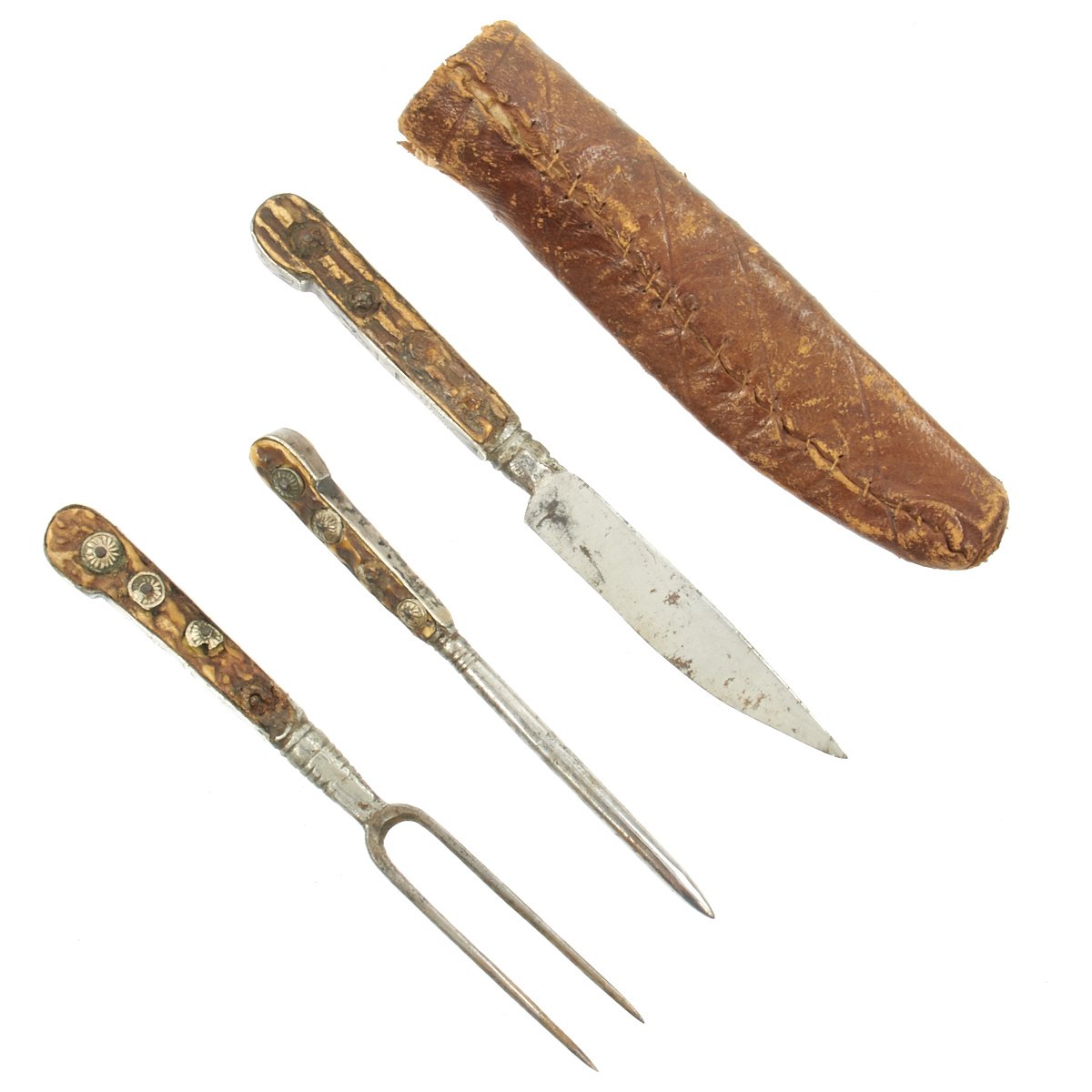 Original Items: One Set Only. Contained in its original leather scabbard this is a "HUNTING TROUSSE," a set of implements to help prepare game animals. This is a three piece set of knife, fork and sharpening steel for disjointing slaughtered game, and then most likely used to eat it once cooked it over a camp fire. This trousse features Stag Horn grip plates secured by decorative rosettes and appear to be mounted in engraved silver bearing the initials W. S..