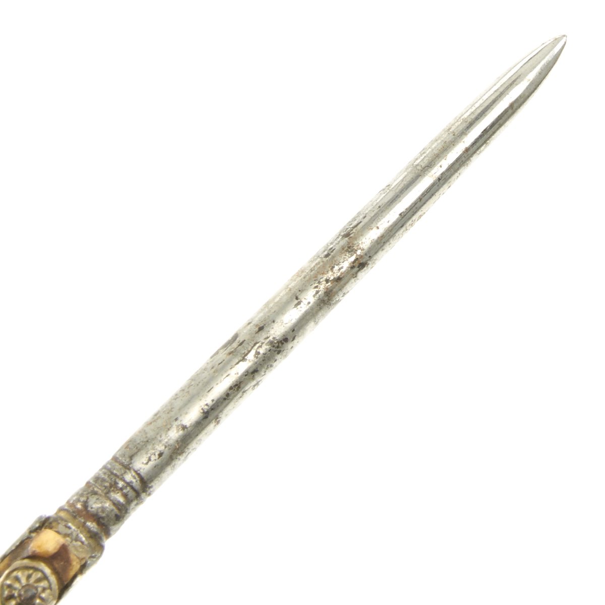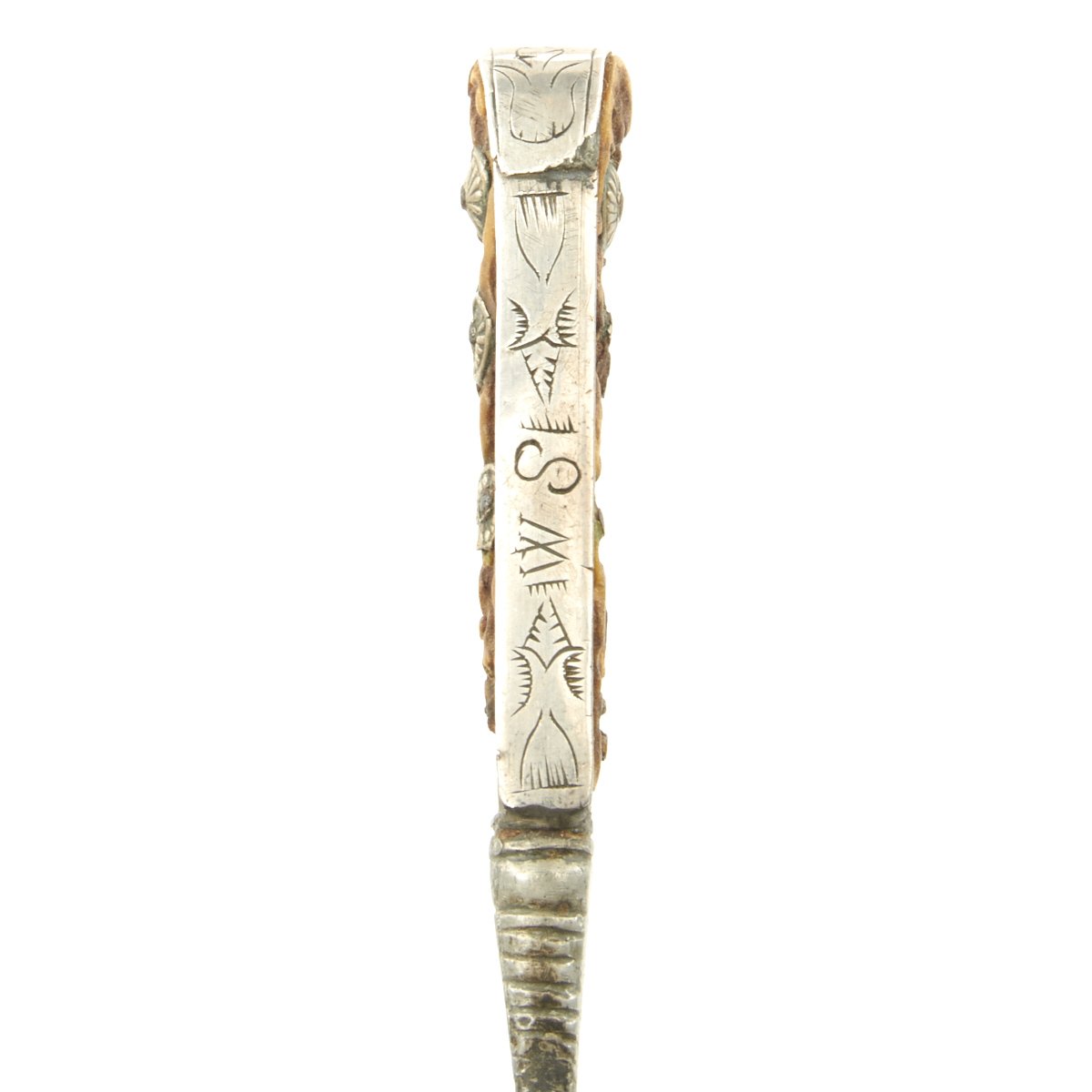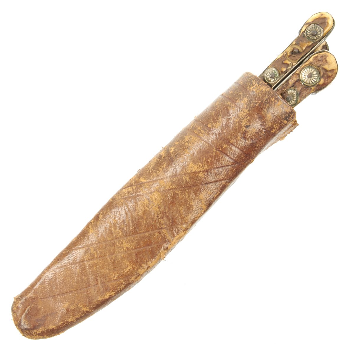 Original Items: One Set Only. Contained in its original leather scabbard this is a "HUNTING TROUSSE," a set of implements to help prepare game animals. This is a three piece set of knife, fork and sharpening steel for disjointing slaughtered game, and then most likely used to eat it once cooked it over a camp fire. This trousse features Stag Horn grip plates secured by decorative rosettes and appear to be mounted in engraved silver bearing the initials W. S..