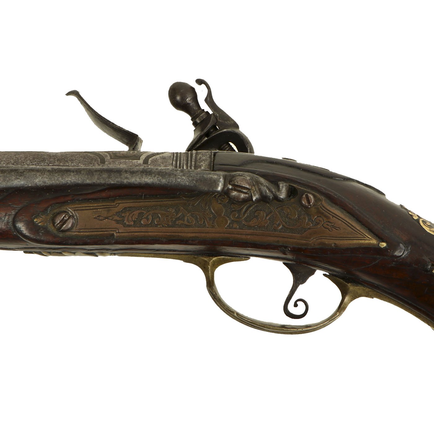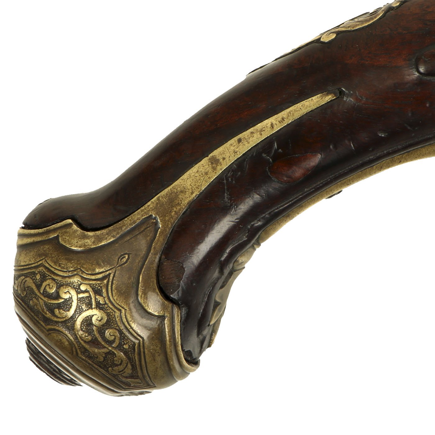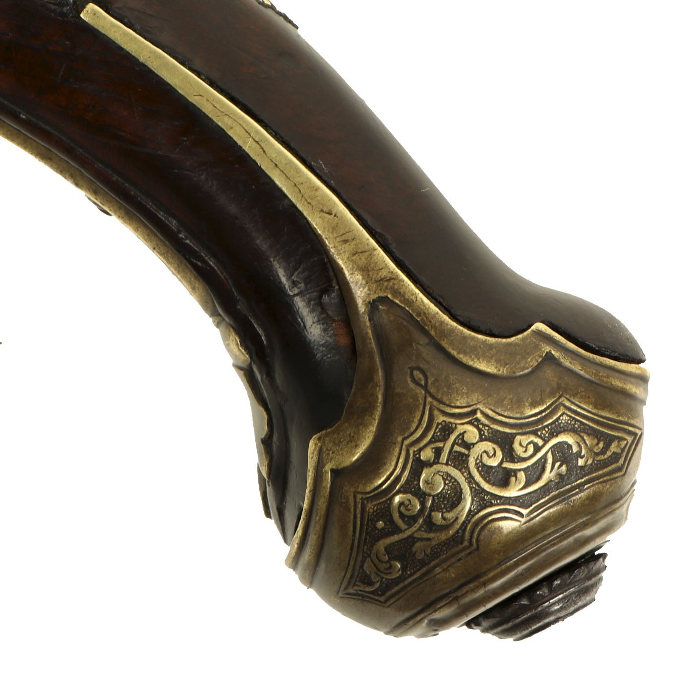 The pistol is quite slender, measuring 20 inches in overall length, with a 14 1/2 inch 0.51" bore barrel. It has a 4 3/4" long hook on the left hand side, which was used to attach the pistol to the belt or trousers, very handy when riding on horseback. The lock does not have a makers name, but it does have a very nice engraved brass inlay. The rest of the lock is engraved as well, as are almost all of the brass fittings. The rear of the grip features a nice escutcheon, which has the image of a woman in the middle.