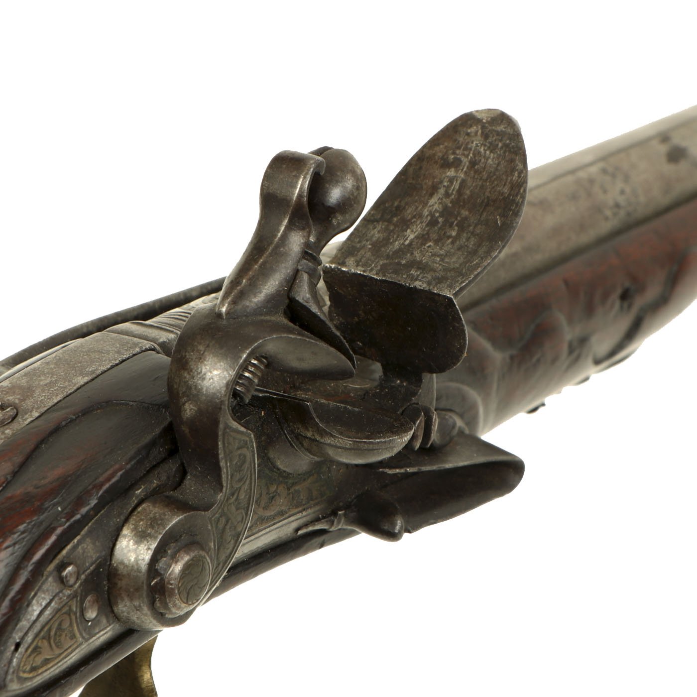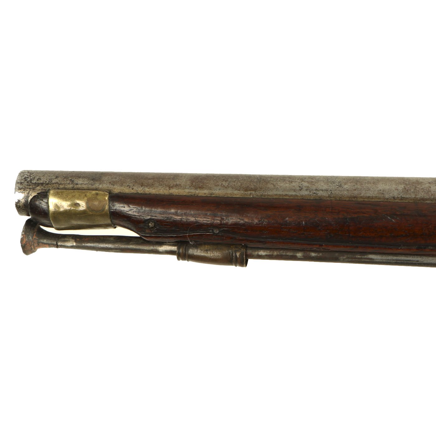Condition of the the pistol is very good, though it does show age. The wood has shrunken a bit, so many of the fittings are a bit loose. The lock functions, but it will fire at half cock with a strong trigger pull. It has what looks to be the original iron ramrod still installed, but there is a crack partway through near the end.