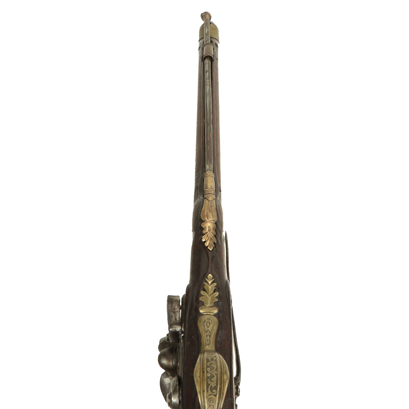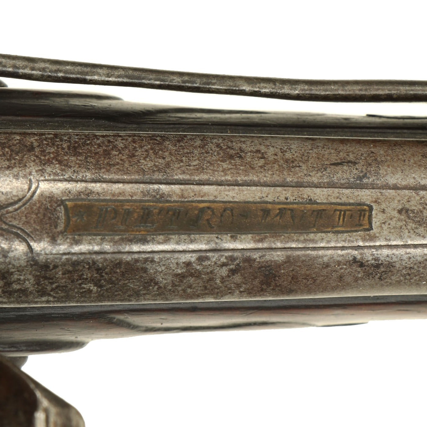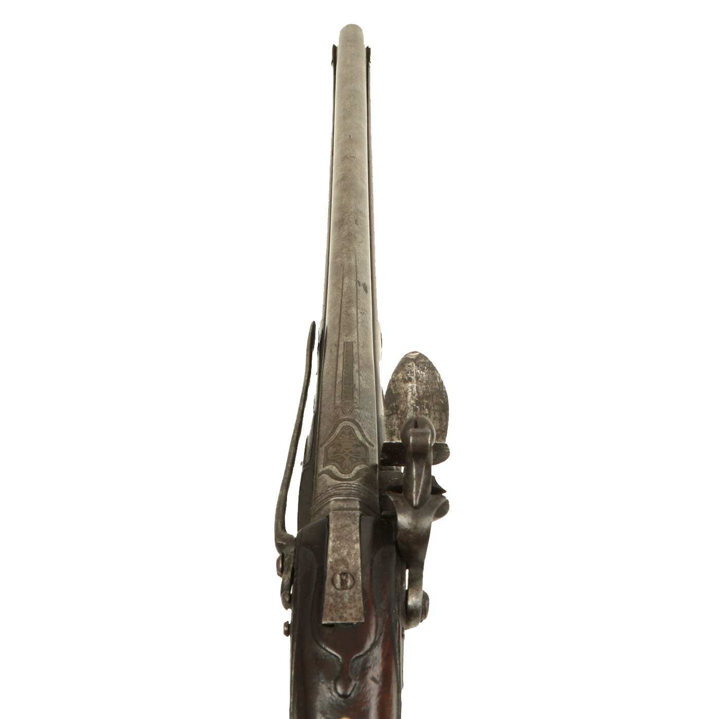 Original Item: Only One Available. The Mutti family of Brescia in Italy were well known gunmakers in 17th-18th Century Italy, including Sperandio, Pietro, and others. This fine Long flintlock horse pistol was made by Pietro Mutti in Brescia, and the style is typical of around 1690. The top of the upper barrel is marked *PIETRO *MVTTI in a brass insert, and the rest of the fittings are all of brass as well.