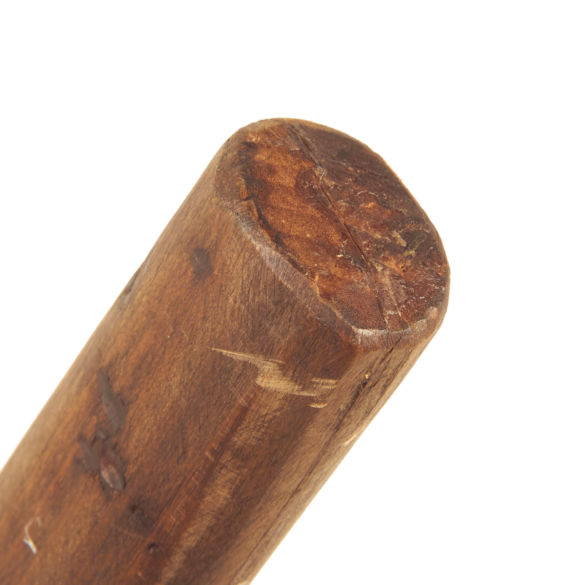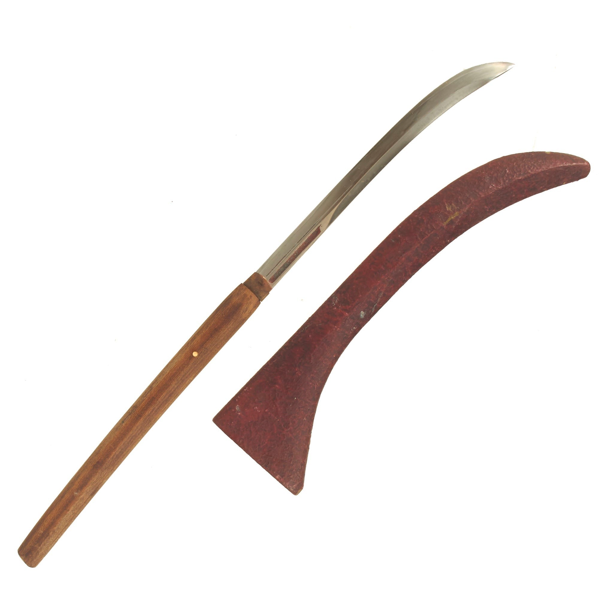 The fittings of the naginata are quite simple, with a two piece "Resting" handle, which looks to probably be mid 20th century. This was probably a WWII or post WWII bring back item. The blade has a copper HABAKI, which looks to be quite old, and is typical of Edo period blades. The blade is held in place by a single bamboo MEKUGI (peg), which is recently made.