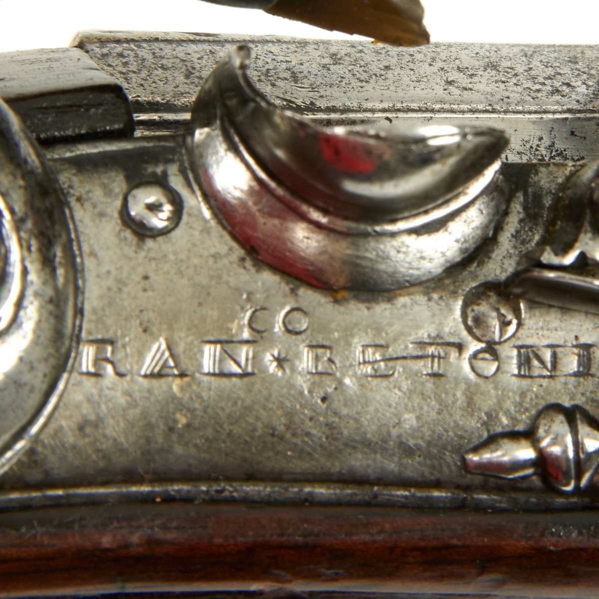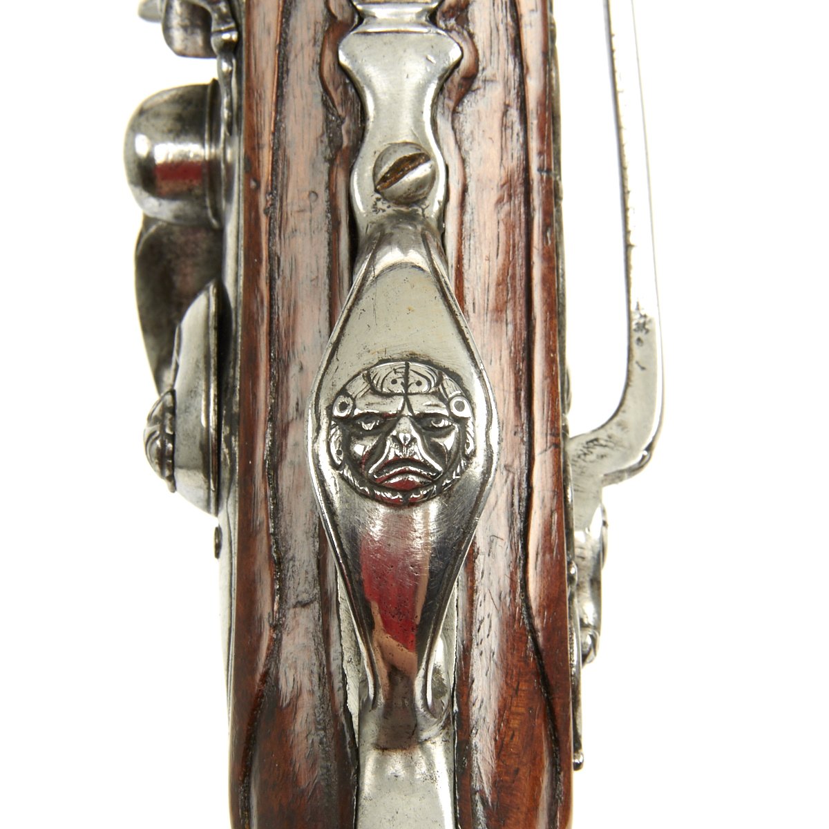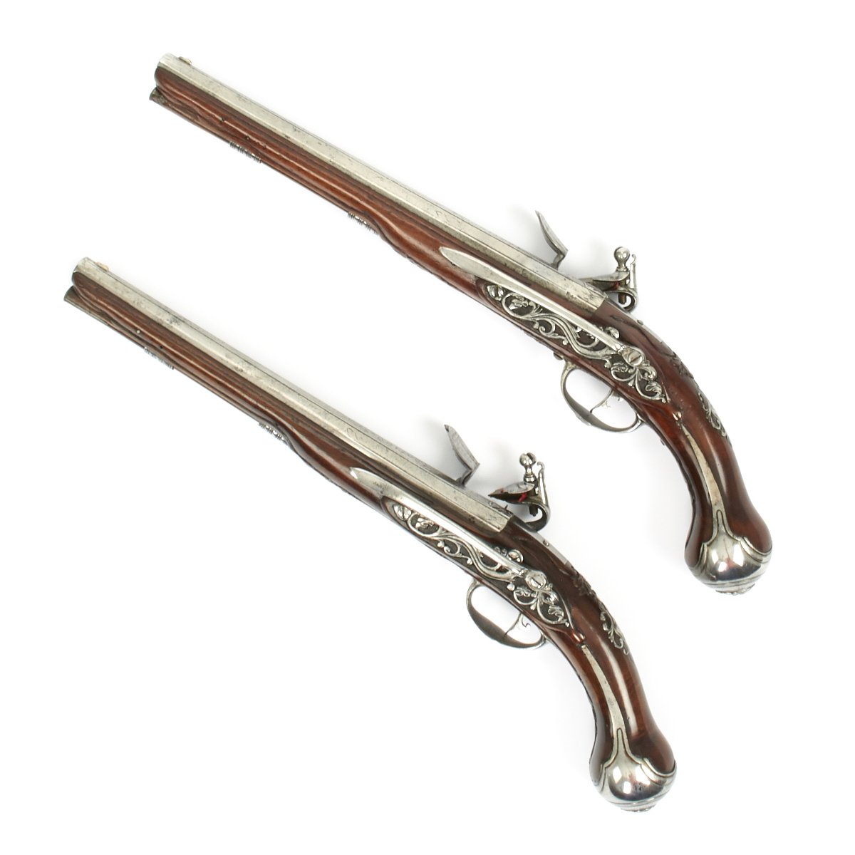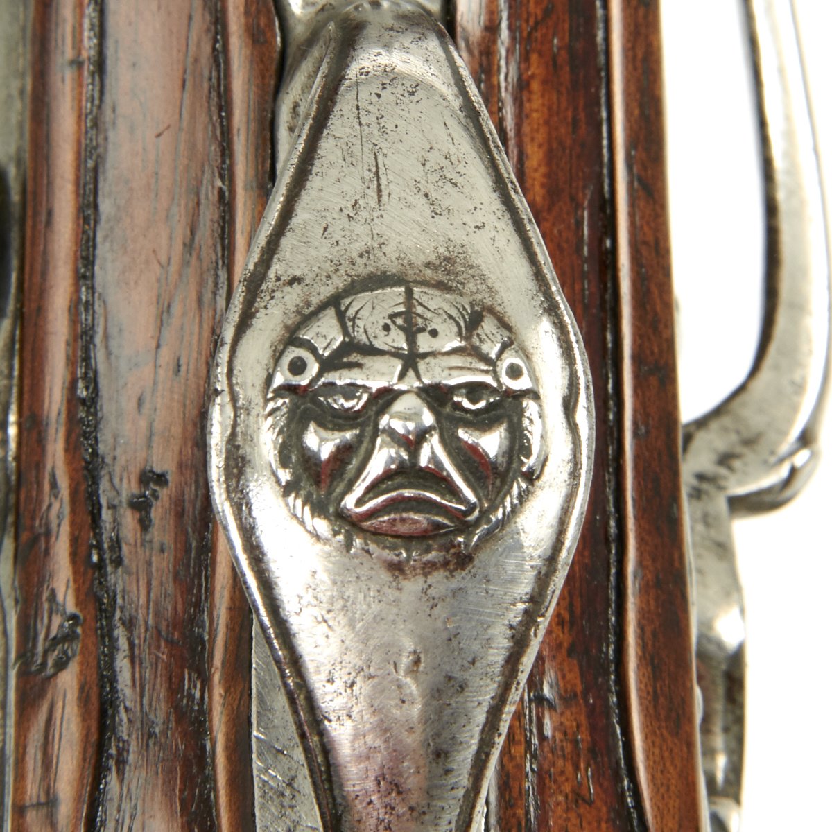 Overall 17" in length with 10 7/8" barrels, the tangs of which are secured with screws arising from under the trigger guards, a very good indicator of early production. They have openwork fretted side plates, again with the "monster motif" beneath 5" belt hooks for easy carriage at sea or elsewhere.