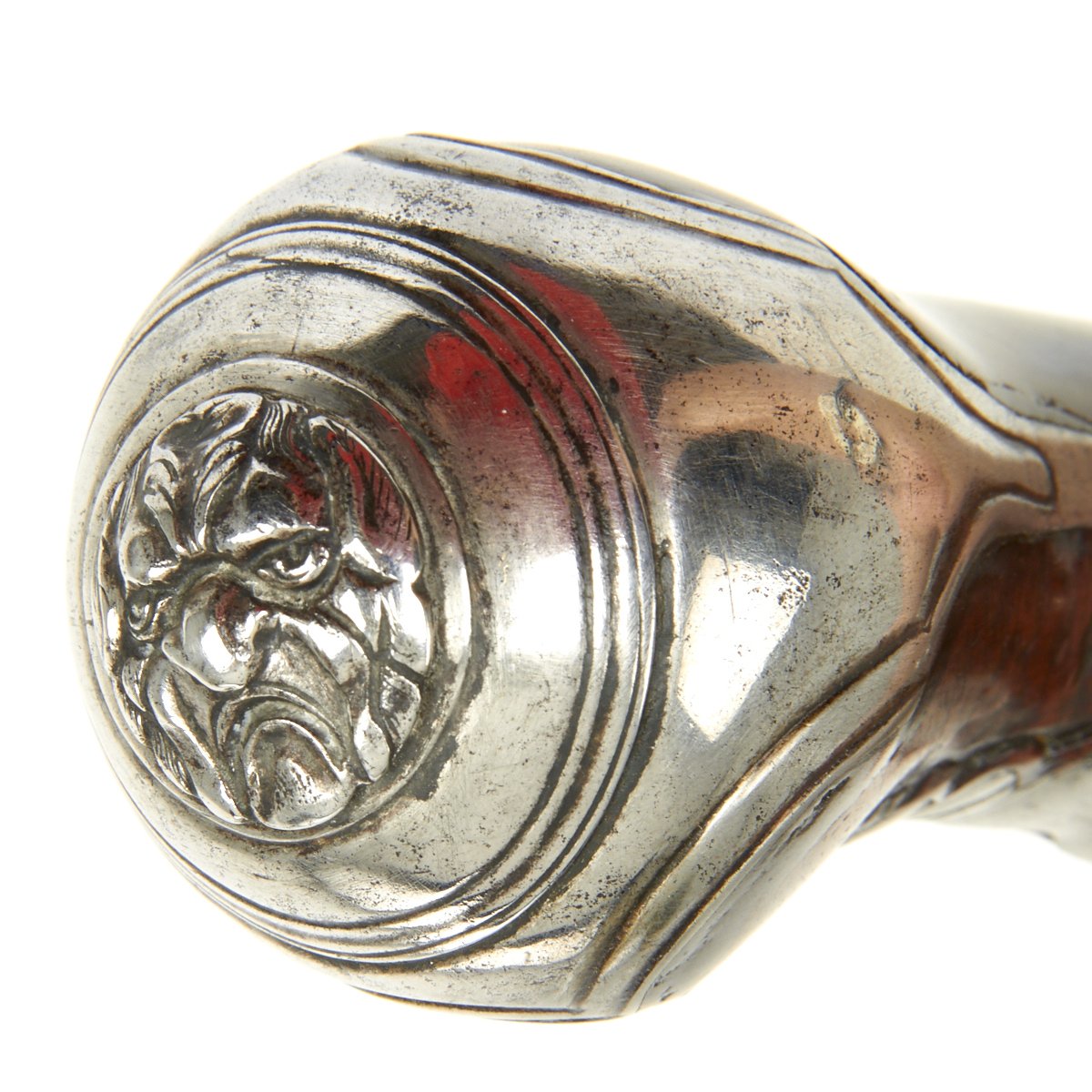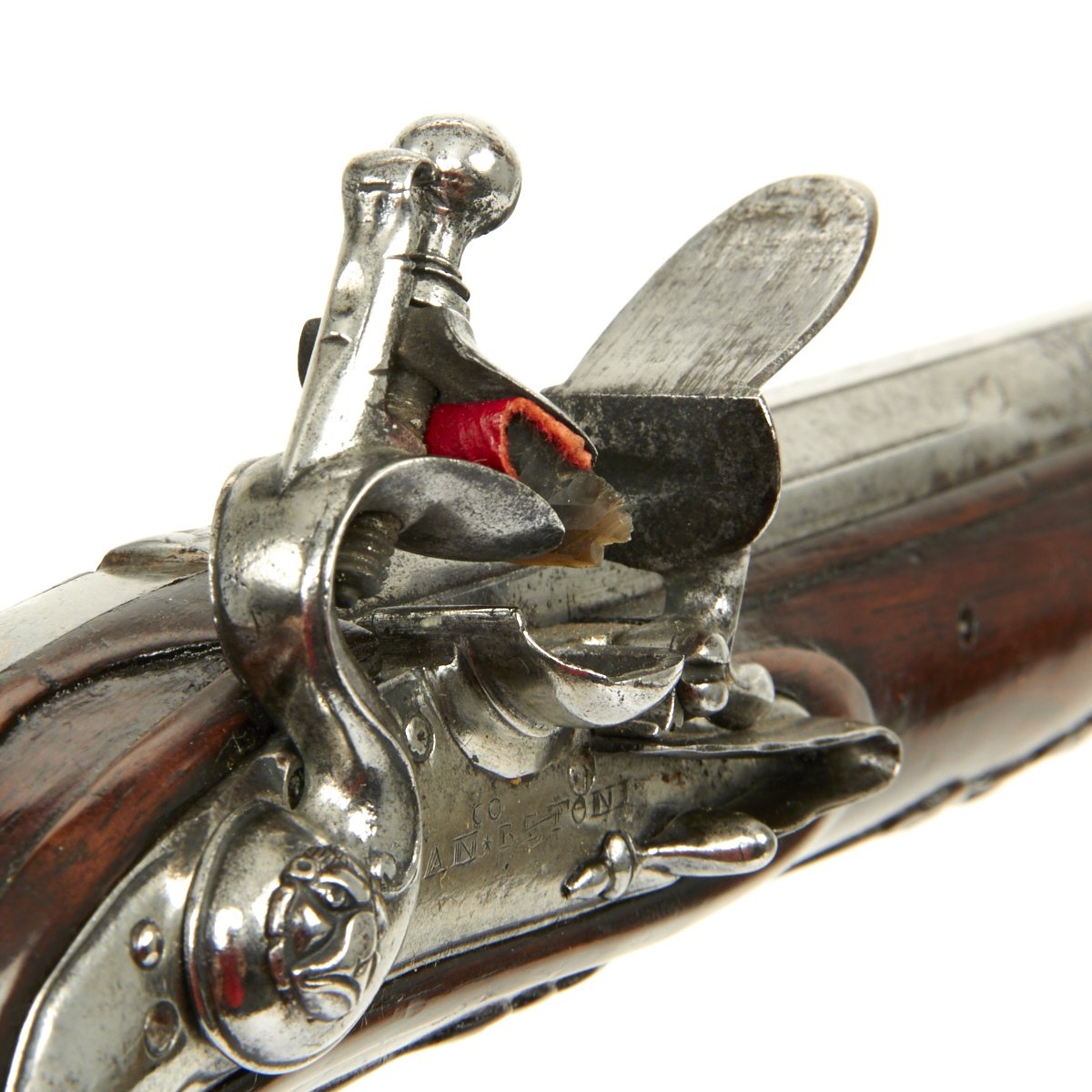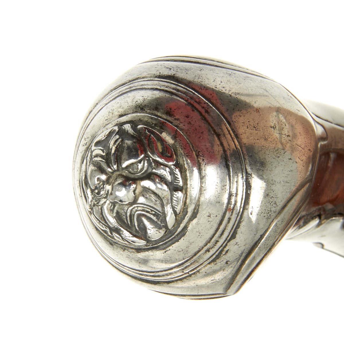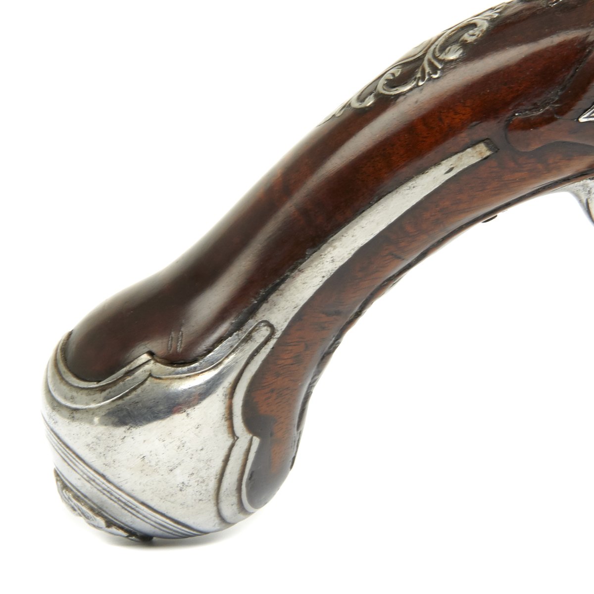 Overall 17" in length with 10 7/8" barrels, the tangs of which are secured with screws arising from under the trigger guards, a very good indicator of early production. They have openwork fretted side plates, again with the "monster motif" beneath 5" belt hooks for easy carriage at sea or elsewhere.