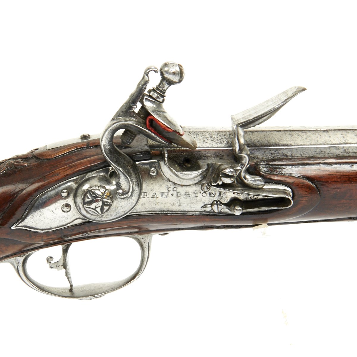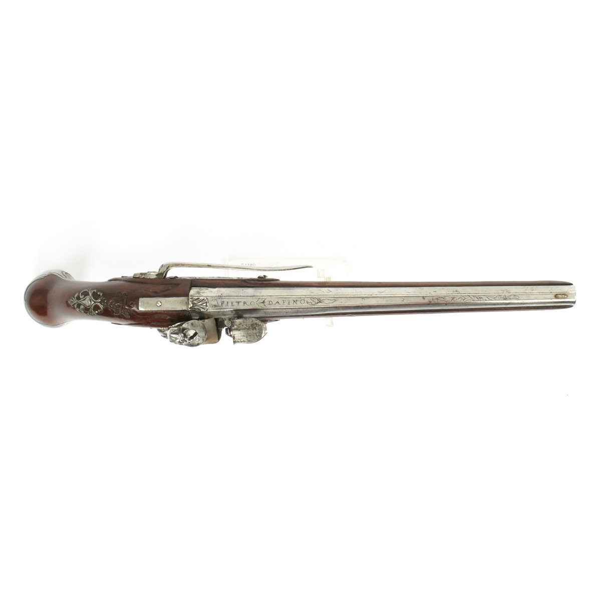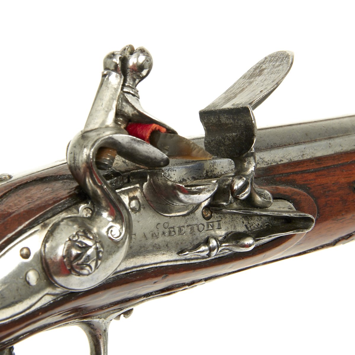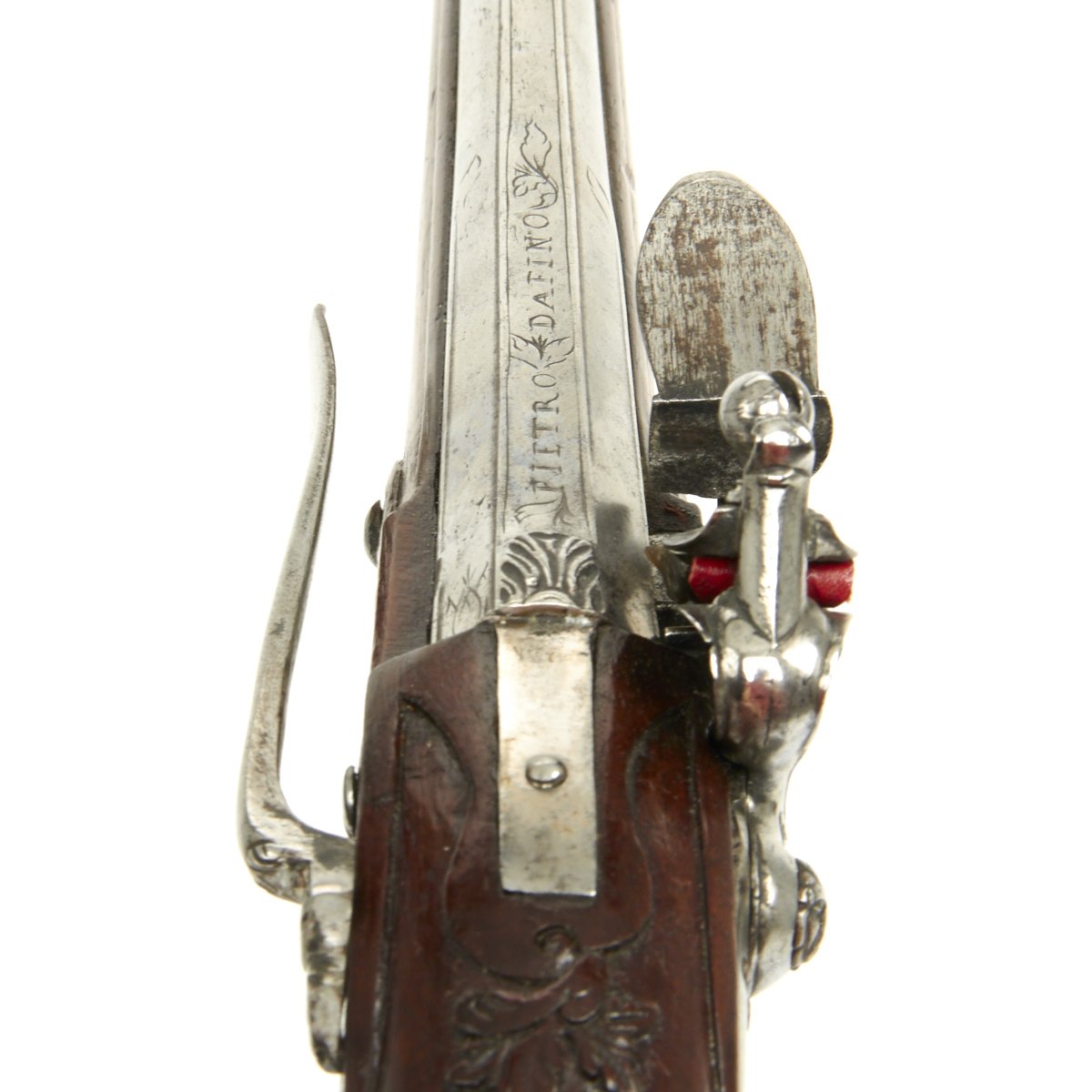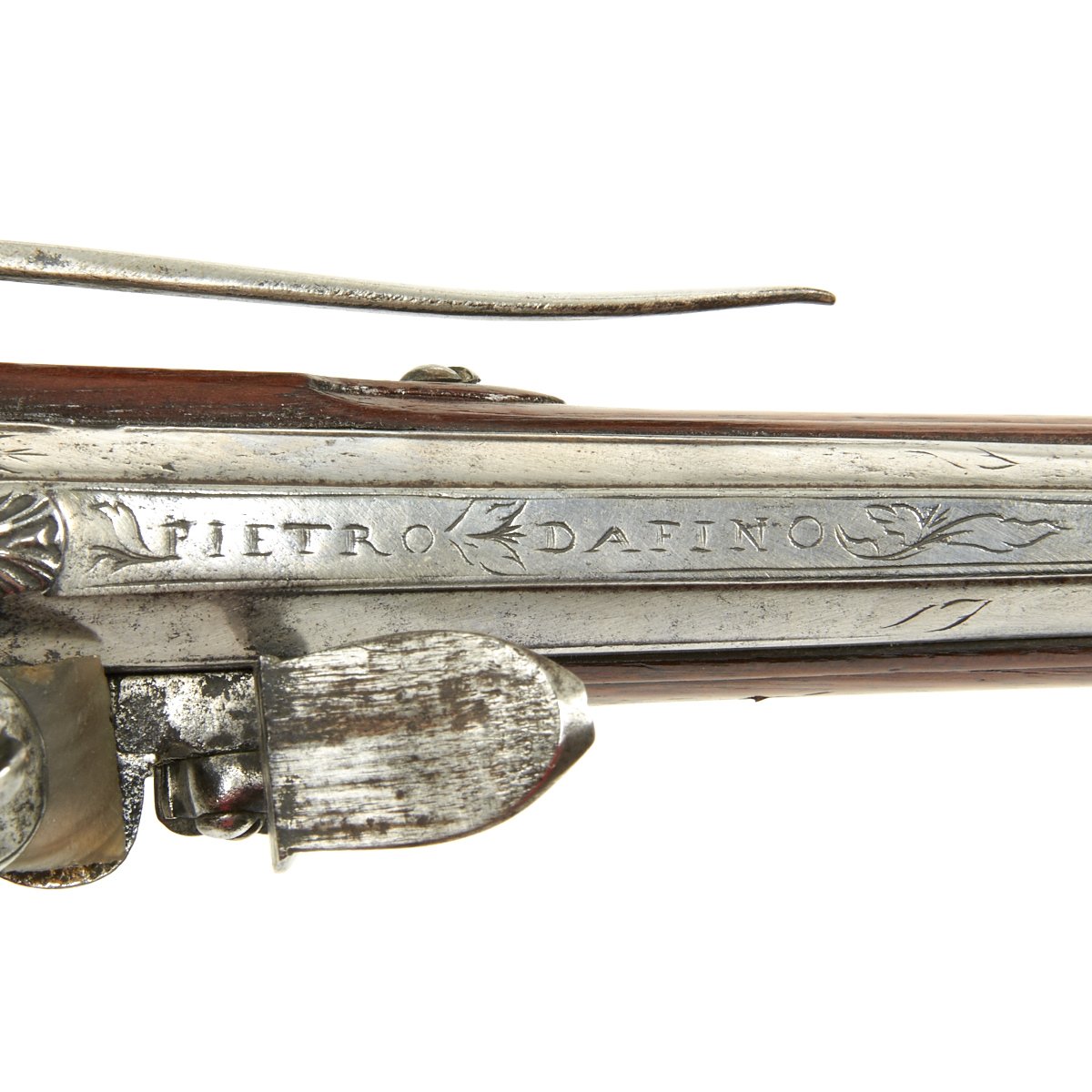 Not unusually the barrels are signed by the Barrel Maker PIETRO DAFINO and the locks by the Lock Maker FRANCO BETONI, both recorded Brescian Gunsmiths of the period.(See DER NEUE STØCKEL by Eugene Heer). Such was the degree of specialization in the Brescian firearms trade of the time.