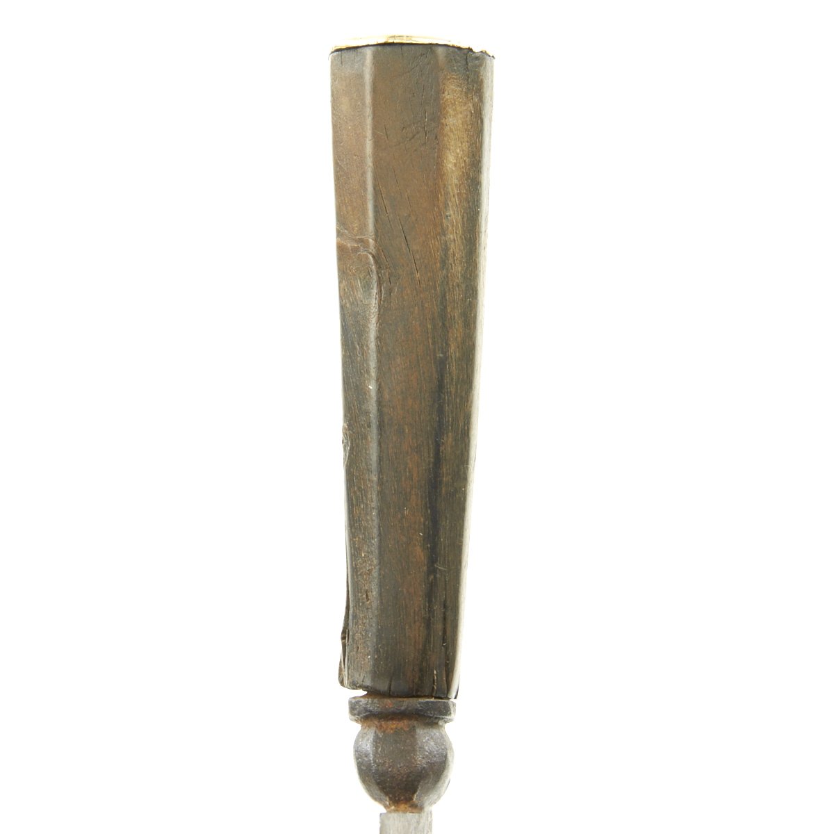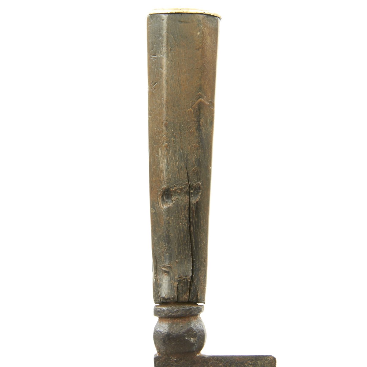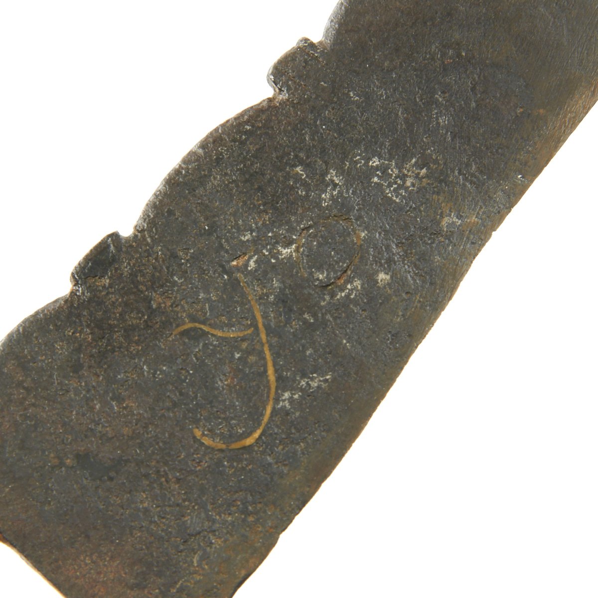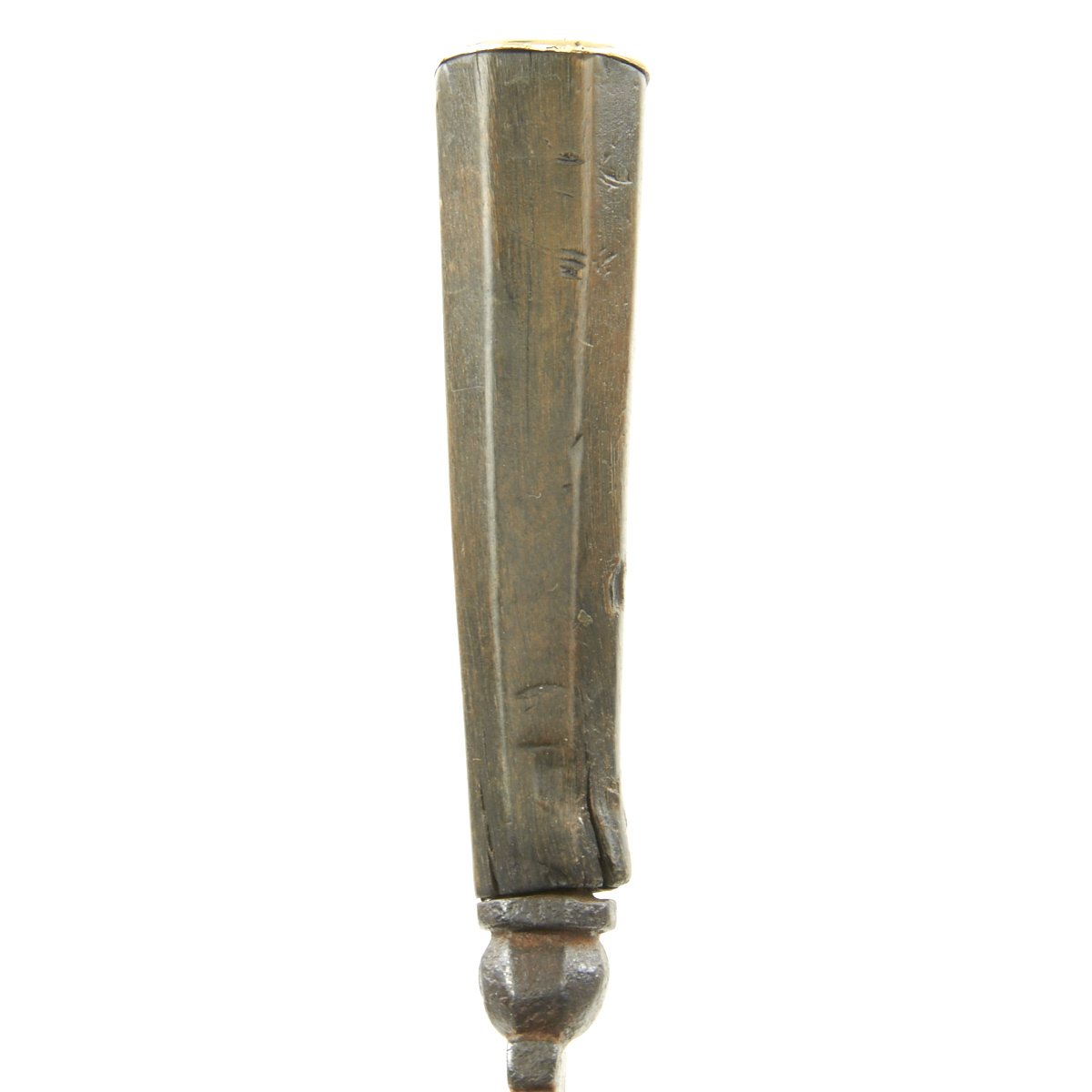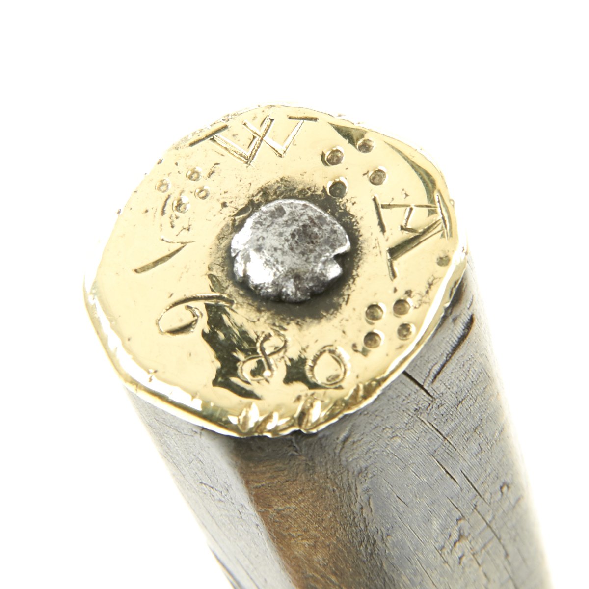 With an interesting blade, triangular in outline, the spine has been decoratively sculpted and there is a trace of what is probably brass inlay on one side of the blade. The hilt is a hexagonal tapering wood in cross section fitted with a brass washer style pommel disk. This brass disk , secured to the iron tang of the blade in engraved:- W. A. / 1680.
