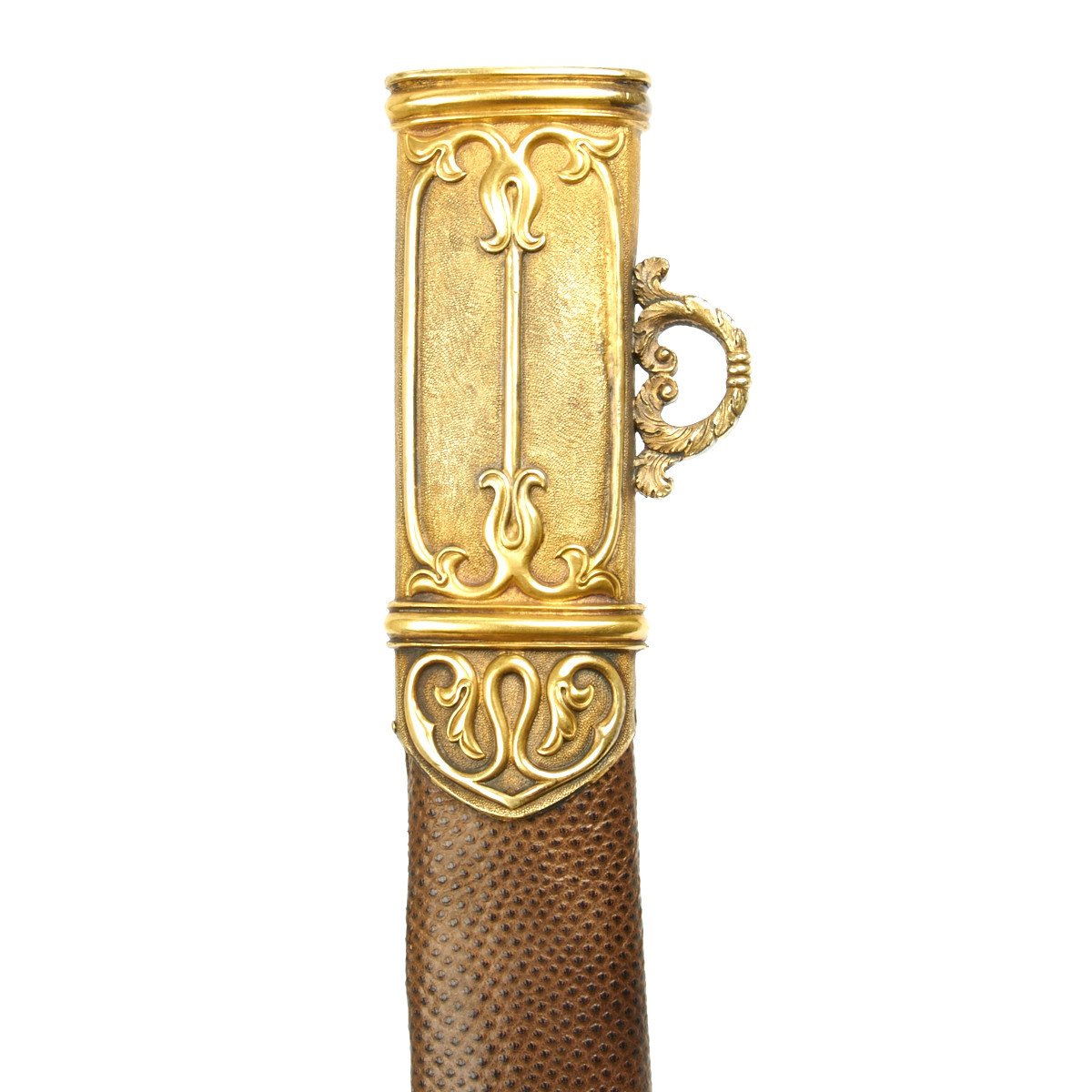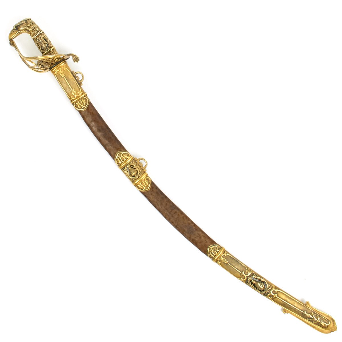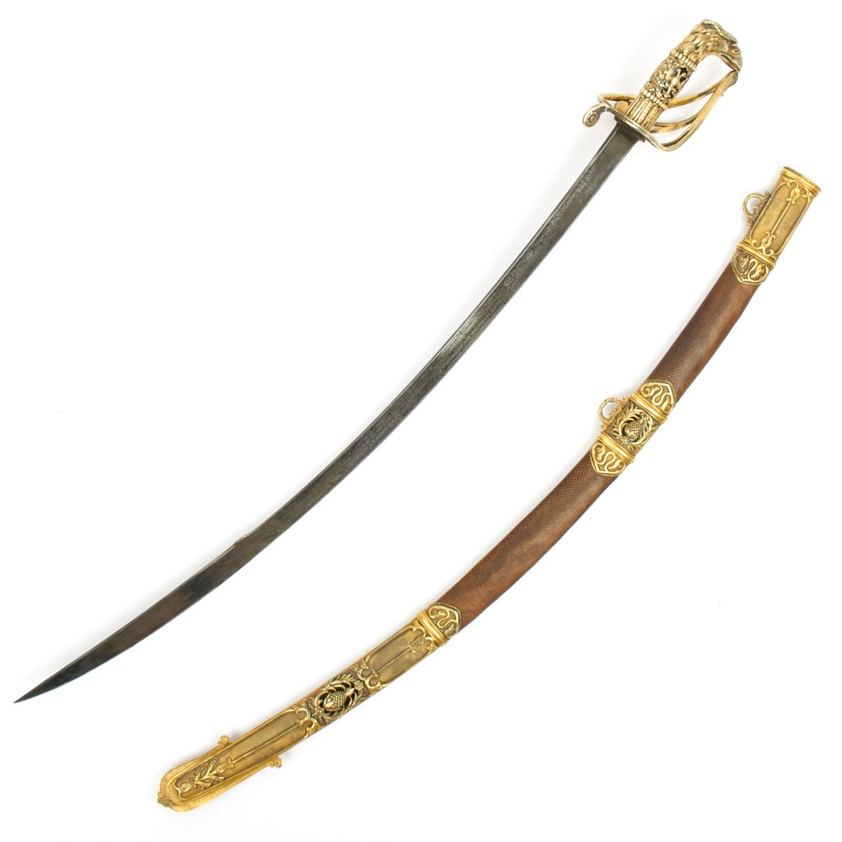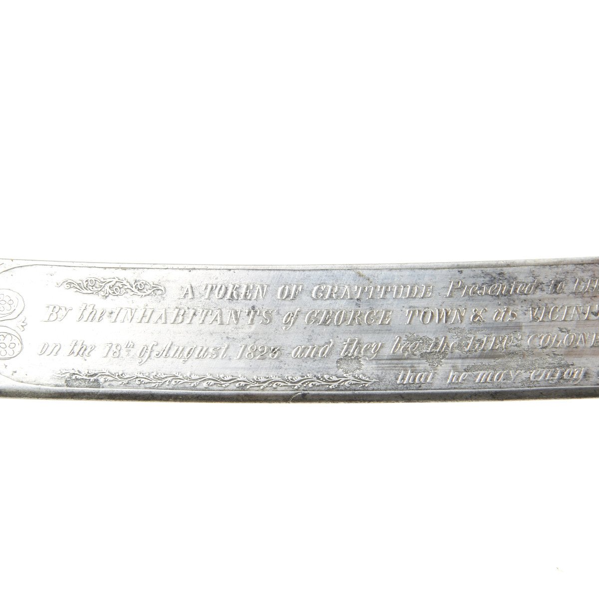 This beautiful sword is one of the most elaborate and beautiful British swords we have ever seen. The mounts are, in their beauty, equal to, or better, than a Lloyds Patriotic Fund sword. The hilt and scabbard mountings are in fact superior, in that Lloyds swords were bronze gilt, but for this sword they are SILVER gilt. The fully etched presentation inscription is most detailed, in that it relates most profusely to the Colonel who was not only at the time the Commandant of the George Town and Colony Brigade of Militia, he was also the Colony's Vendue-Master.