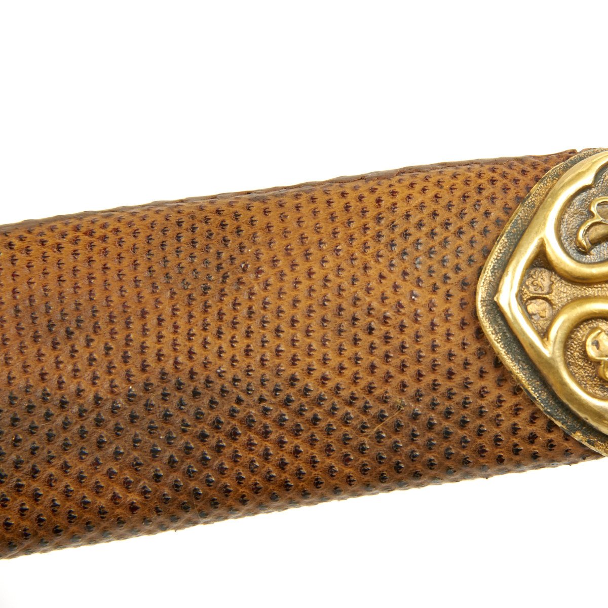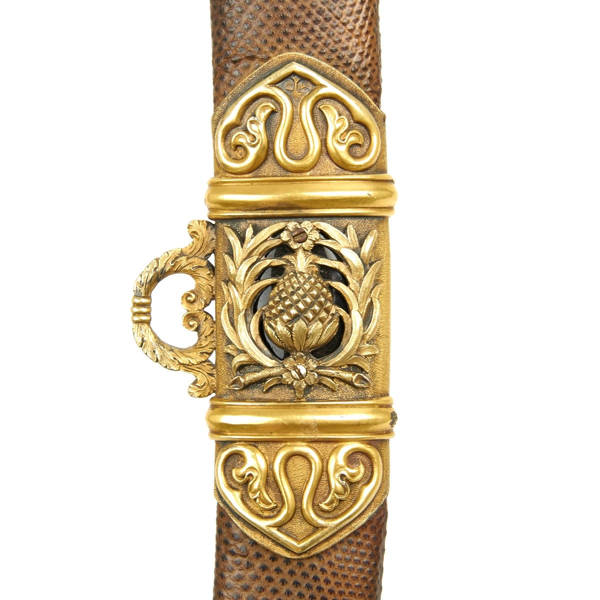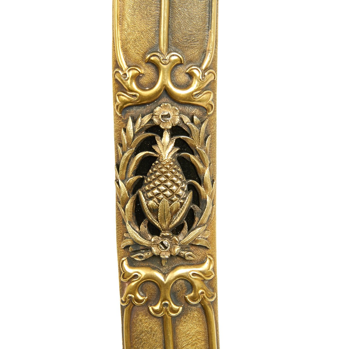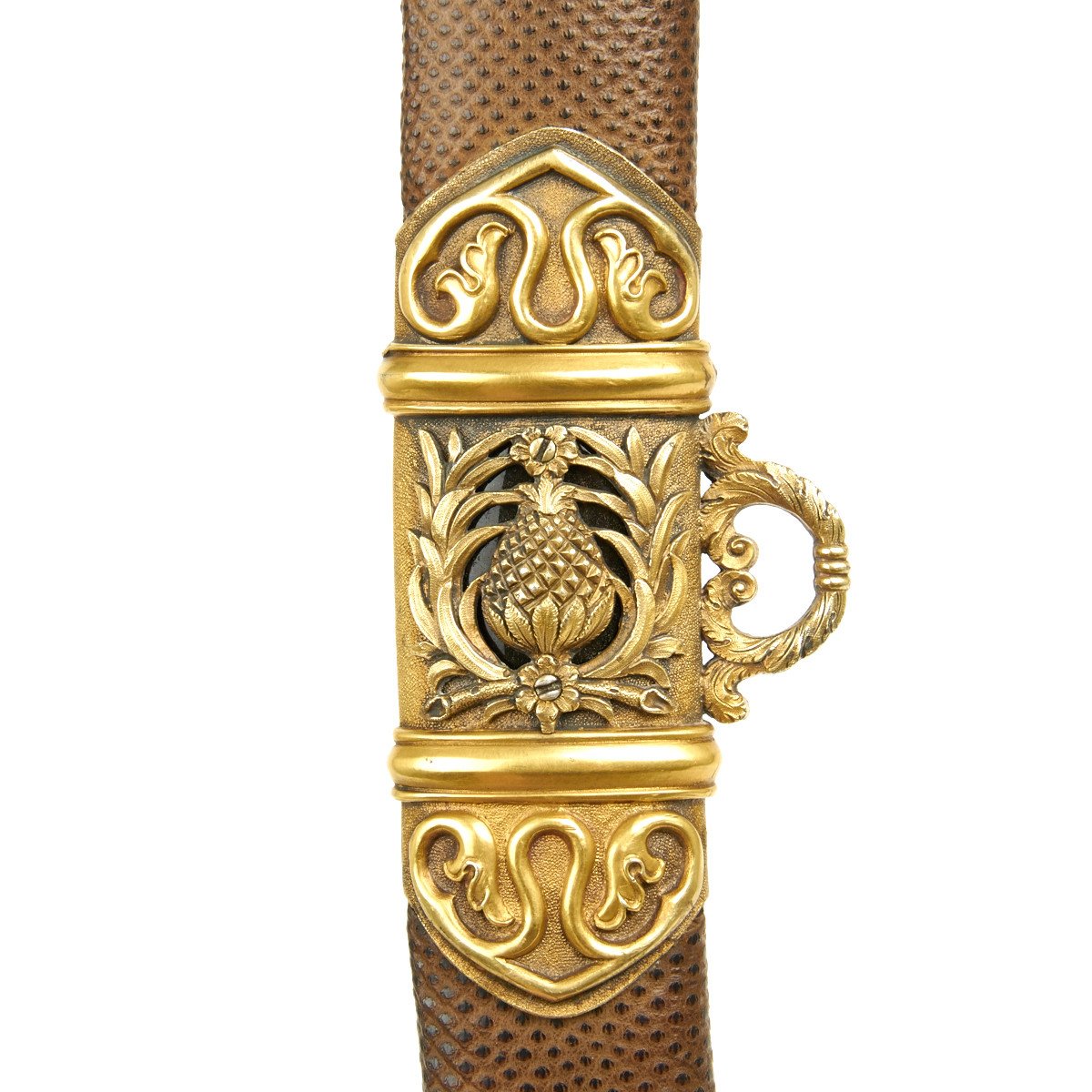 When received the original scabbard covering had been replaced with blue velvet because of the massive deterioration of the original material. This has now been painstakingly returned to the correct original presentation state with the scabbard being lined in snake skin. The scabbard mounts are sterling silver mercury gilded, each individual mounting bearing a hall mark. Each mount bears the pineapple symbol of the colony inlaid with a dark blue enamel backing. Hallmarks are also present on the cross guard and other locations.