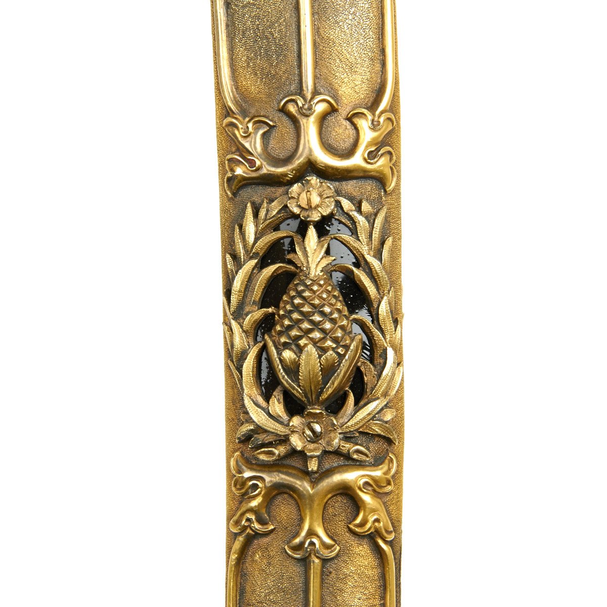 This delightful sword bears an eagle head pommel with blue enamel plaques surrounded by pineapple cartouches and a column for grip. The scabbard mounts are matching in their highly detailed form with pineapple embellishments over blue enamel plaques. The blade is stunningly etched with the Colony's crest and the presentation inscription: