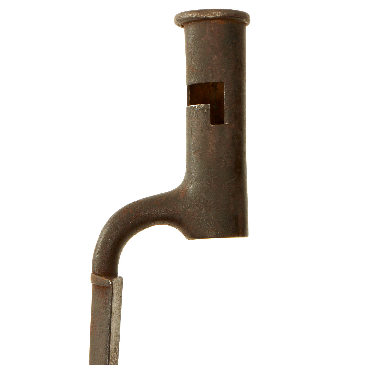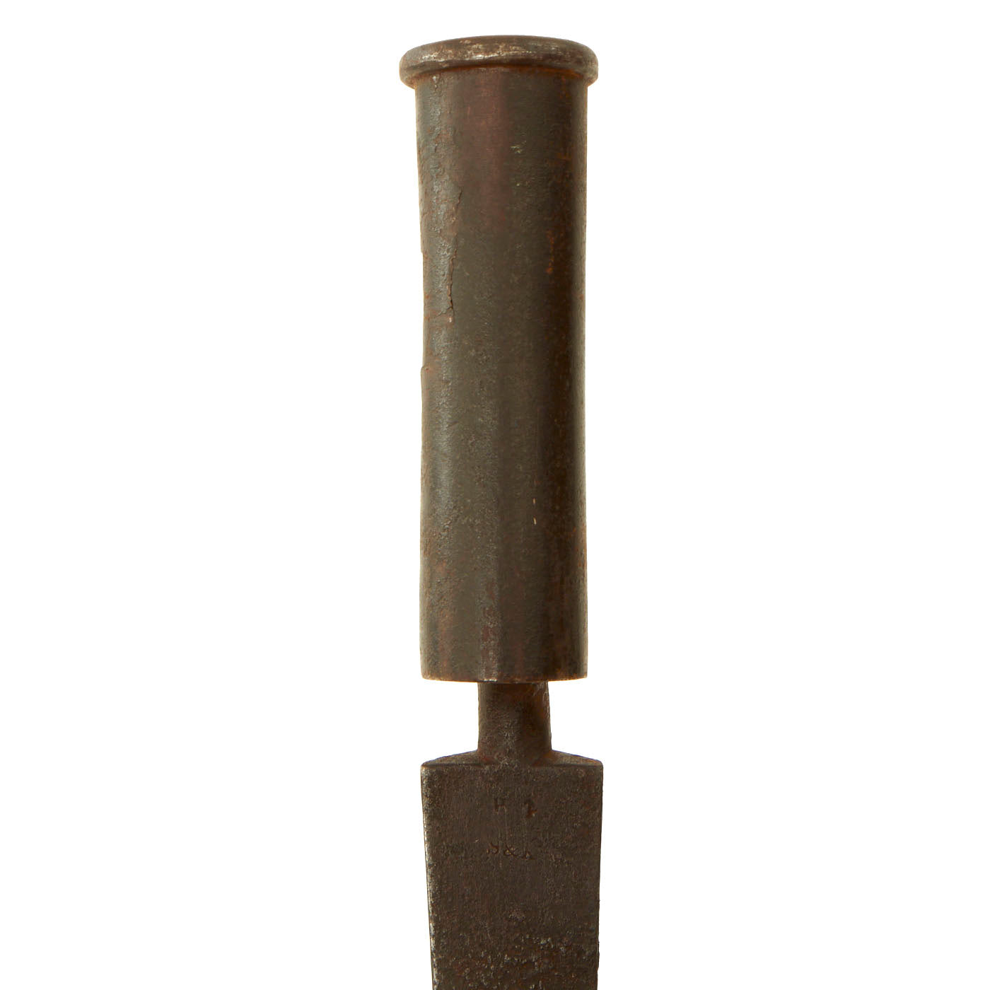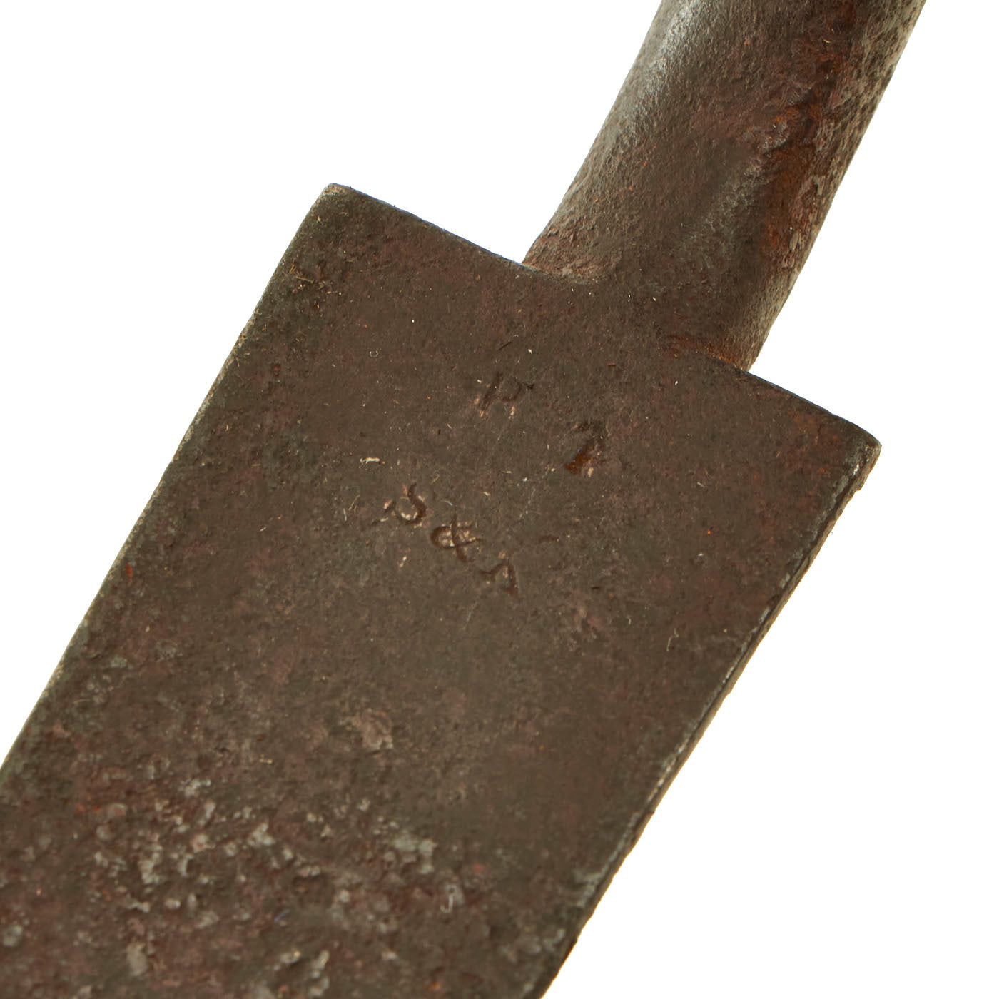 This example is of the Pattern 1727, and likely dates from the late 18th Century. Distinguishing characteristics include: a wide blade, with a concave face and prominent circular guard. Elbow is flush with the socket front and extends well-forward of the socket. There are multiple markings on the “ricasso” area of the blade and appears to be P.P. / S.K. The first marking is rather faint and partially incomplete making it difficult to identify the manufacturer.