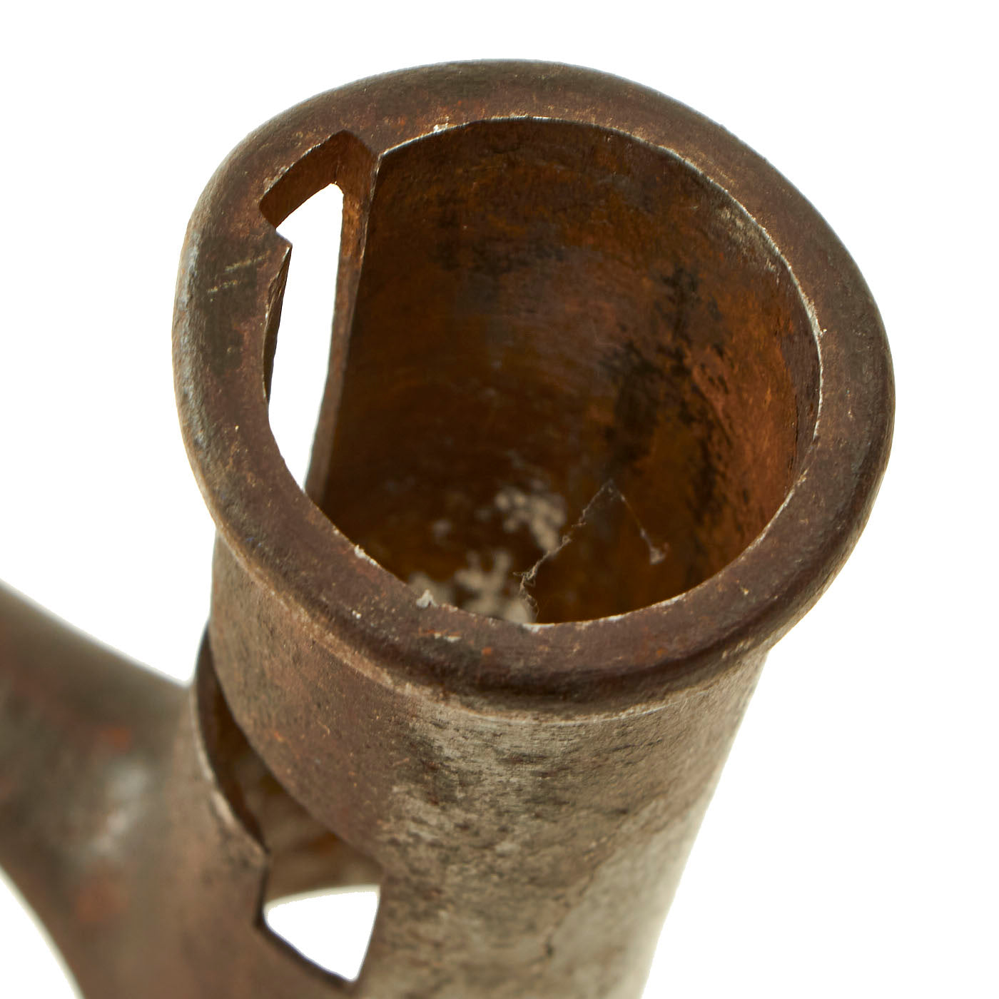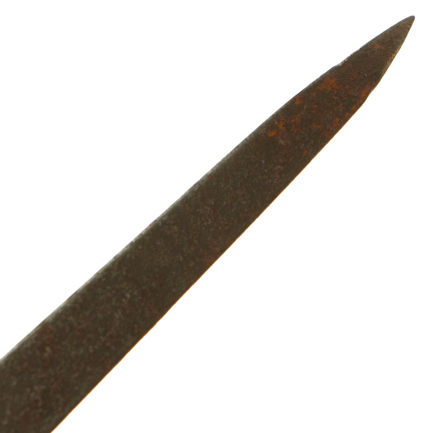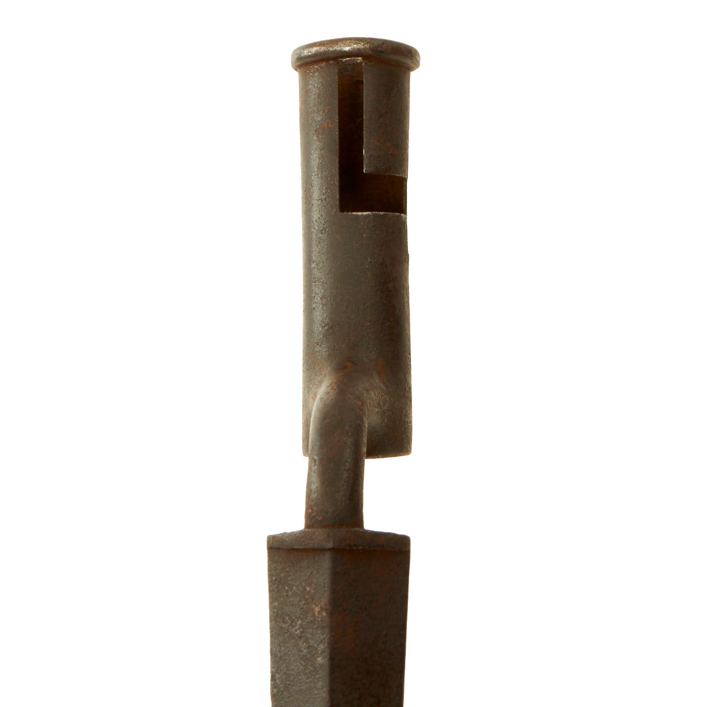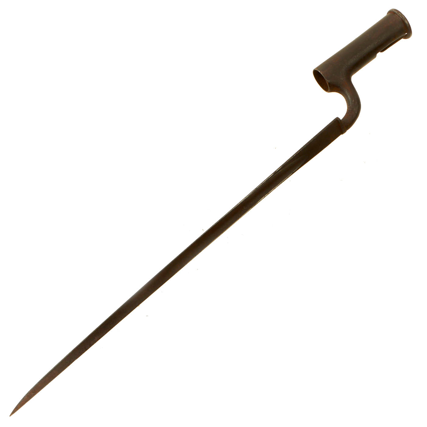 This example is of the Pattern 1727, and likely dates from the late 18th Century. Distinguishing characteristics include: a wide blade, with a concave face and prominent circular guard. Elbow is flush with the socket front and extends well-forward of the socket. There are multiple markings on the “ricasso” area of the blade and appears to be P.P. / S.K. The first marking is rather faint and partially incomplete making it difficult to identify the manufacturer.