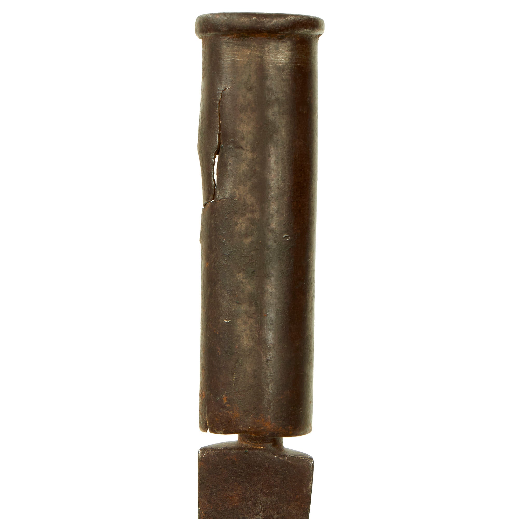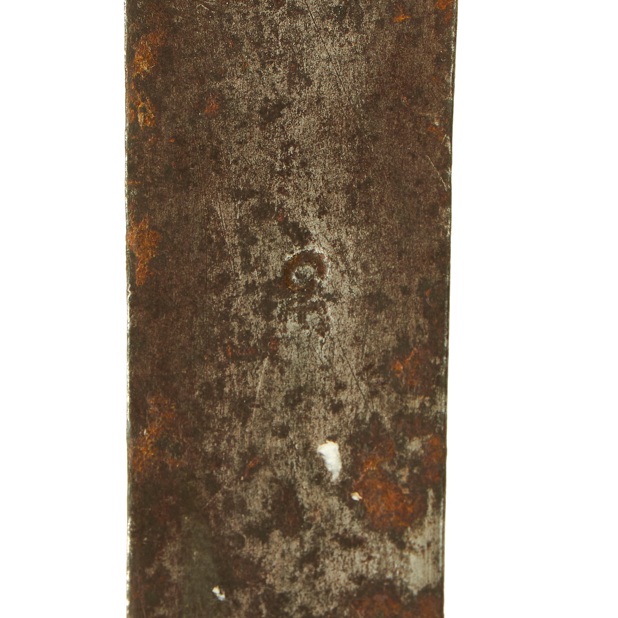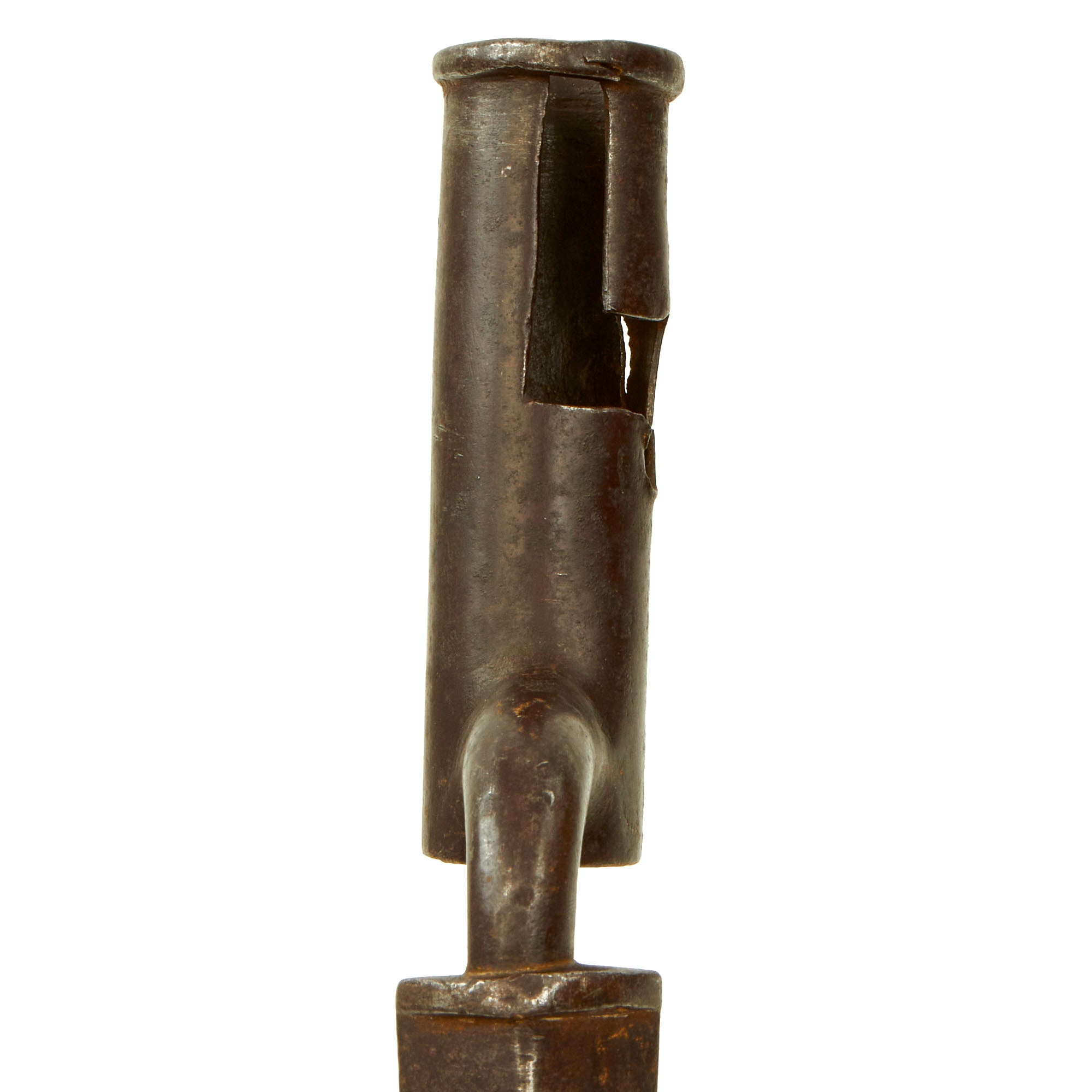 This example is of the Pattern 1727, and likely dates from the late 18th Century. Distinguishing characteristics include: a wide blade, with a concave face and prominent circular guard. Elbow is flush with the socket front and extends well-forward of the socket. There are multiple markings on the “ricasso” area of the blade and appears to be Crown over 5. The first marking is rather faint and partially incomplete making it difficult to identify the manufacturer.