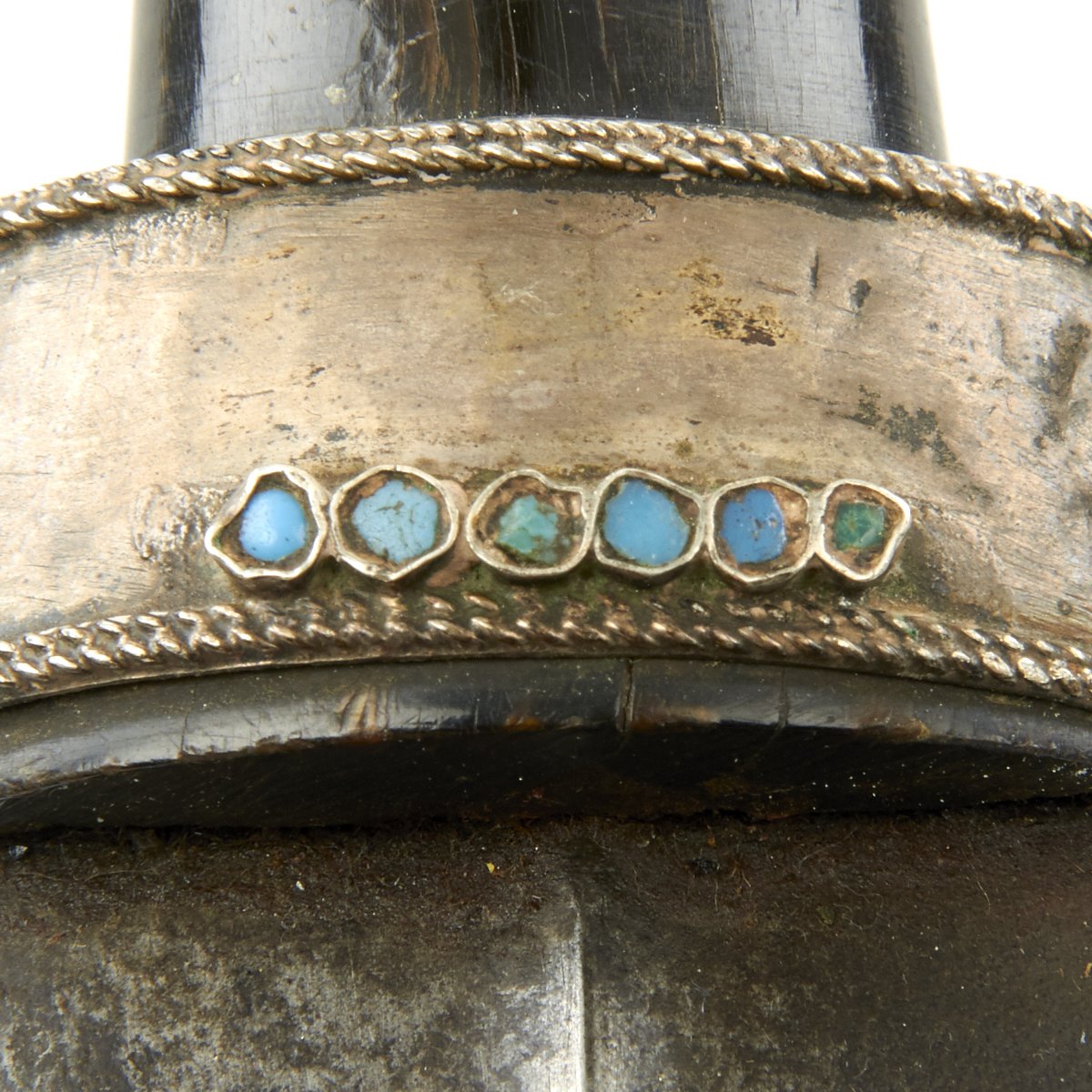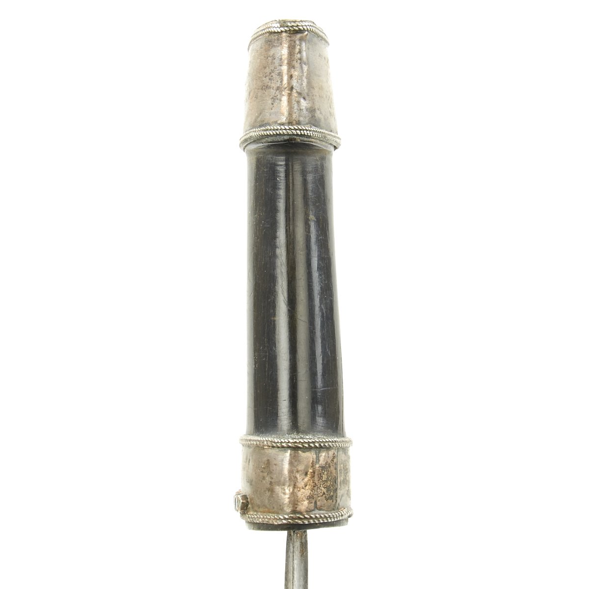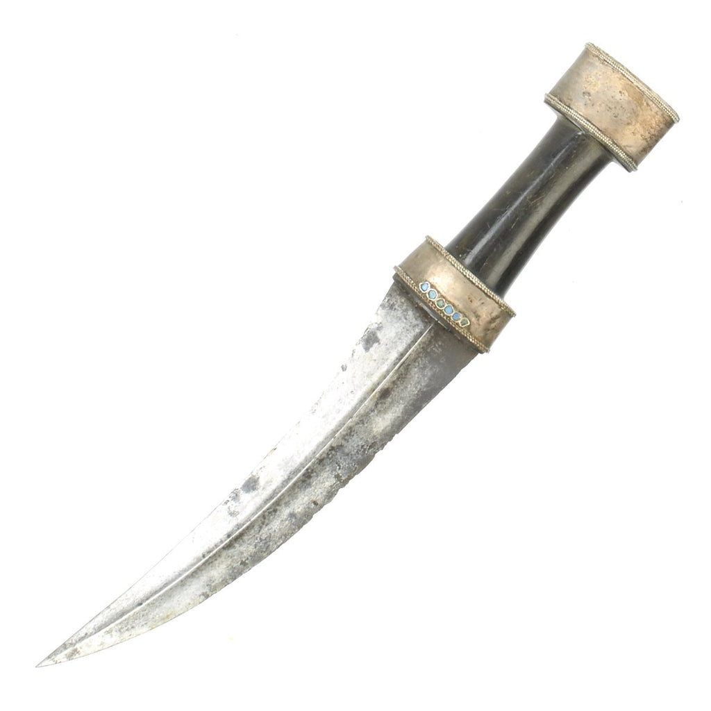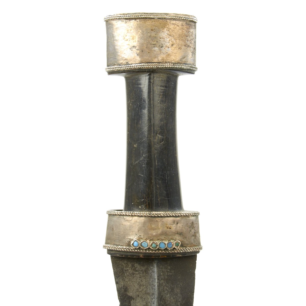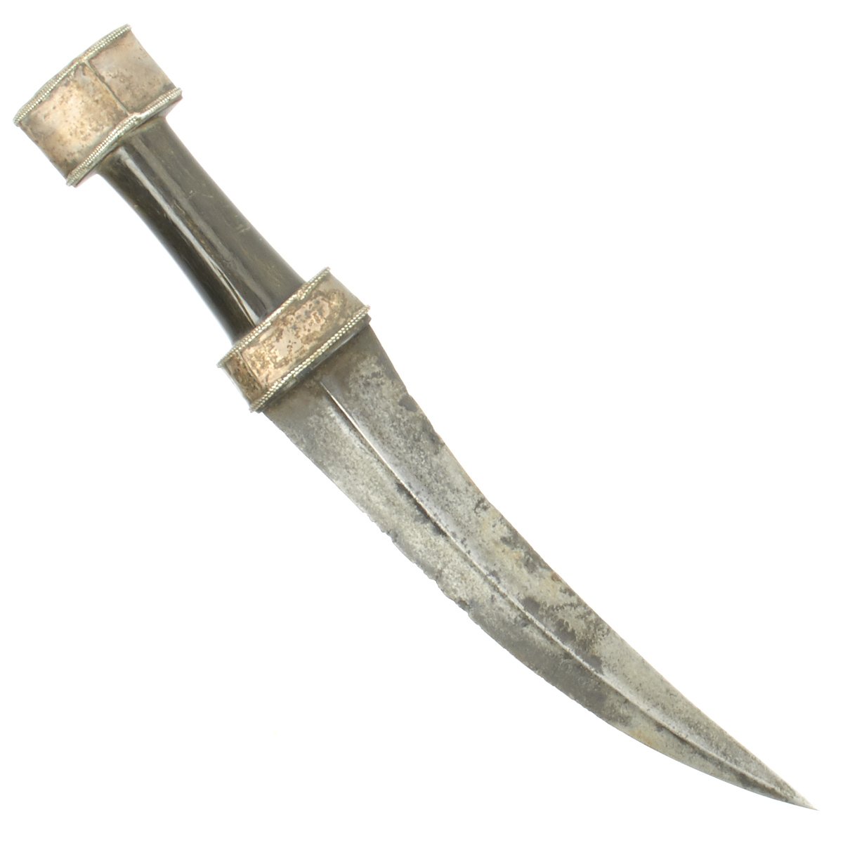 This example, which shows great age and use, no longer has its scabbard. Most likely it was displayed "out of scabbard" and therefore became separated. The curved blade with central raised rib is over 8 1/2" in length and is 13 1/2" in length overall. The Hilt is horn and decorated with silver mounts to top and bottom and some Coral stones set in on the cross guard. The horn of the grip I rather think is Rhino Horn, highly prized at the time and unattainable today.