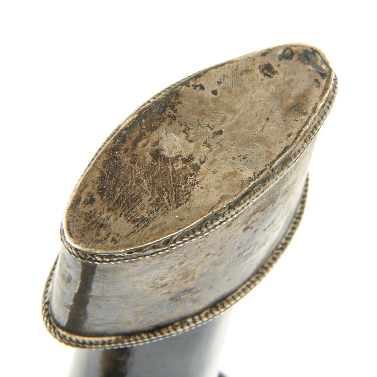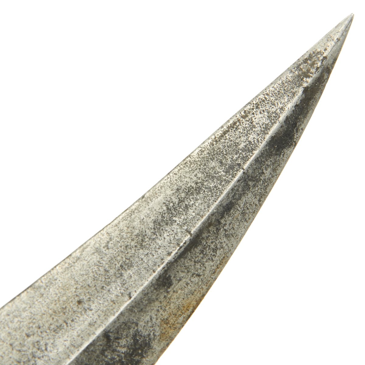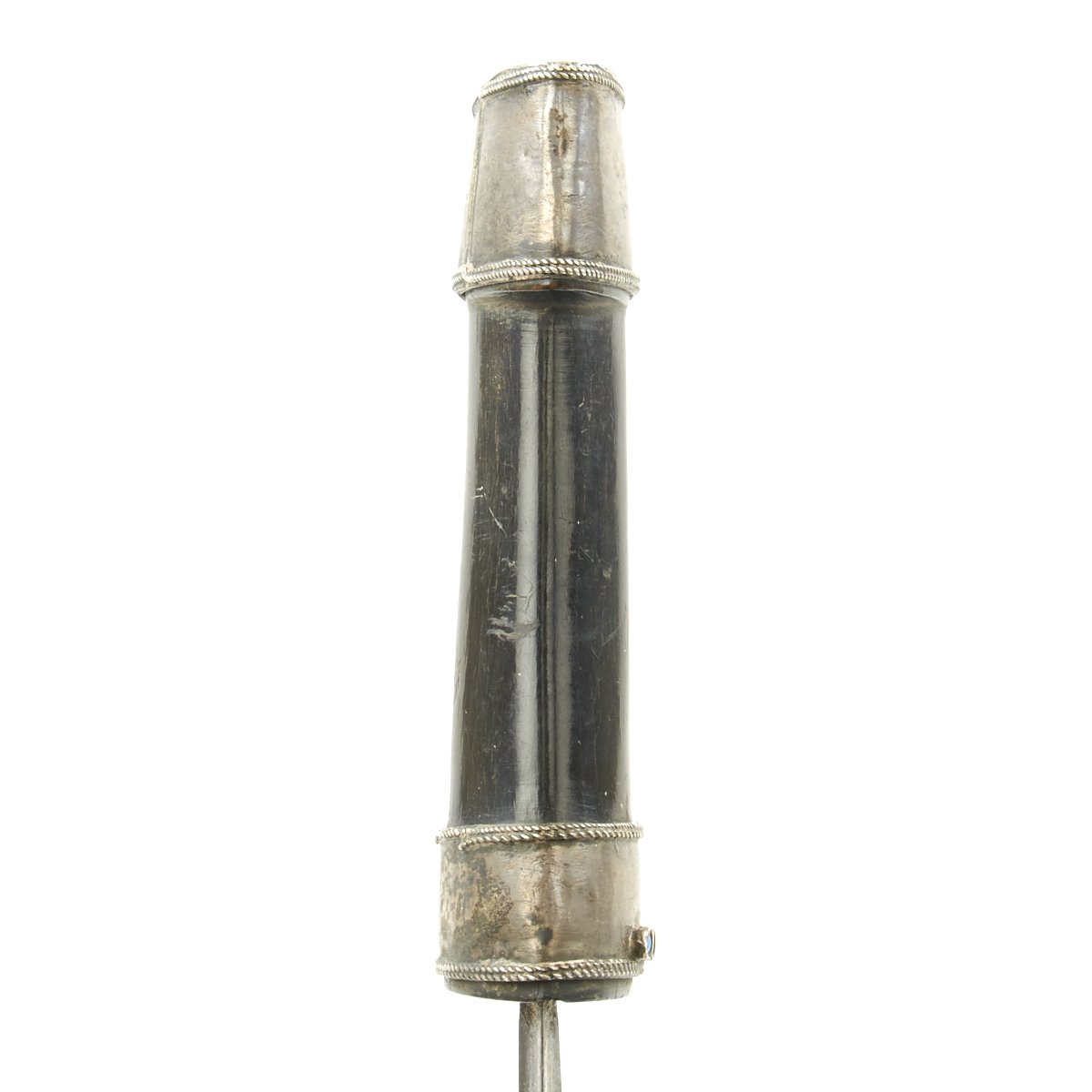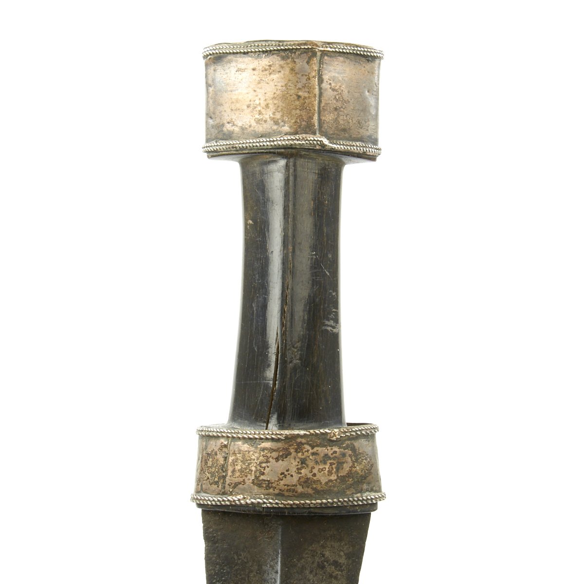 This example, which shows great age and use, no longer has its scabbard. Most likely it was displayed "out of scabbard" and therefore became separated. The curved blade with central raised rib is over 8 1/2" in length and is 13 1/2" in length overall. The Hilt is horn and decorated with silver mounts to top and bottom and some Coral stones set in on the cross guard. The horn of the grip I rather think is Rhino Horn, highly prized at the time and unattainable today.