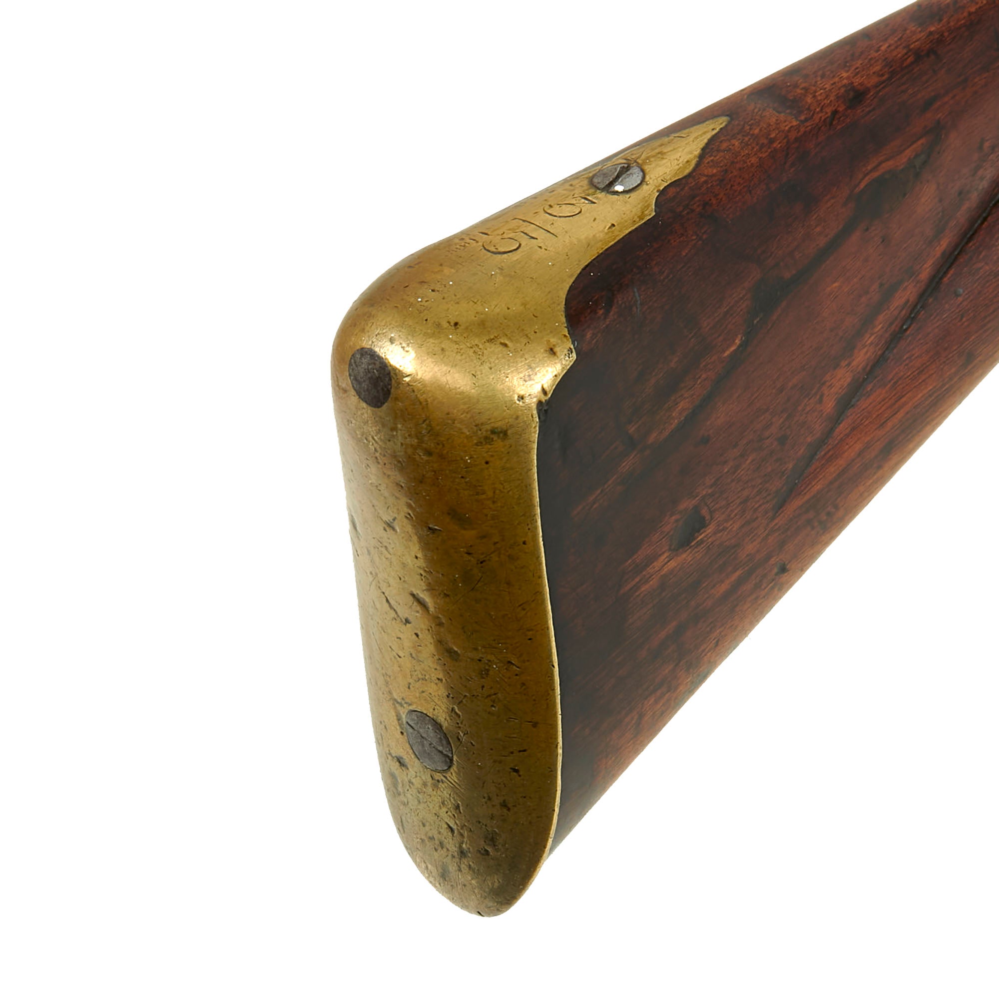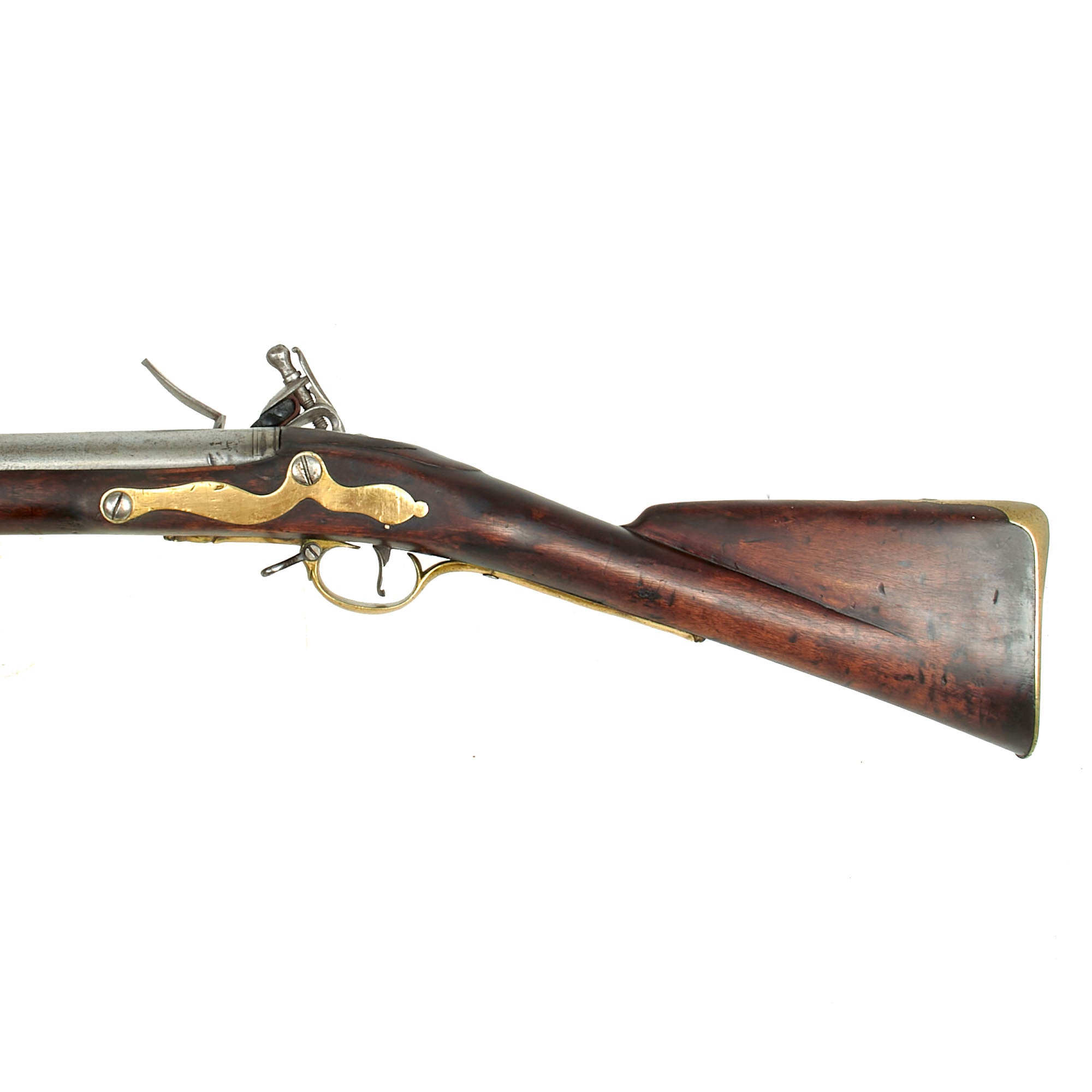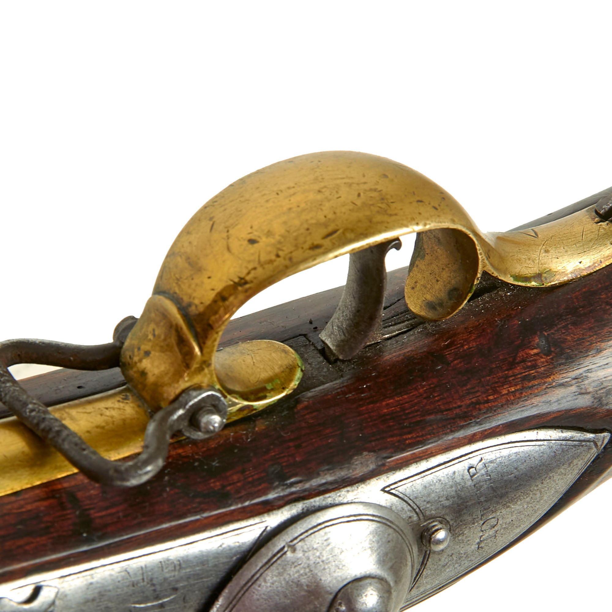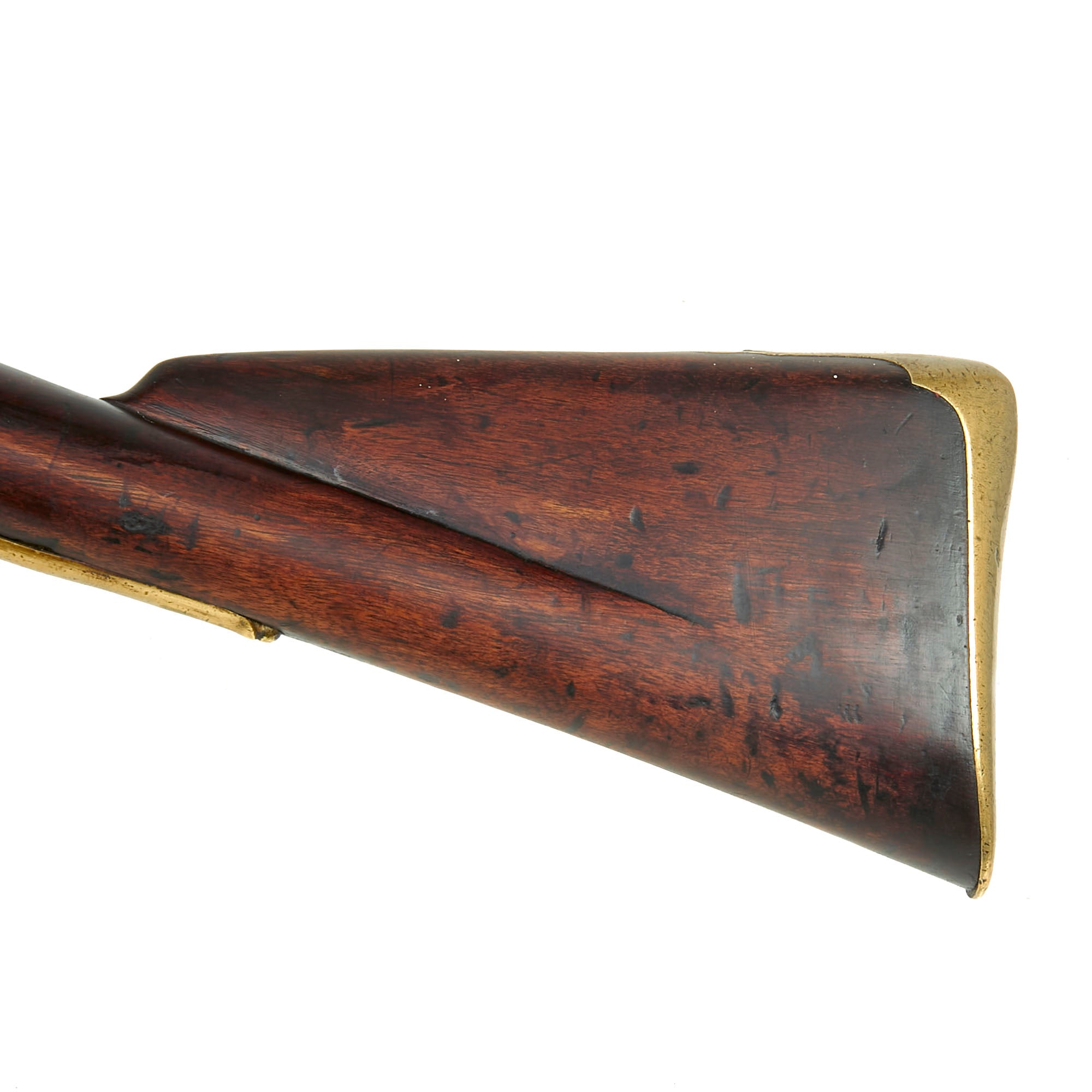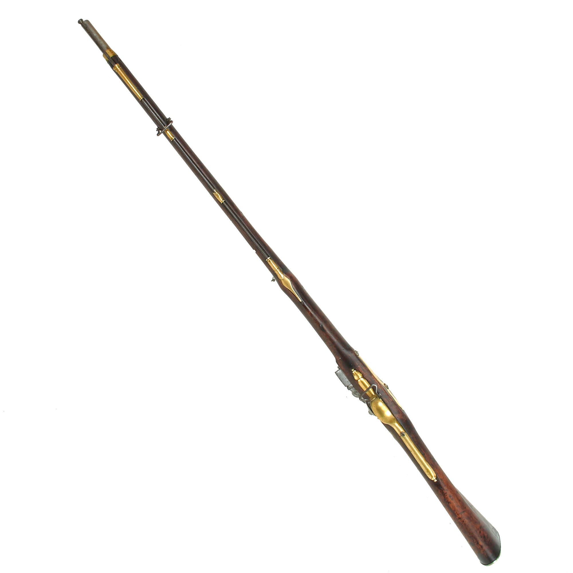This example is lovely, still retaining its original regulation brass fittings in great condition. The stock has a lovely dark brown color, showing wear and stress cracks from being over 250 of age. We do not however see any major damage or repairs. Due to wear the carved "outlines" around the barrel tang, lock, and side plate are definitely reduced, but still evident if you know what to look for. Both sling swivels are still present, and the original ramrod is in very good condition.