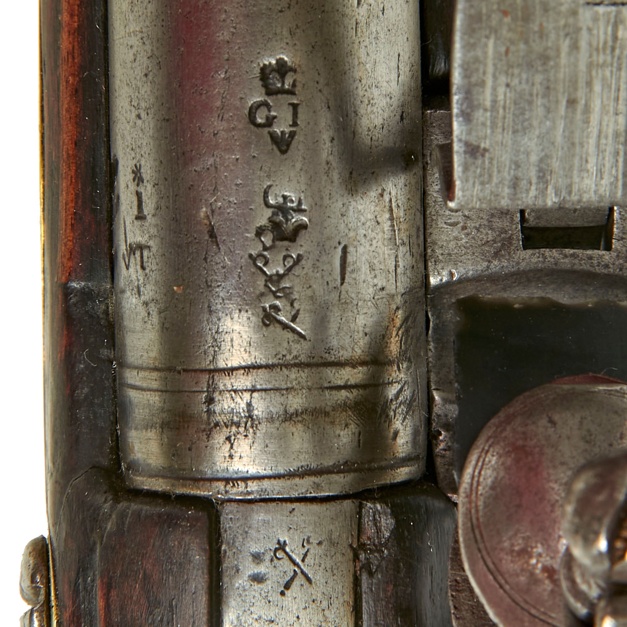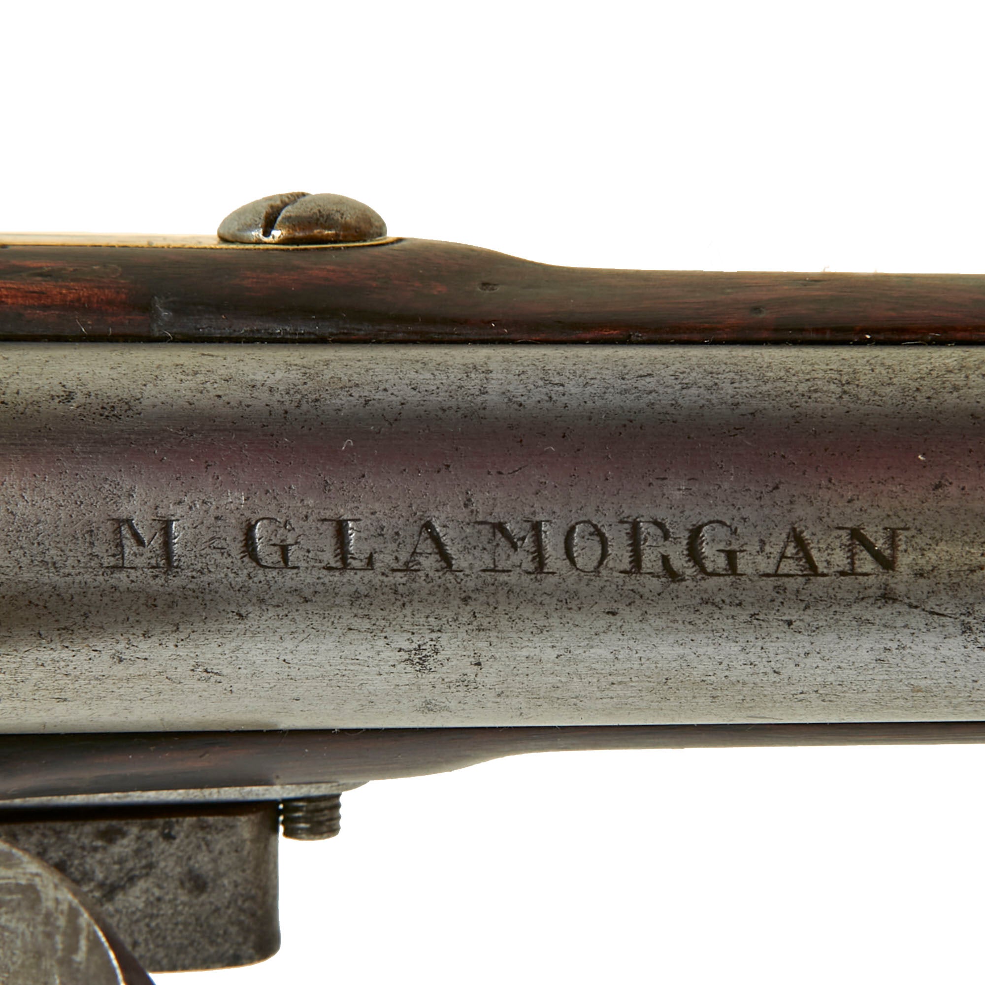 The barrel is in lovely condition, showing a nice bright patina, showing only light wear. There does not appear to be much powder burn near the touch hole, so we do not believe that the musket was fired much. The top of the barrel shows what looks to be a CROWN / GR marking over a CROWN / CROSSED SCEPTERS marking, indicating Pre-1813 military inspection at the Ordnance Proof house on Tower Wharf close to the Tower of London. There are additional markings, some overlapping, including additional "Crossed Scepter" markings, definitely a great opportunity for further research. Just up the barrel from the proof marks is the regimental marking M: GLAMORGAN centered on the barrel, and the butt plate tang is marked 3 / 5 for the 5th arm of 3rd Company.