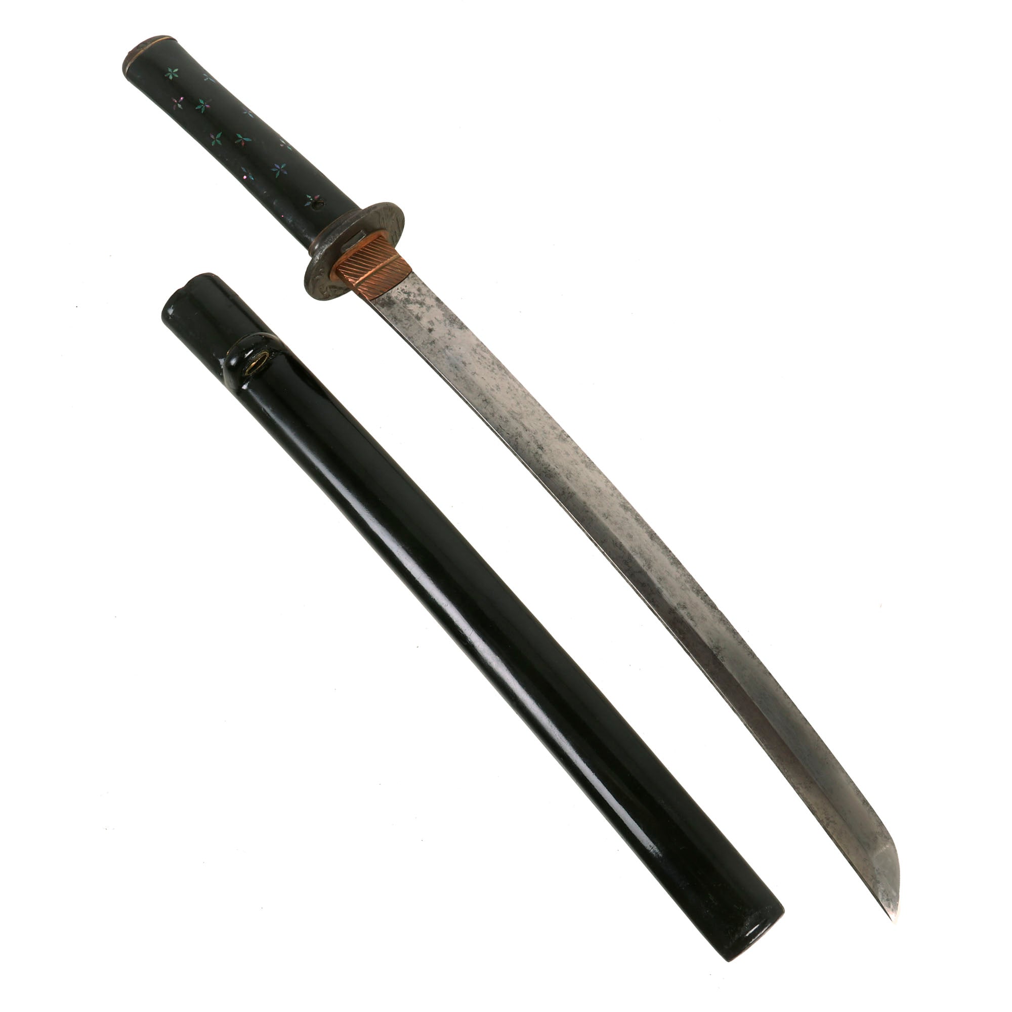 A very nice Edo Period Wakizashi complete with some lovely aged fittings and a beautiful decorative tsuba handle. Ready to research and display!