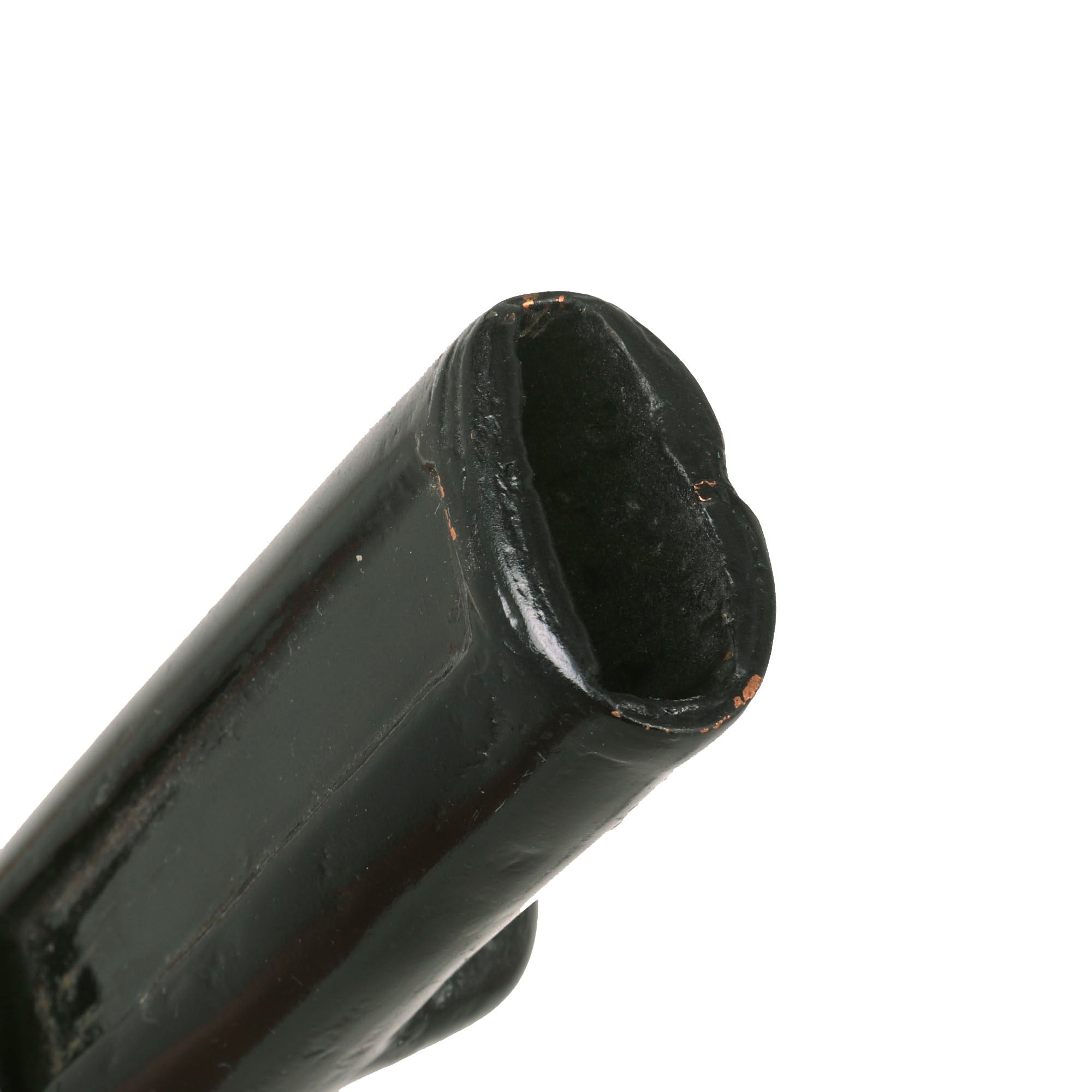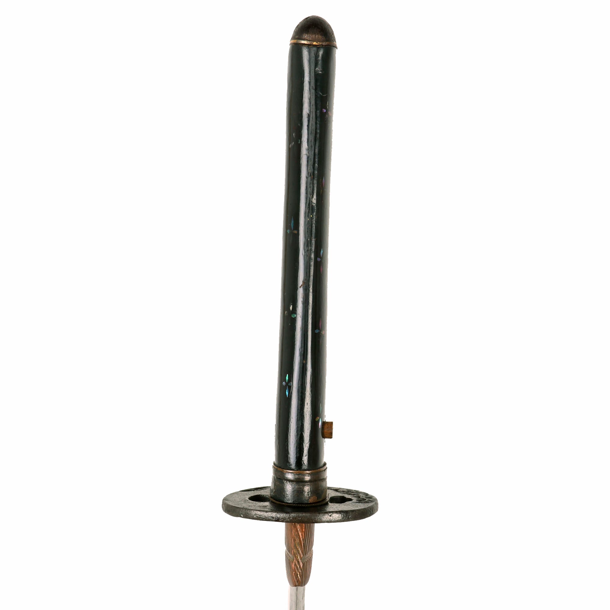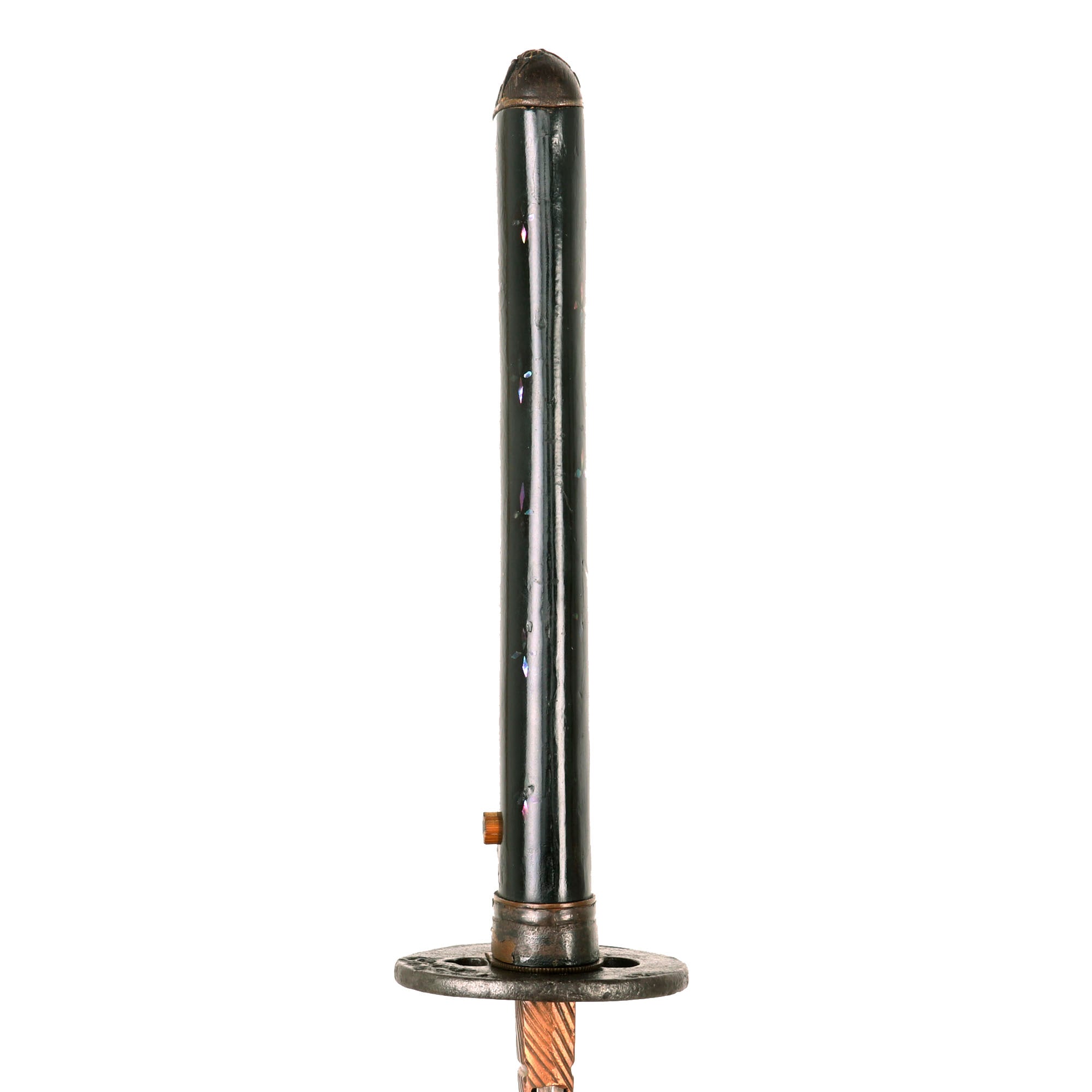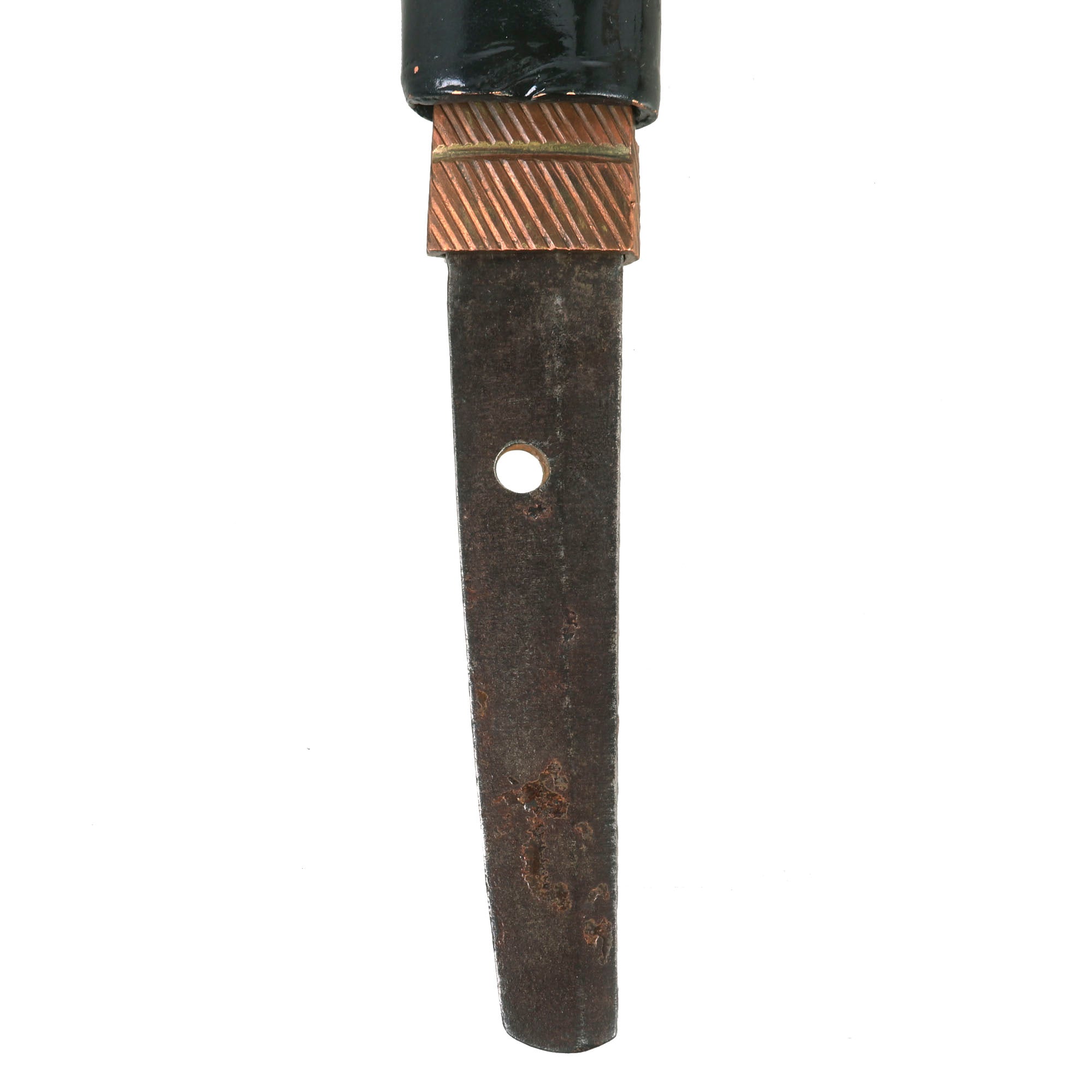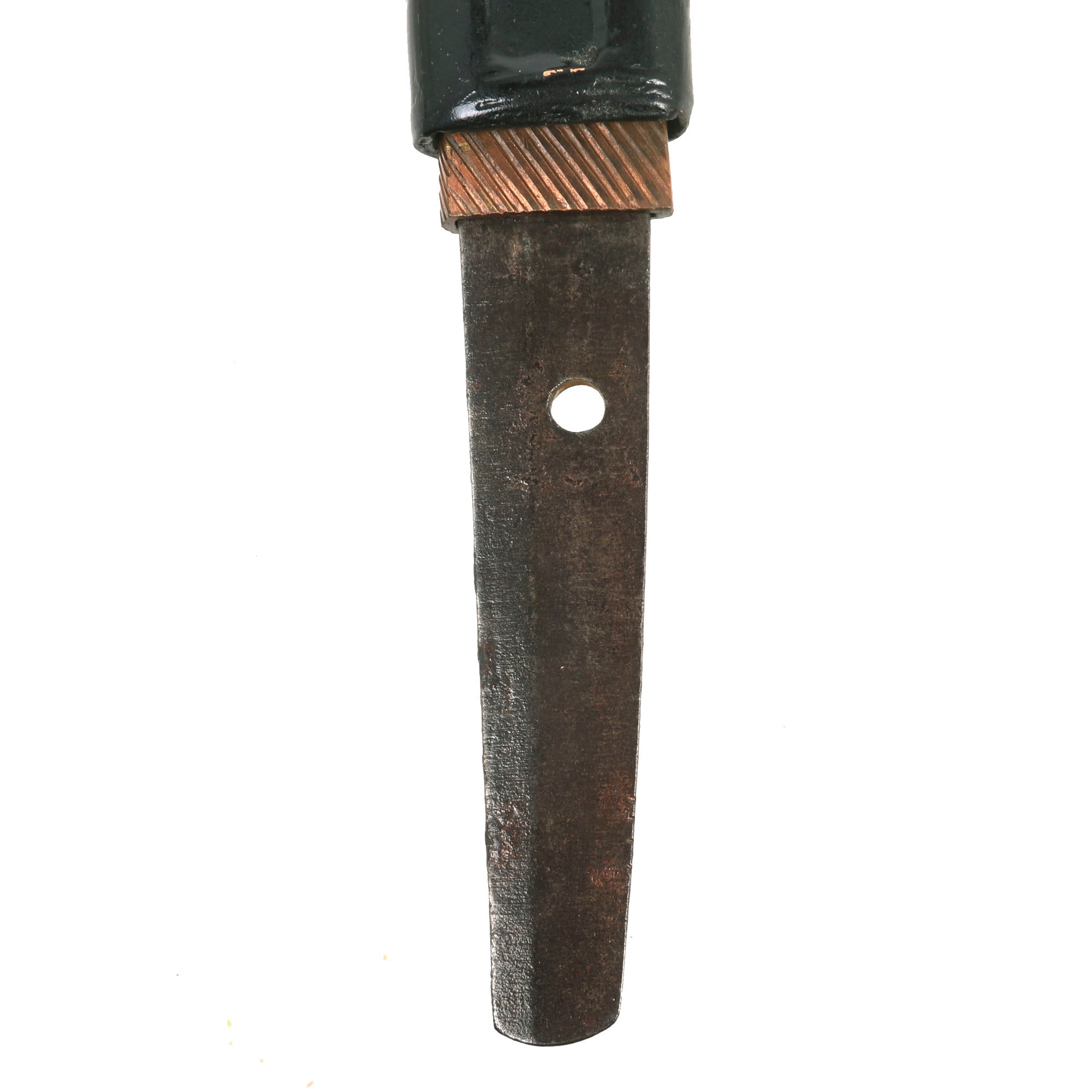 The sword comes in a a well fitting wooden scabbard (saya), which has a very nice gloss black urushi lacquer finish. This looks like it may have been touched up during the early 20th century, but the correct material was used. There are not any major cracks along the seams. The scabbard has a kurikata (knob), which is where a sageo sword cord might be kept, and there is a brass shitodome fitting inside the channel. It also has as slot on the other side for a kogatana knife, but there is not one included.